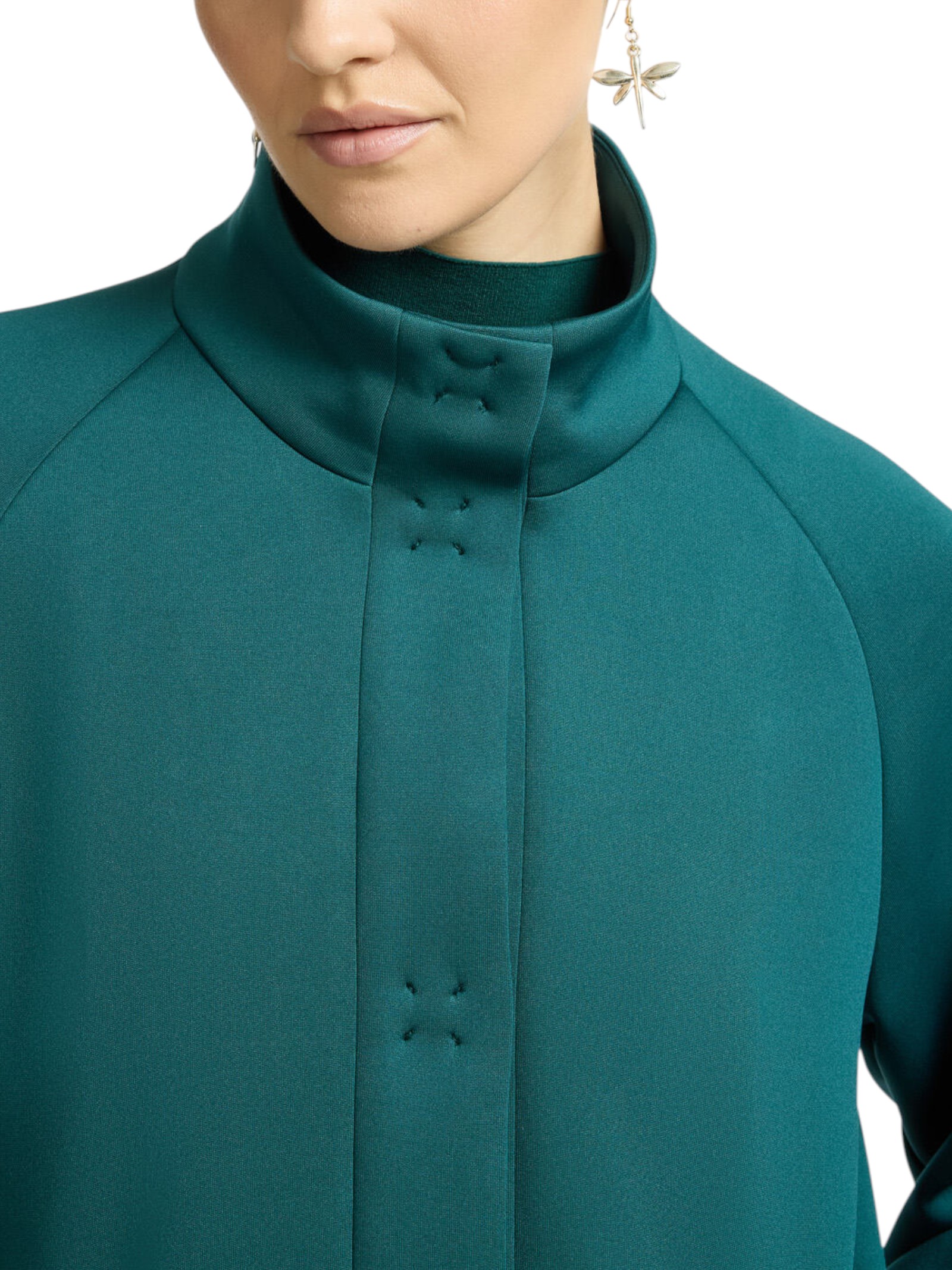 Maniche raglan e fondo arrotondato, bottoni automatici cuciti a mano