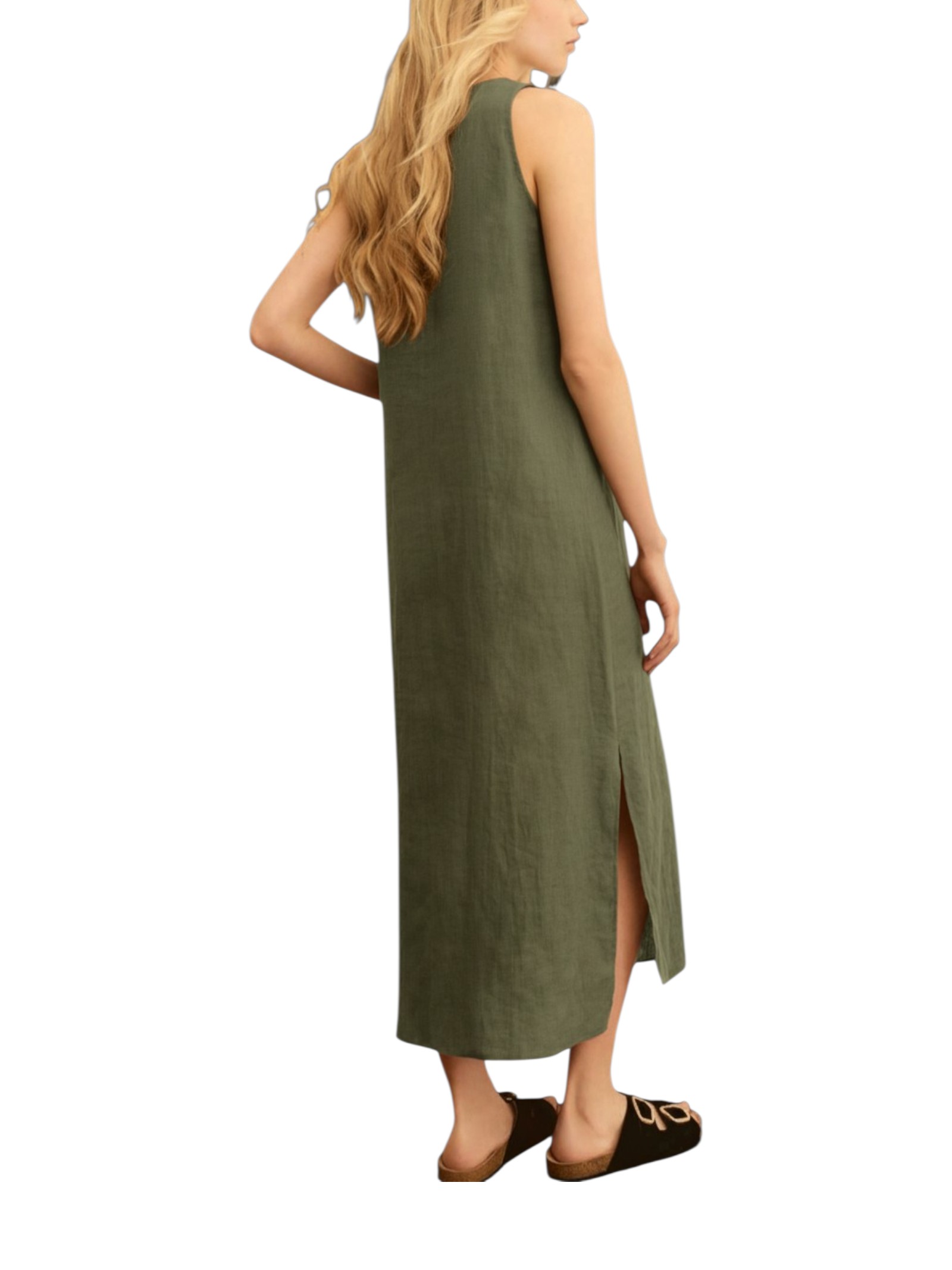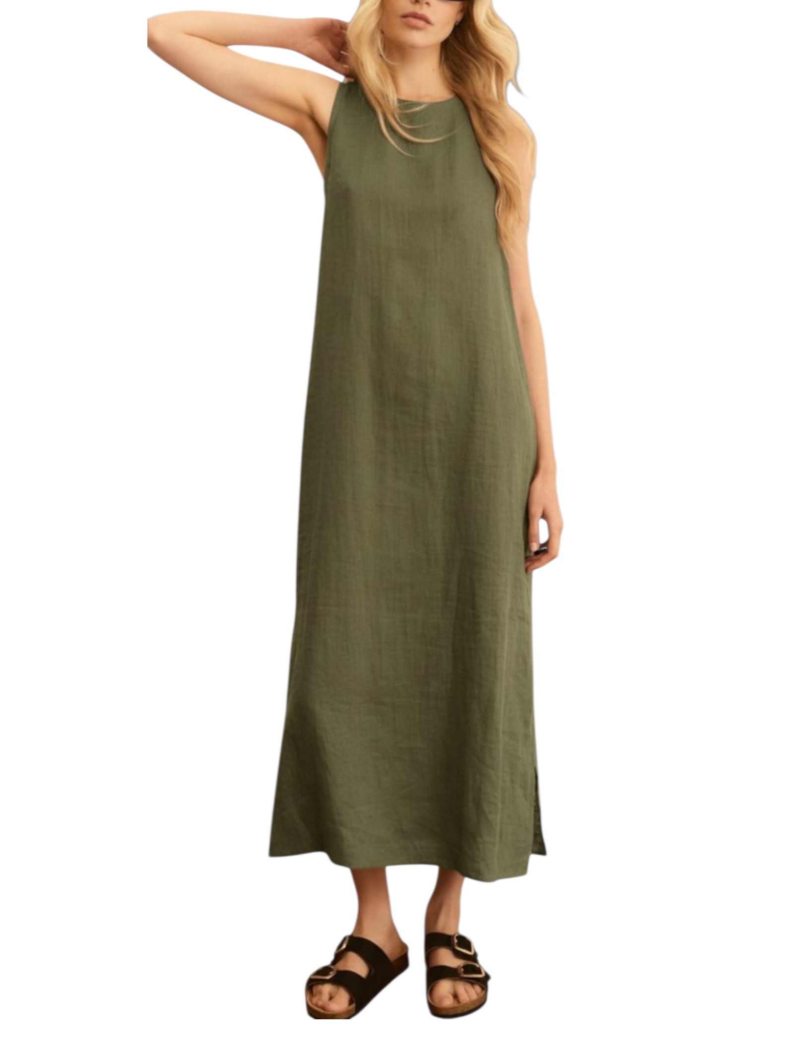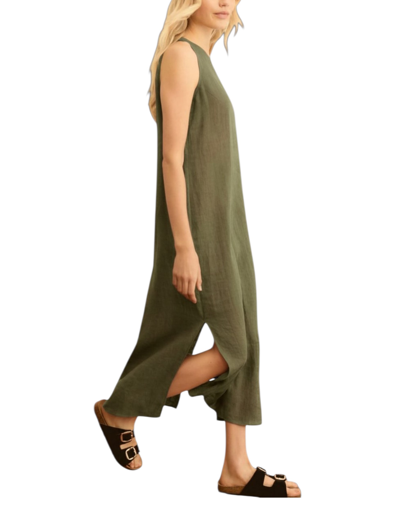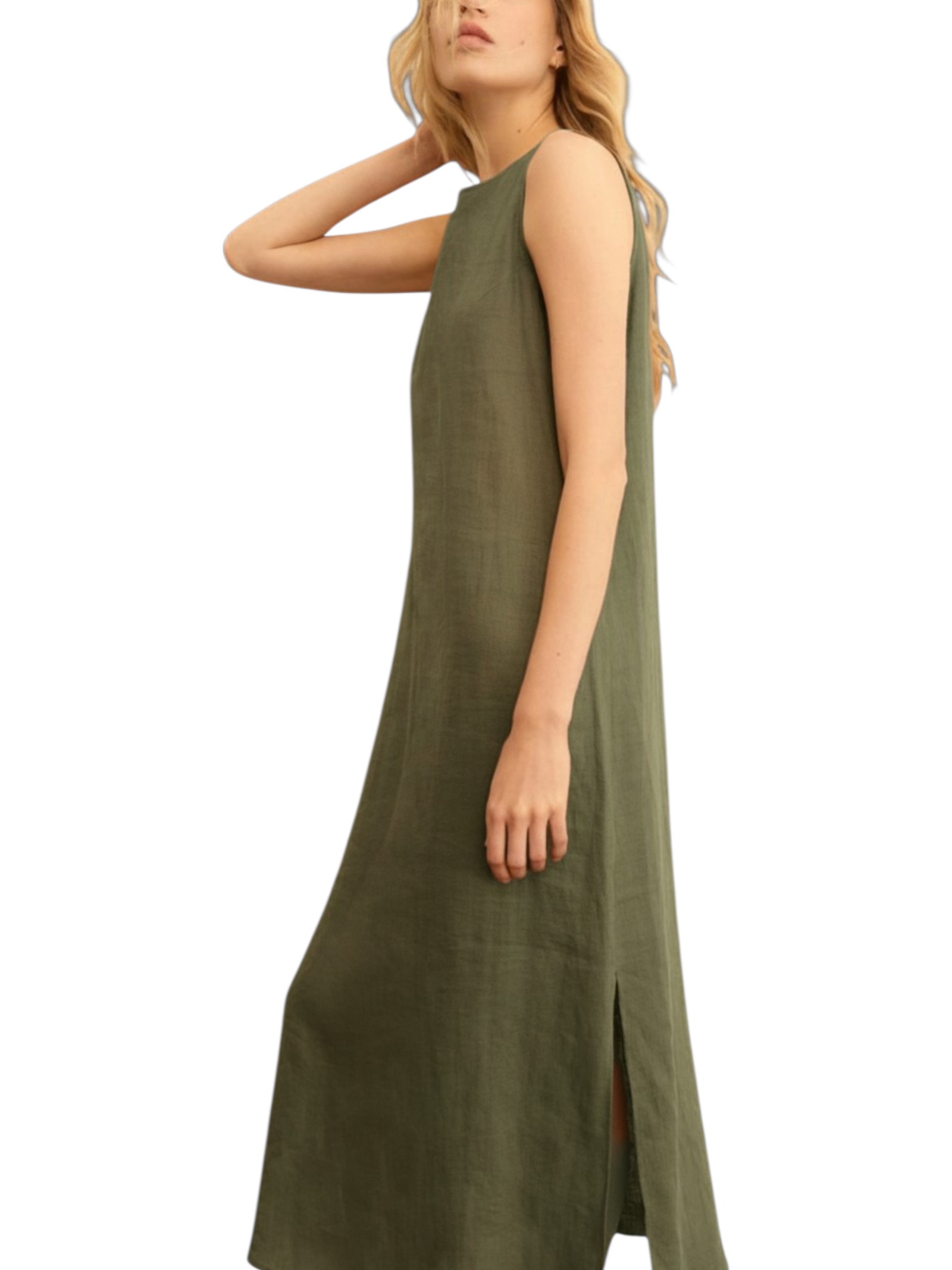 Summer essential: nuovo abito in puro lino lavato, con linea dritta sul busto e spacchi profondi laterali. Da declinare nelle nuance vitaminiche, per un nuovo stile urbano.