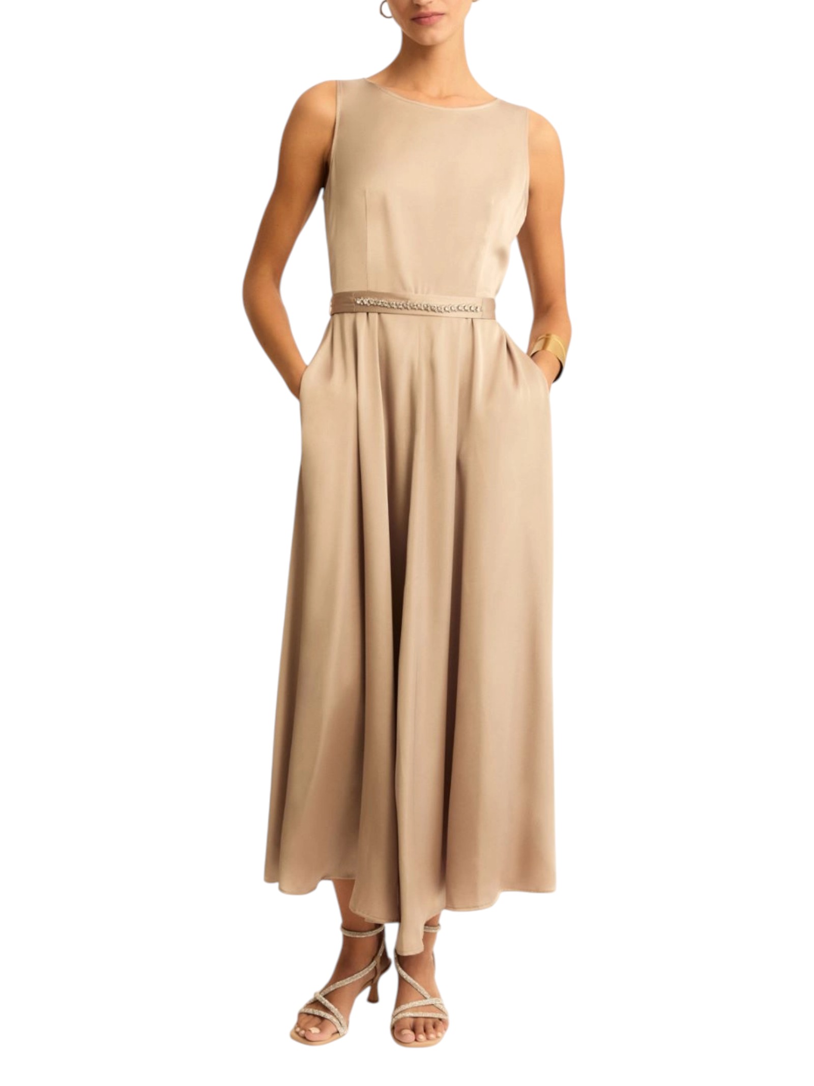 L'eleganza fluida del raso trasforma questo abito in alleato chic. Con cintura decorata da dettaglio bijoux, per una nota scintillante e una silhouette super femminile.