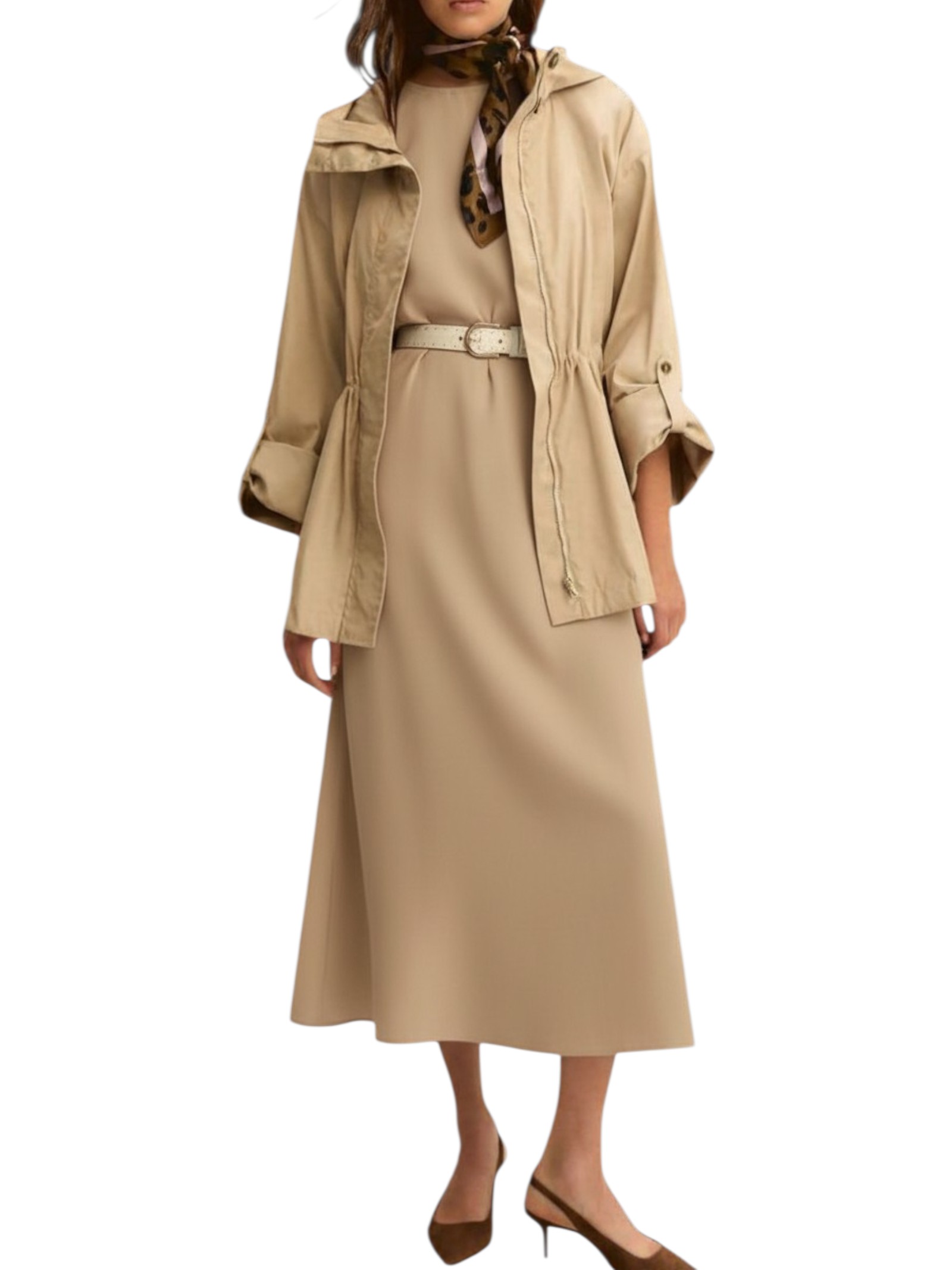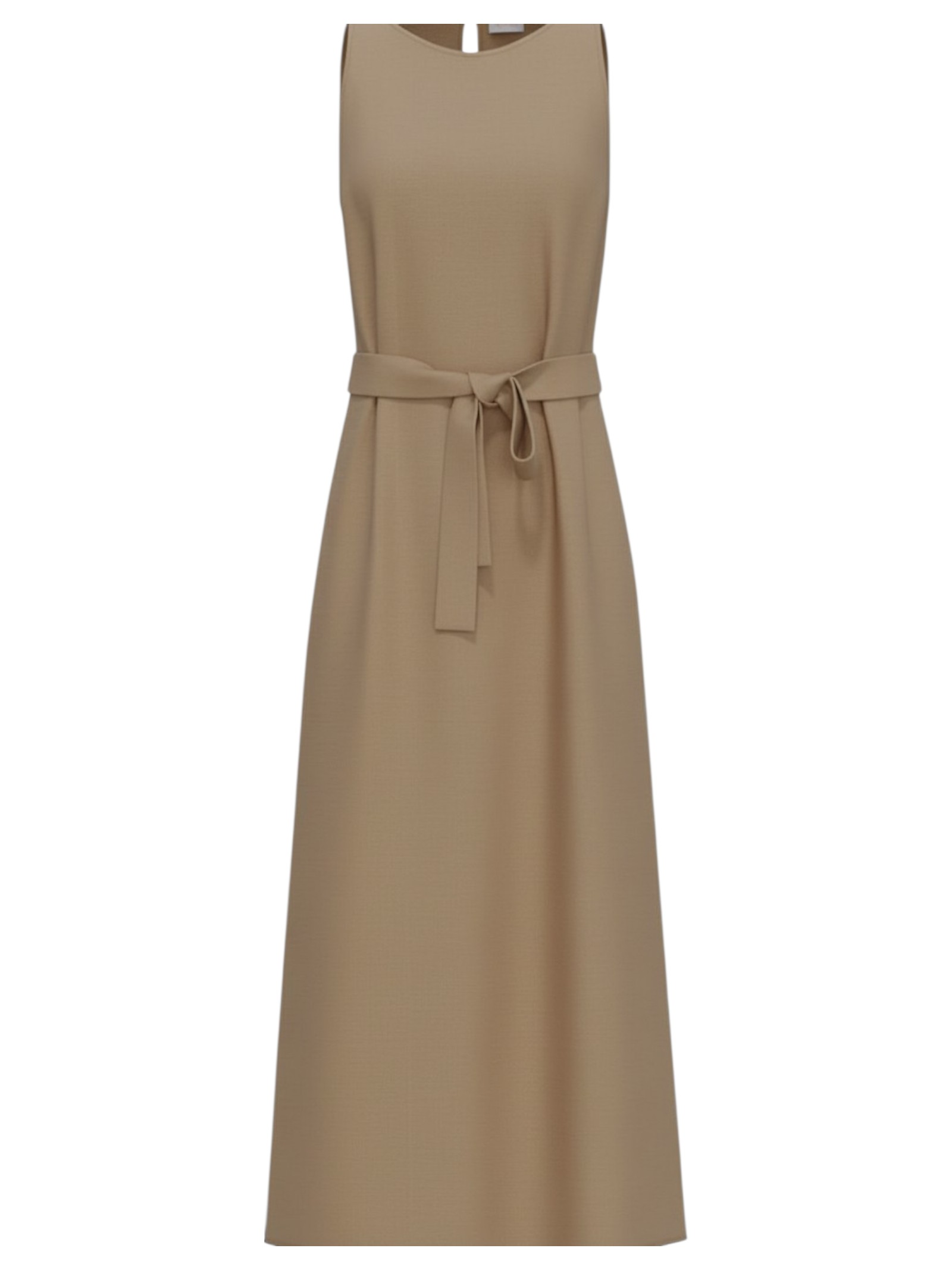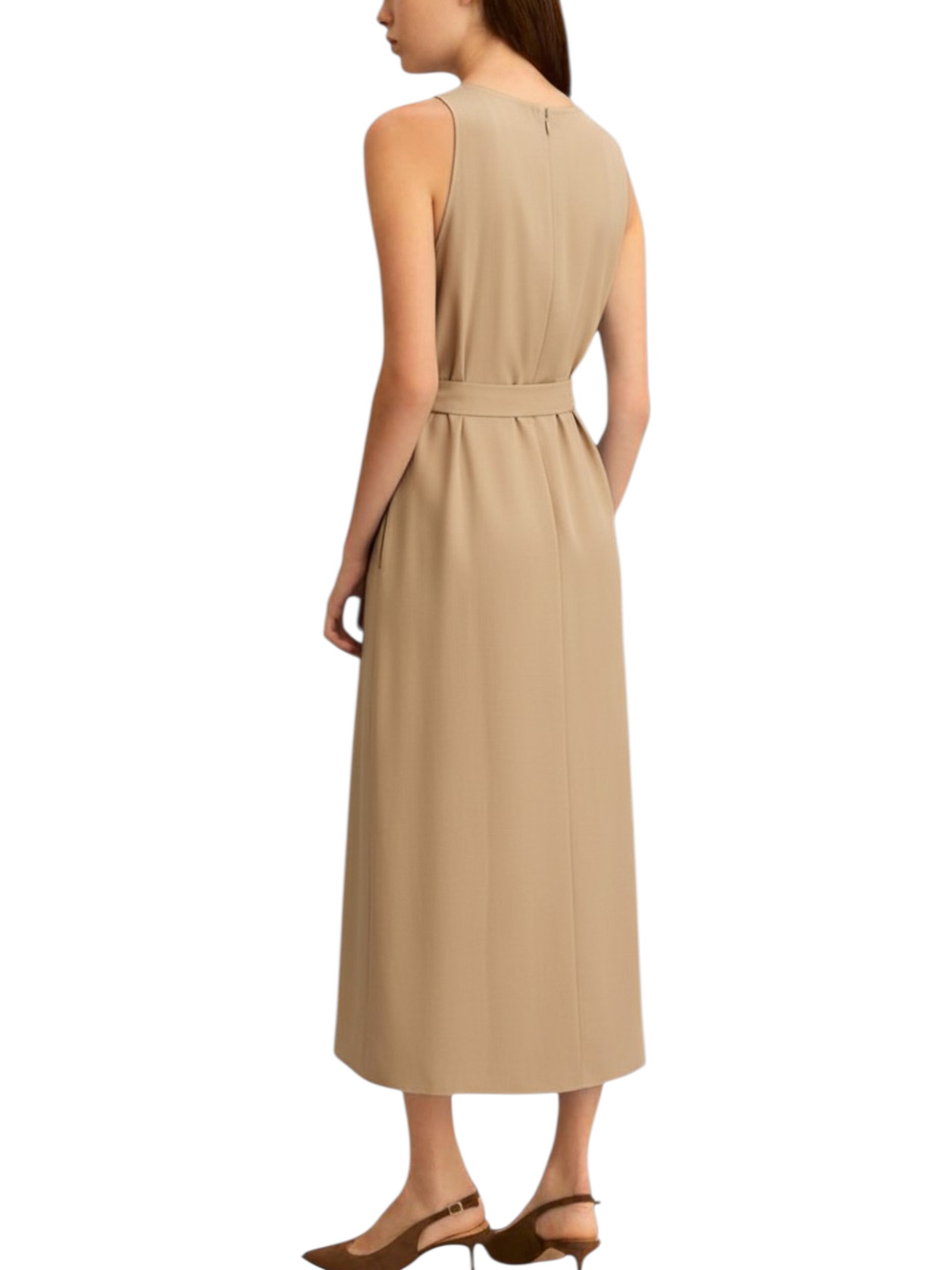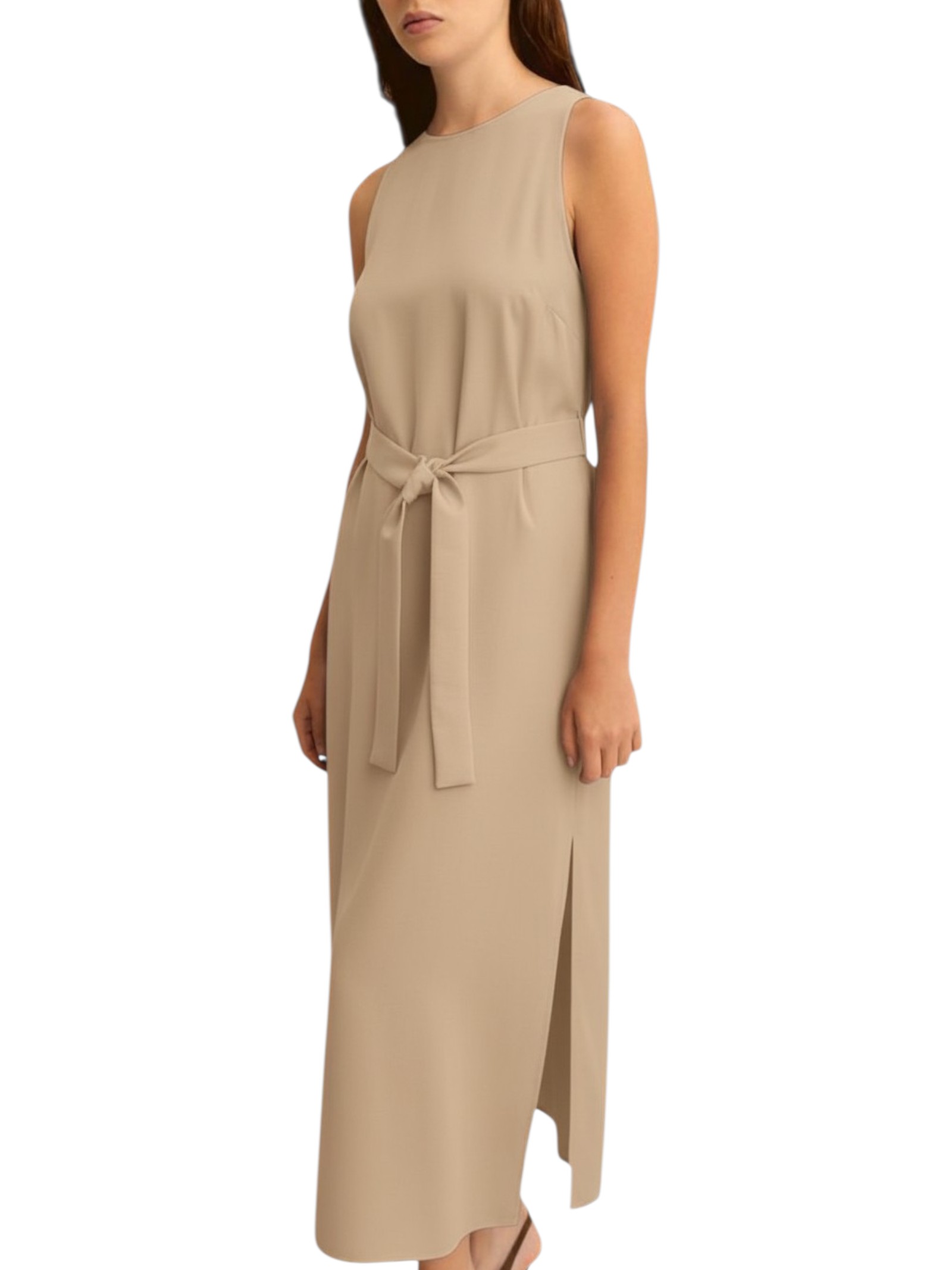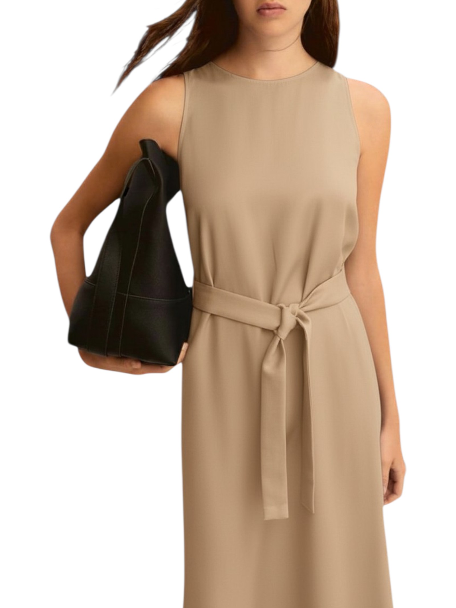 Quando la bella stagione chiama, l'abito smanicato risponde. Con una verve metropolitana e il tocco femminile della cintura in tessuto, per un punto vita in evidenza.