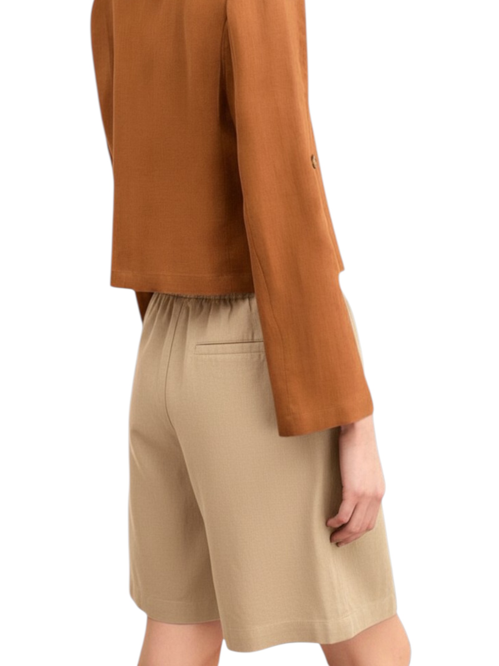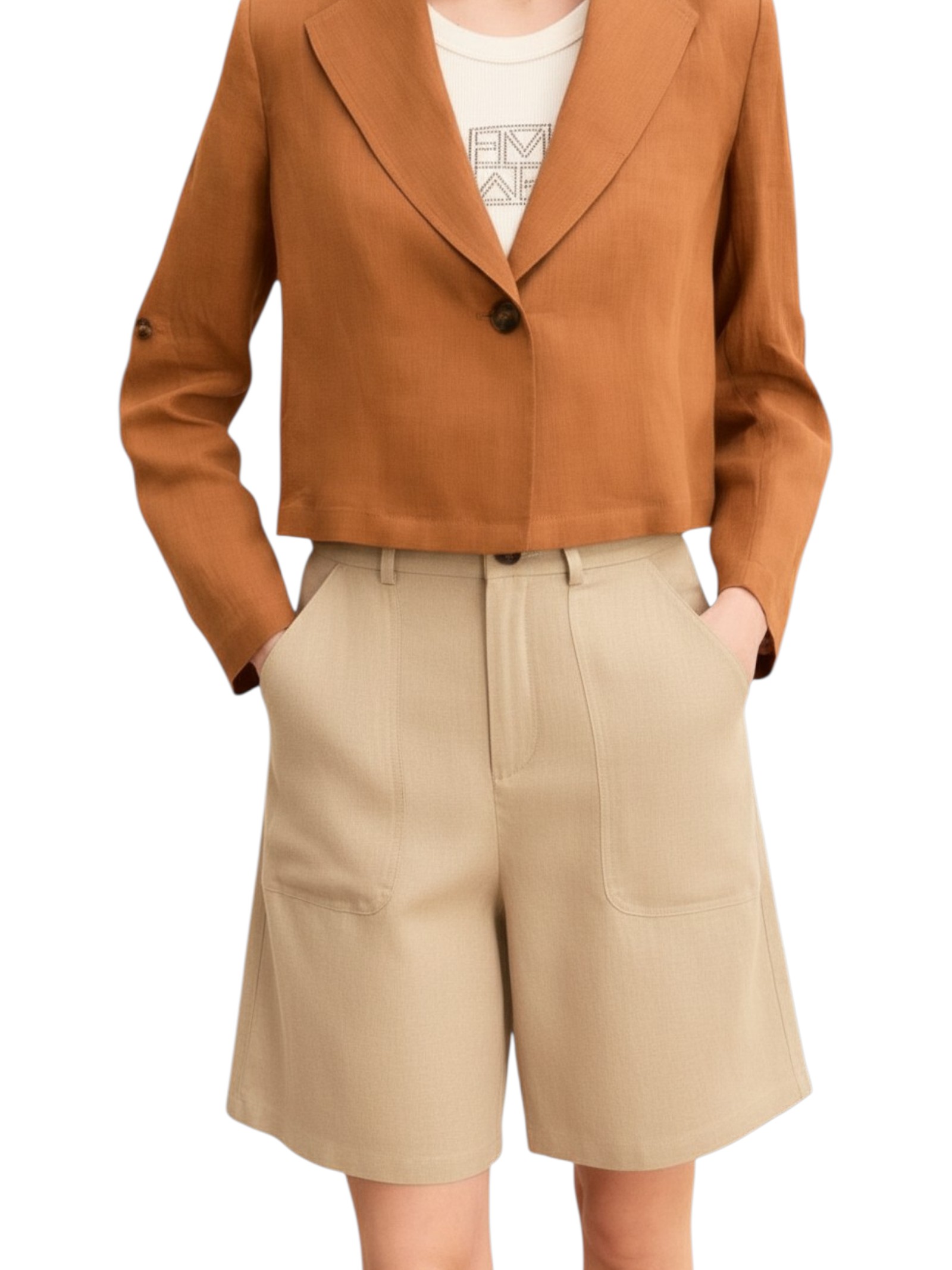 La soluzione elegante per l'estate? Il bermuda, in morbido lino, con tasche impunturate e una lunghezza versatile dall'ufficio alla città. Abbinalo con il blazer coordinato per un ensemble cool.