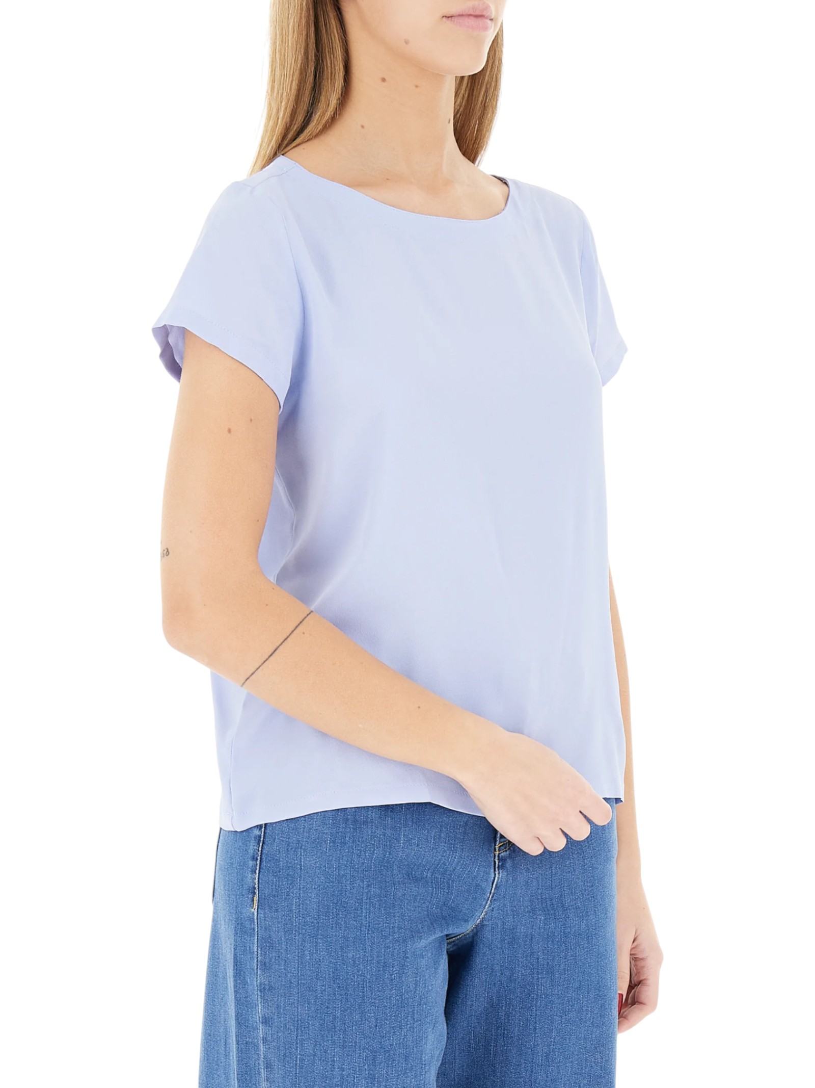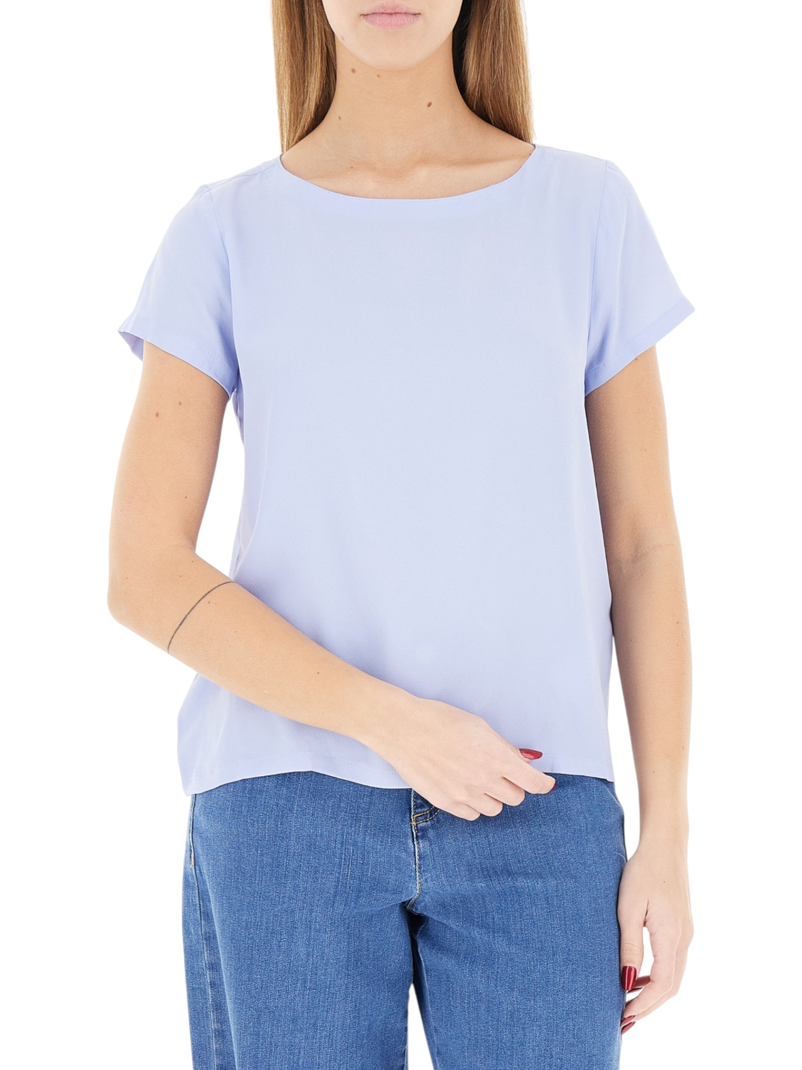 Blusa versatile ed elegante, in crêpe de Chine di misto seta per una nota preziosa sulla pelle. Con manica corta e collo a barchetta ispirato alle marinière anni '80.