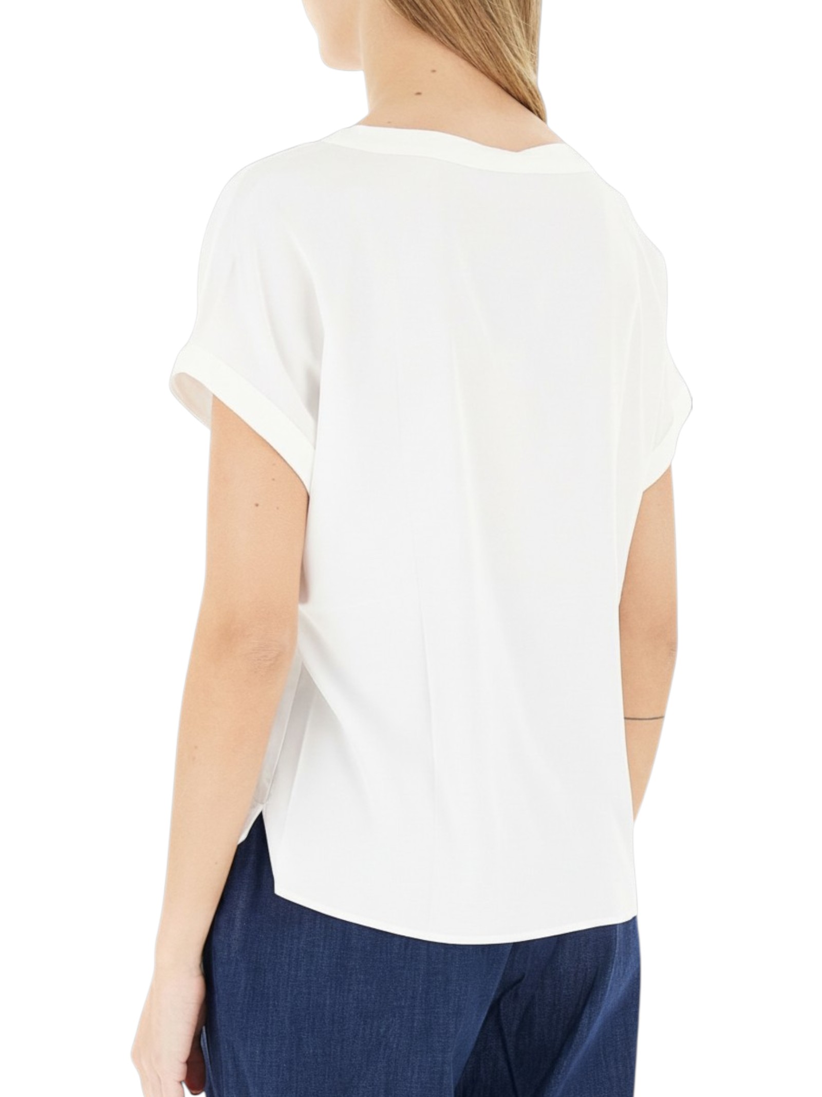 Preparati per la bella stagione con tutta la versatilità della blusa in raso stretch. Con linea pulita e il dettaglio raffinato dell'impuntura alta sul fondo manica.
