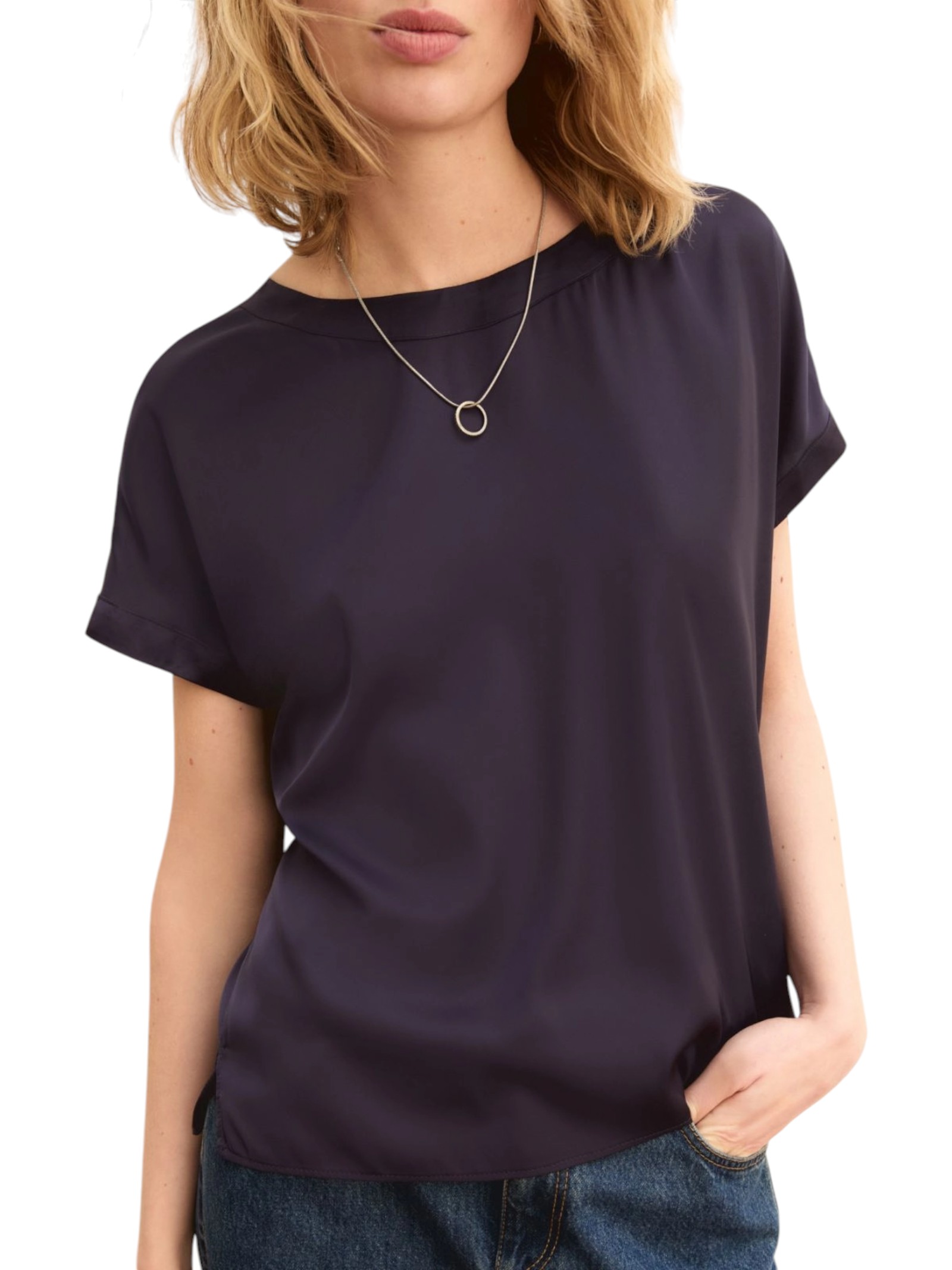 Preparati per la bella stagione con tutta la versatilità della blusa in raso stretch. Con linea pulita e il dettaglio raffinato dell'impuntura alta sul fondo manica.