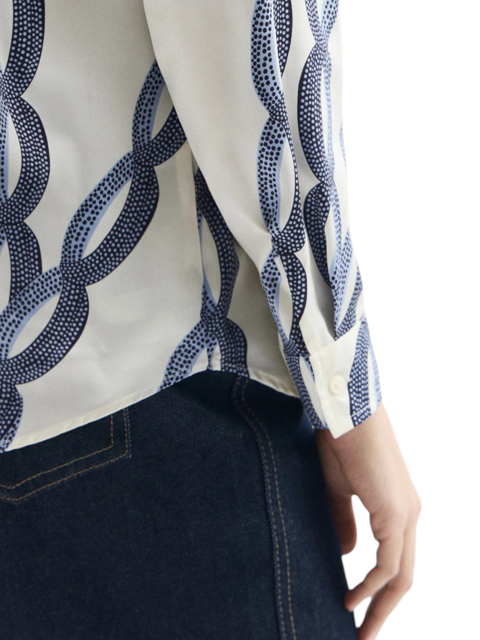 Con la sua stampa ispirata ai motivi a catena, questa camicia in twill introduce una nota sofisticata nelle tue mise quotidiane. Da completare con blazer e pantalone sartoriale per un business look impeccabile.