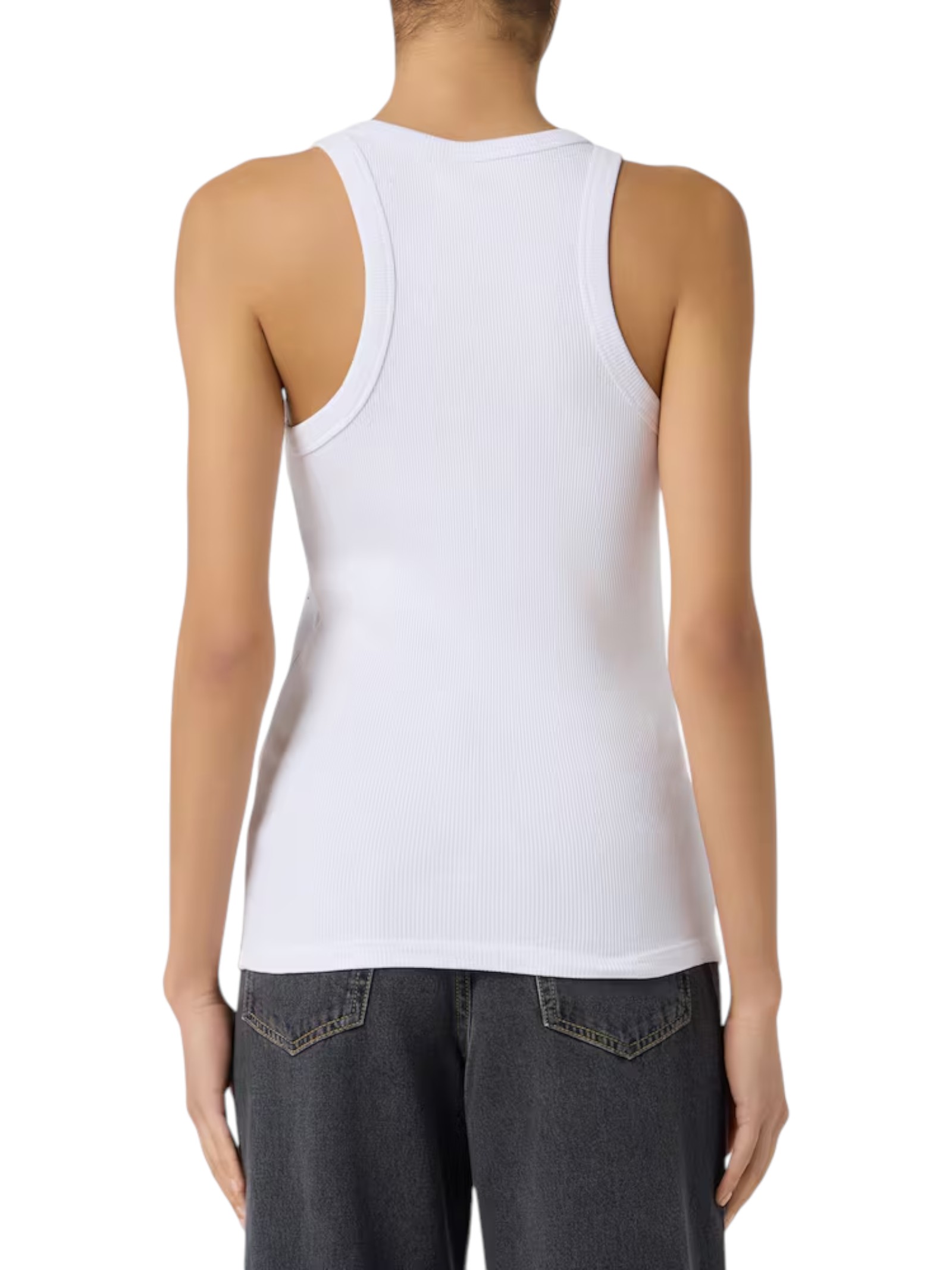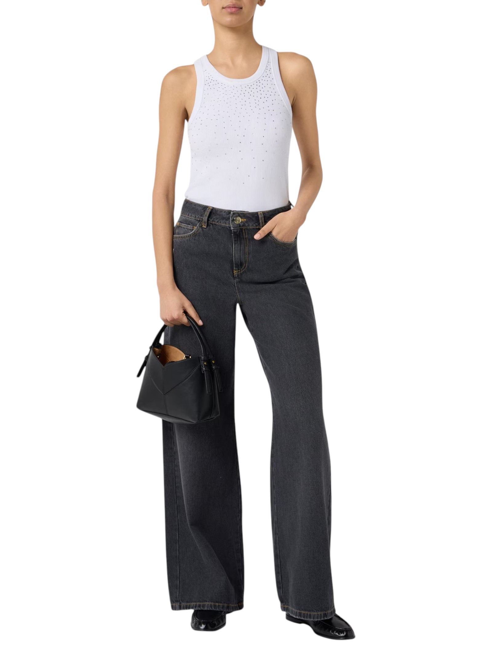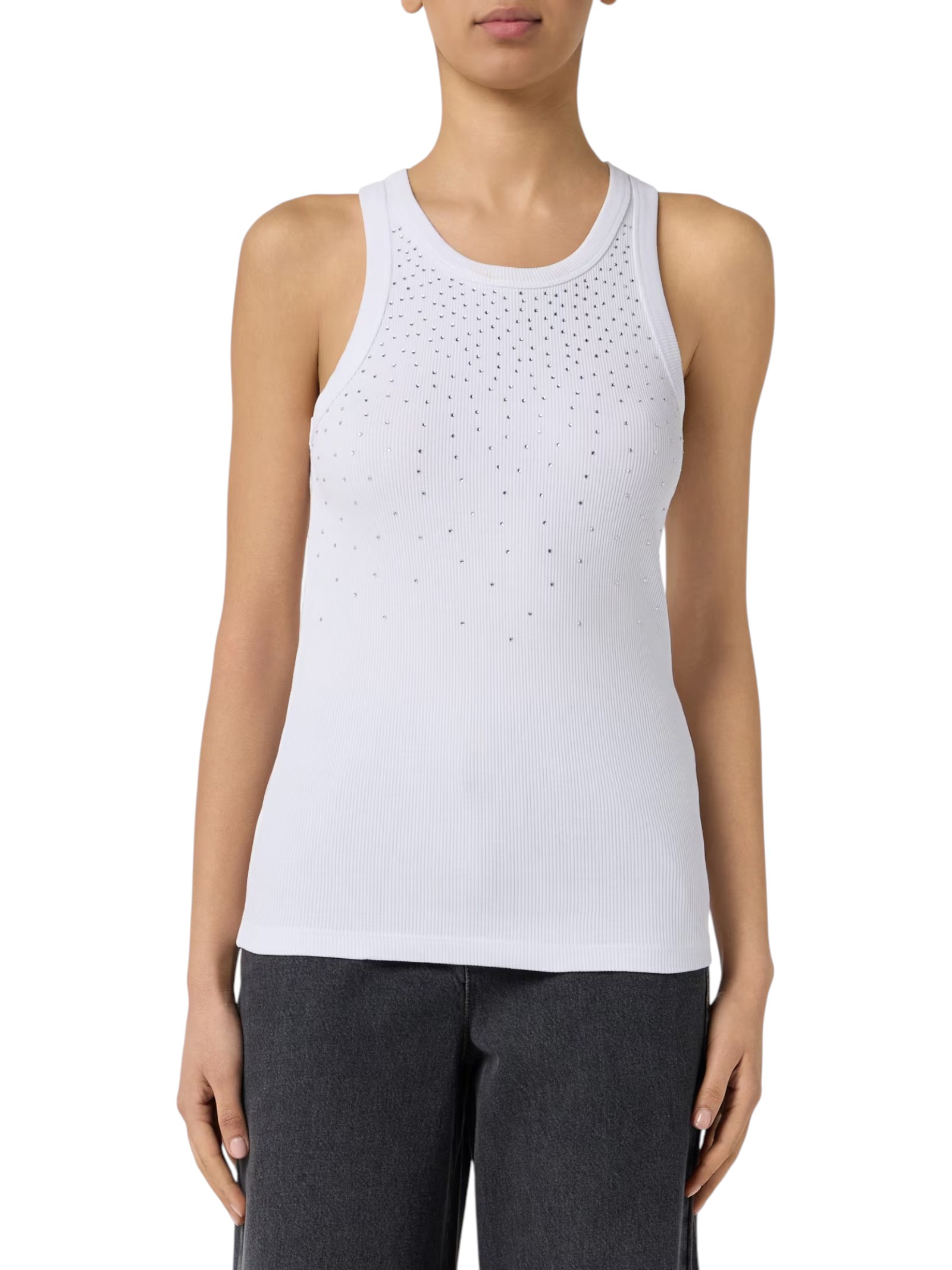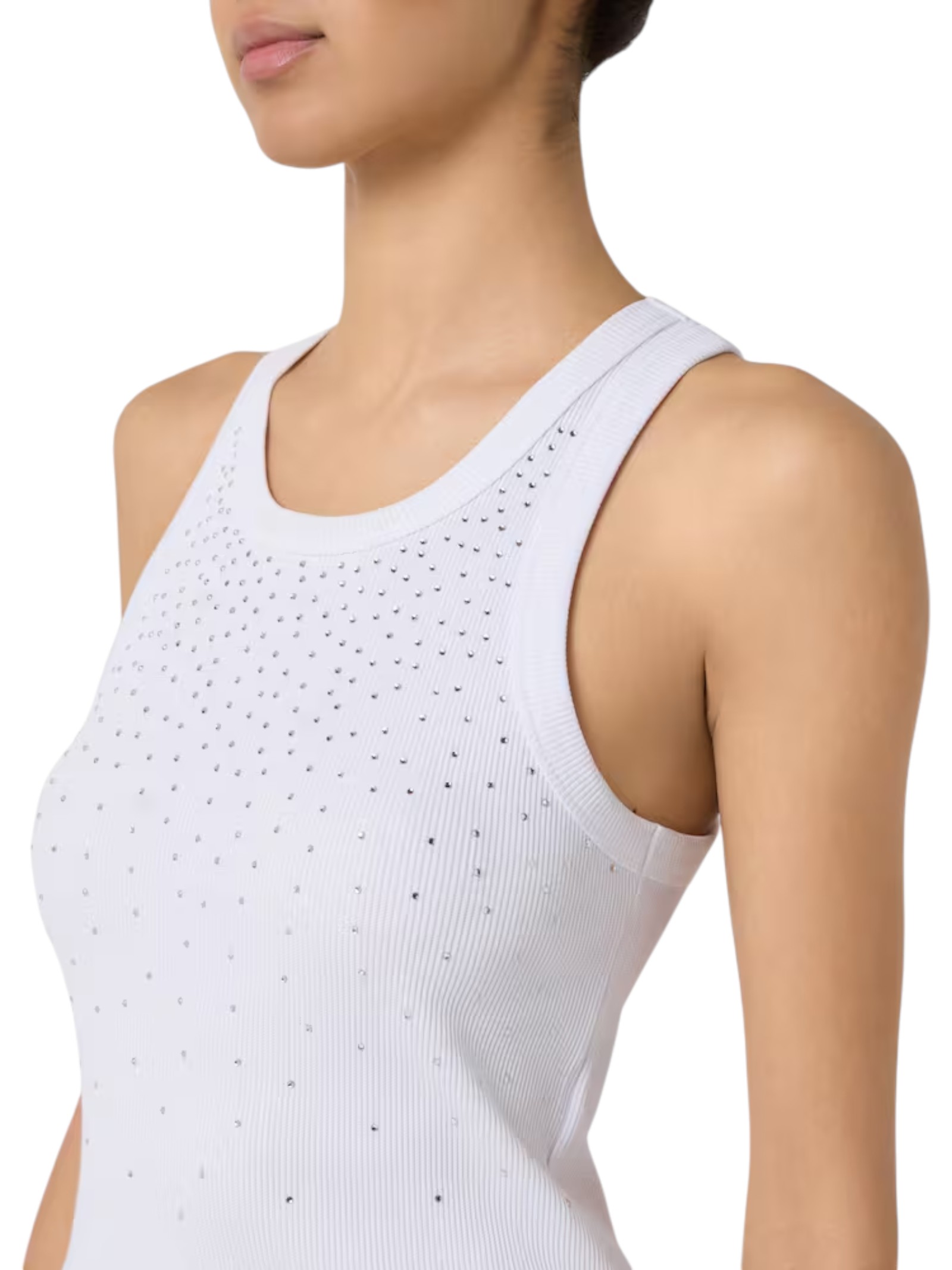 Essenziale, con un twist glamour: la canottina in cotone risplende di luce propria grazie ai micro cristalli applicati in dégradé sul davanti. Perfetta per chi ama lo stile pulito, senza rinunciare alla moda.