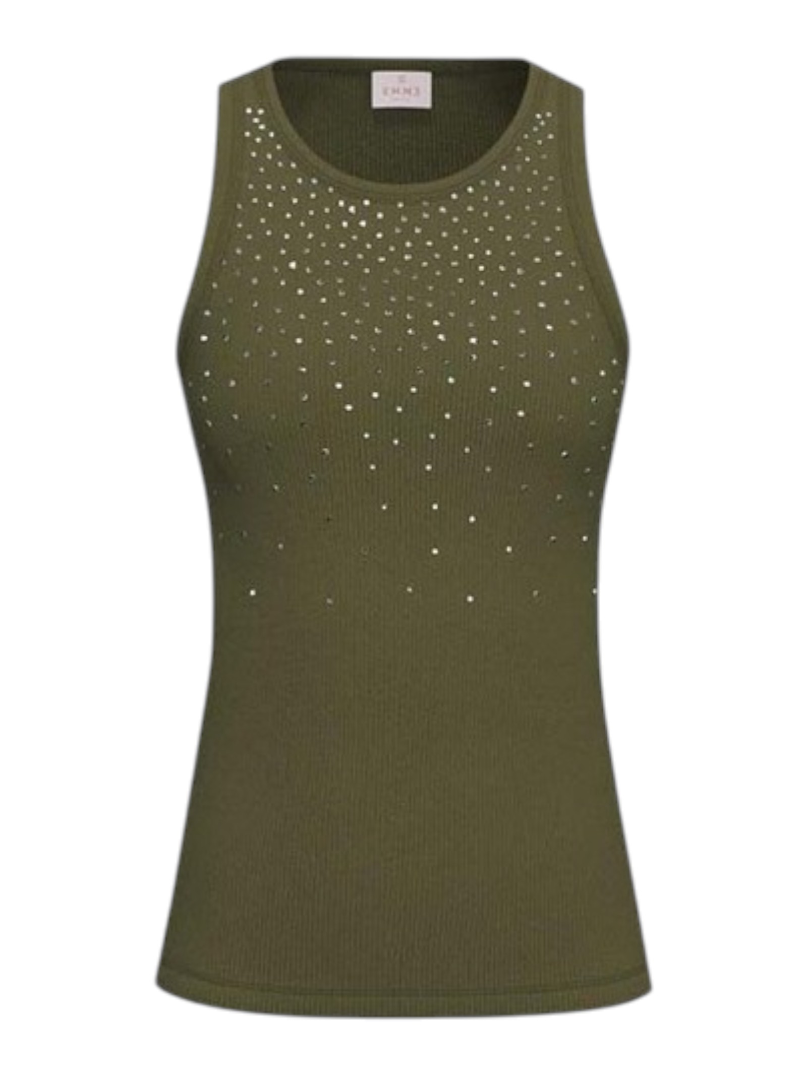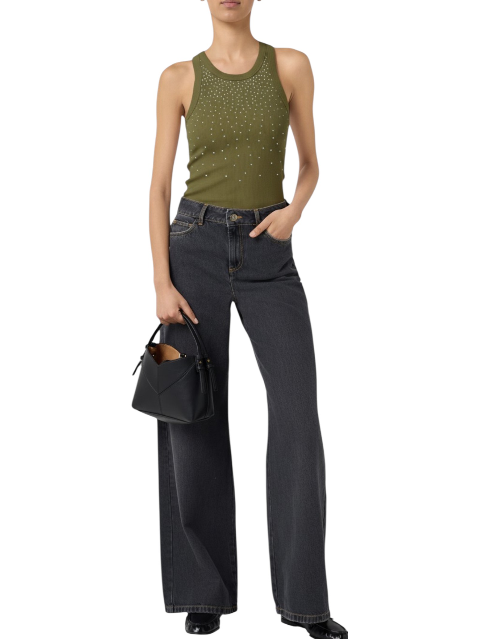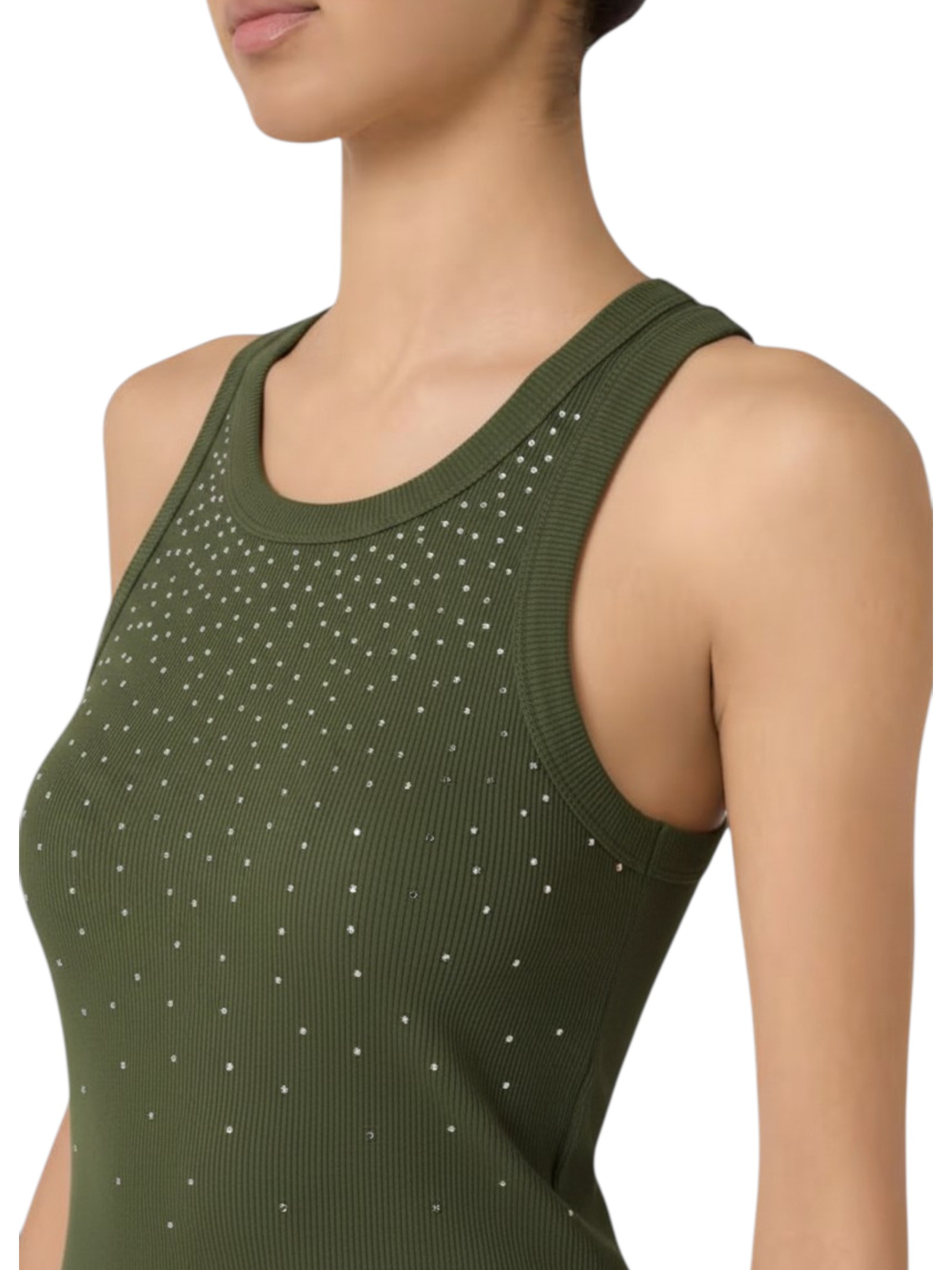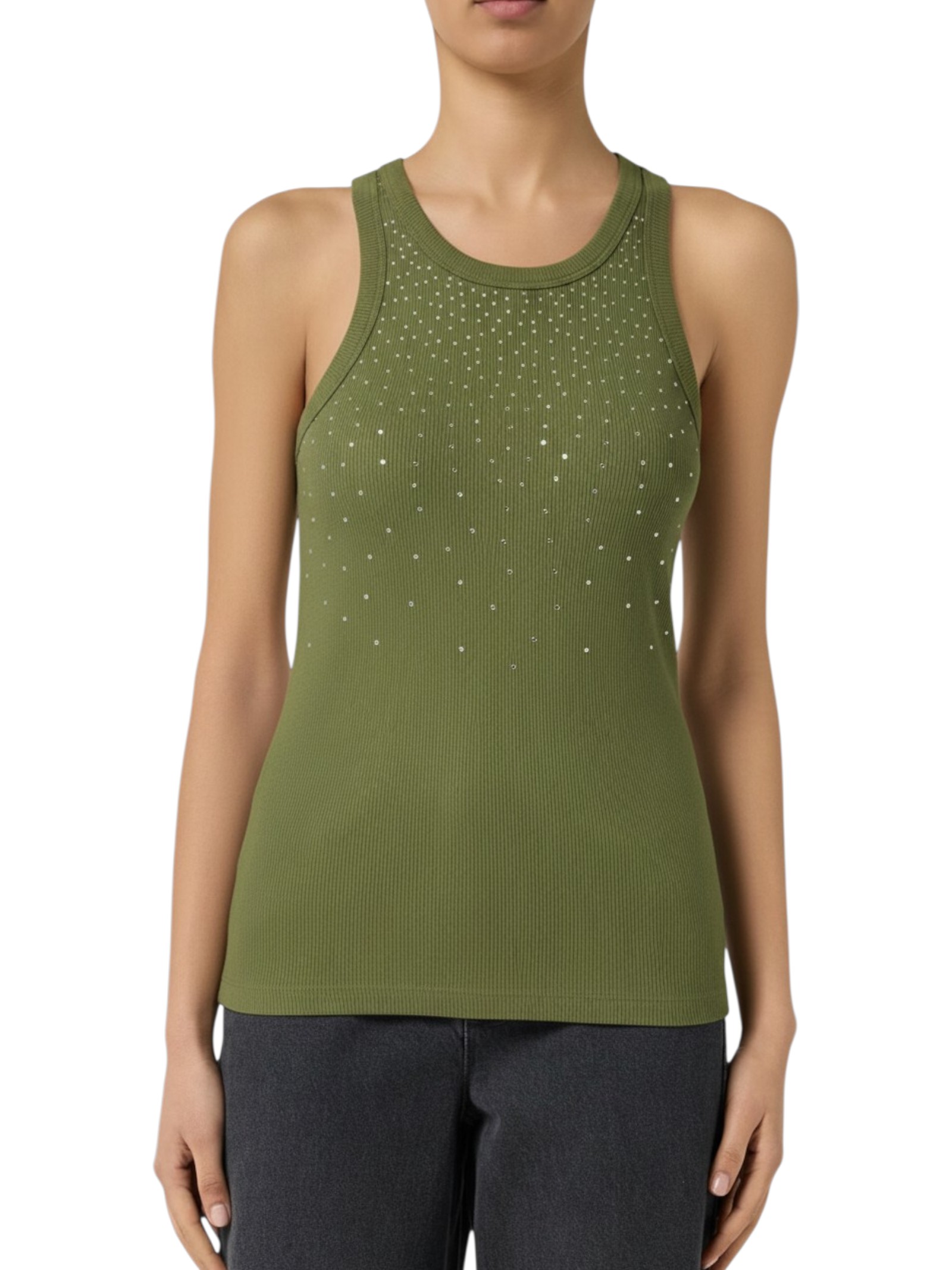 Essenziale, con un twist glamour: la canottina in cotone risplende di luce propria grazie ai micro cristalli applicati in dégradé sul davanti. Perfetta per chi ama lo stile pulito, senza rinunciare alla moda.