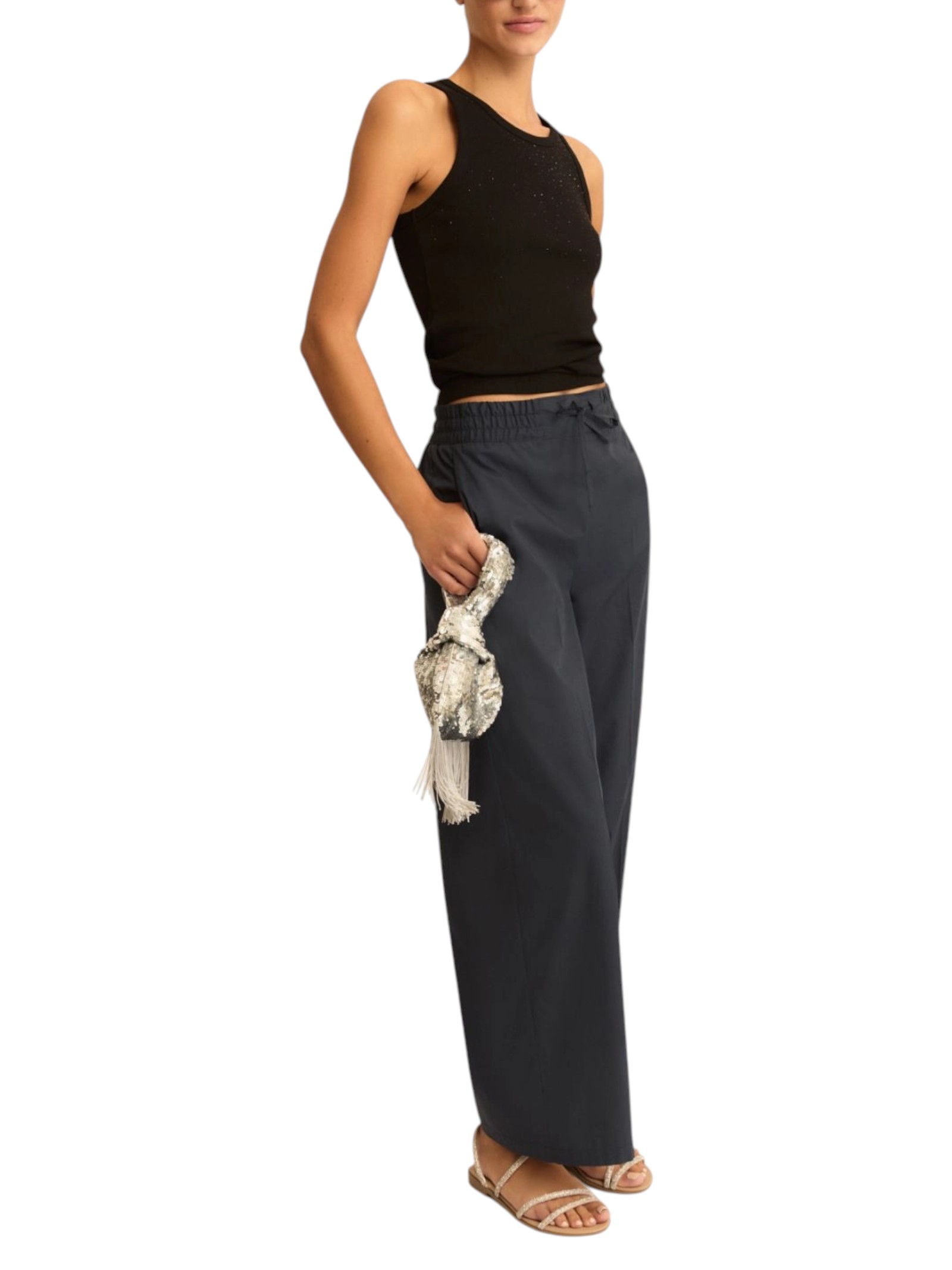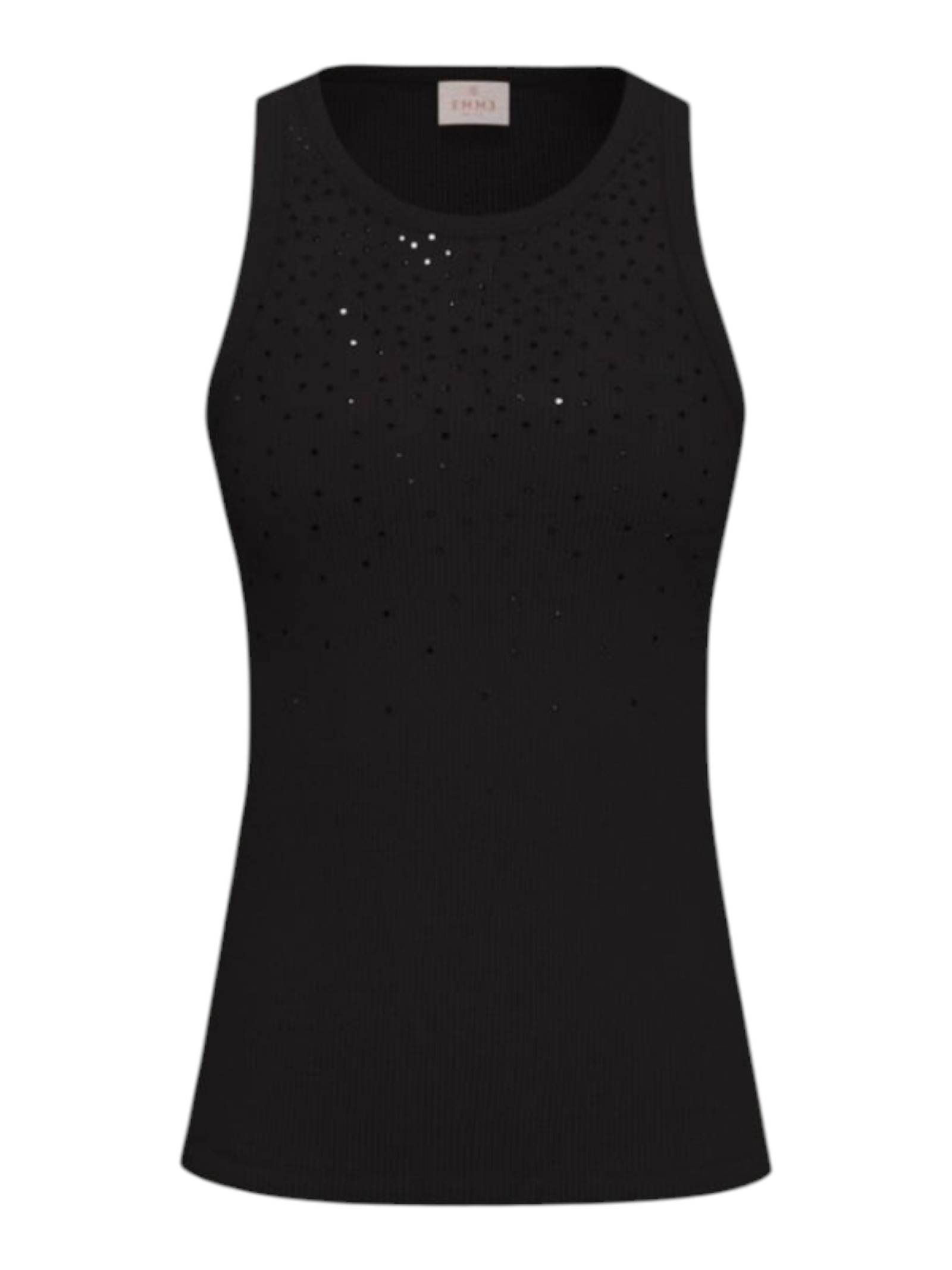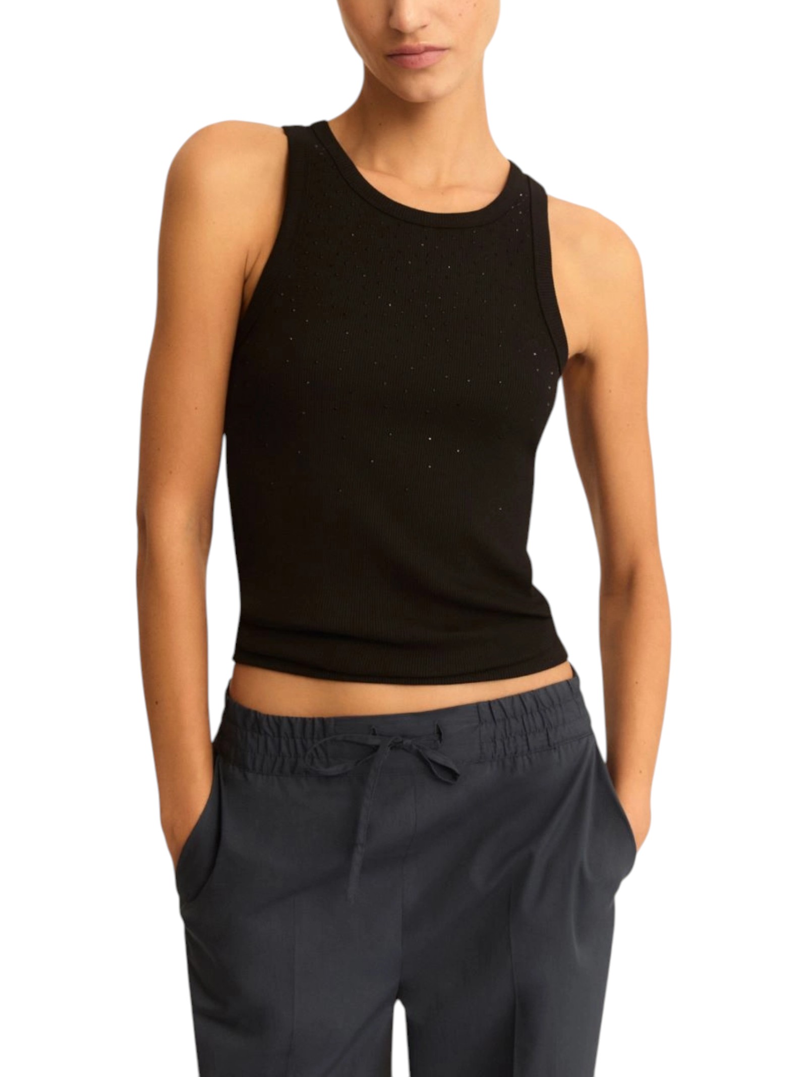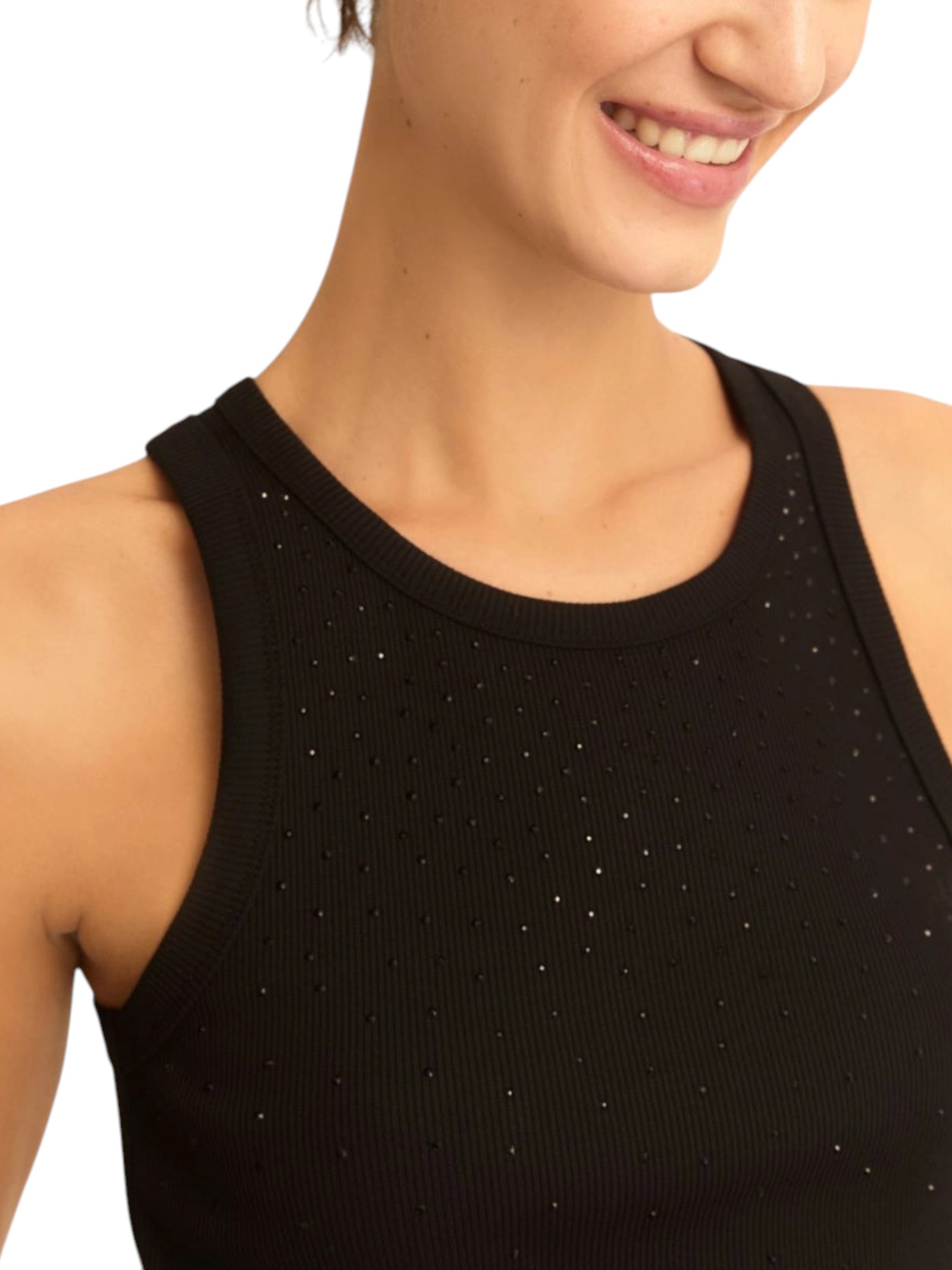 Essenziale, con un twist glamour: la canottina in cotone risplende di luce propria grazie ai micro cristalli applicati in dégradé sul davanti. Perfetta per chi ama lo stile pulito, senza rinunciare alla moda.