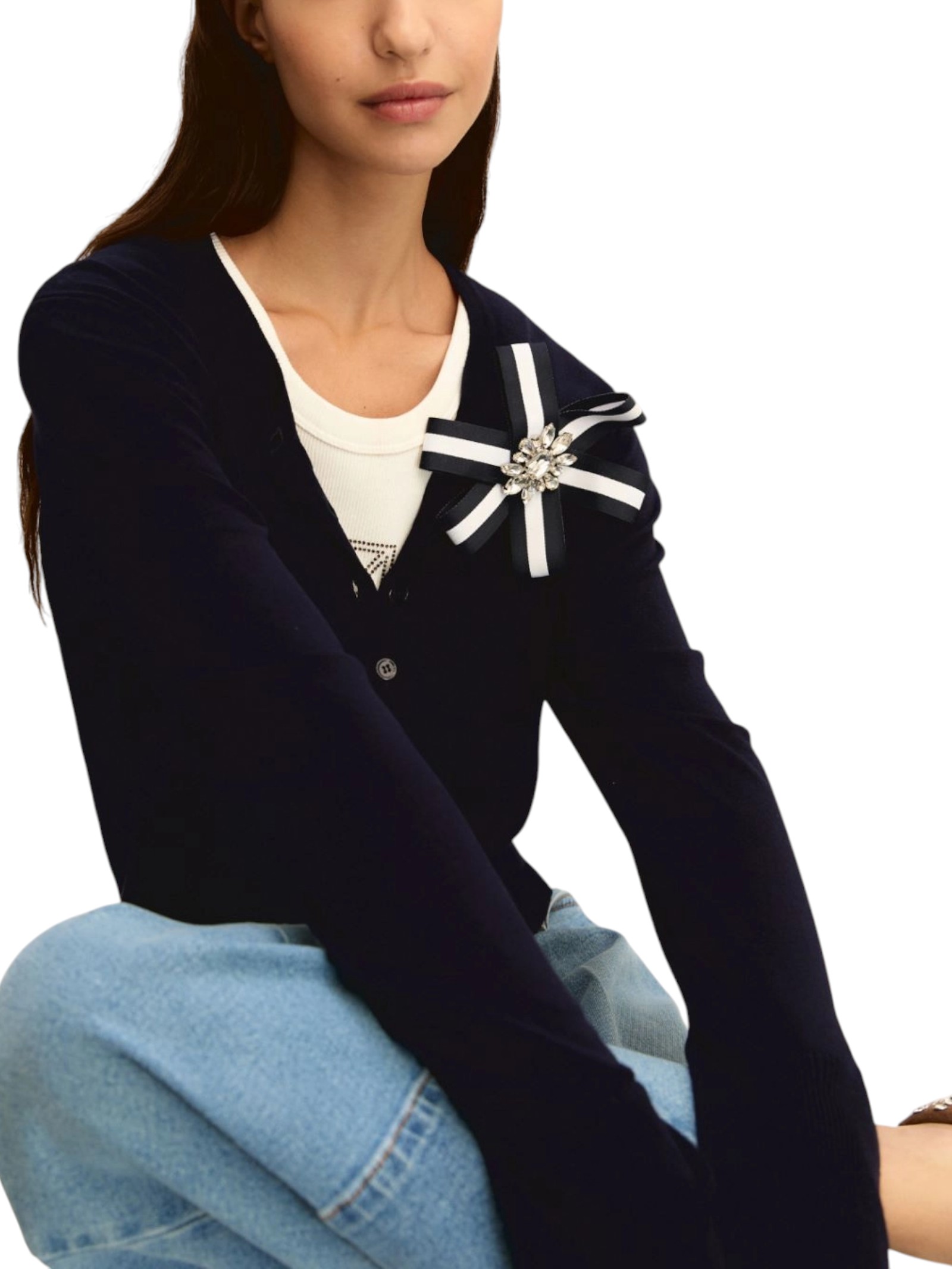 Il capo più versatile e bon ton di stagione è questo cardigan stretch, con linea femminile e piccola spilla bijoux dalla forma a coccarda. Premiata per lo stile!