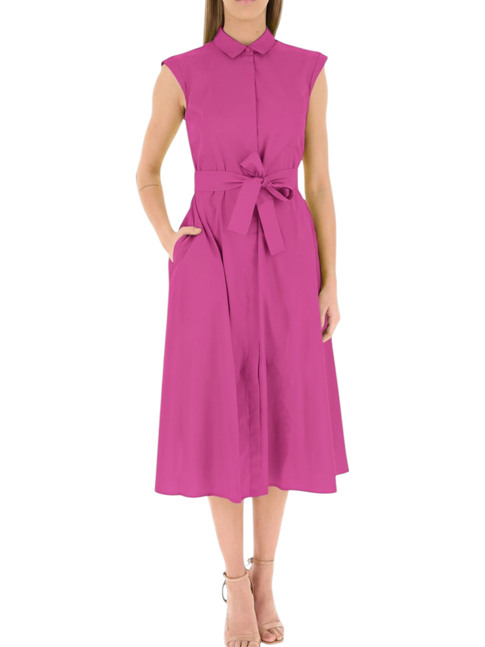 La brezza estiva muove il volume della gonna, carezza la pelle: scegli la freschezza dello chemisier smanicato. In popeline di puro cotone leggero e traspirante, con cintura in vita per una silhouette da personalizzare.