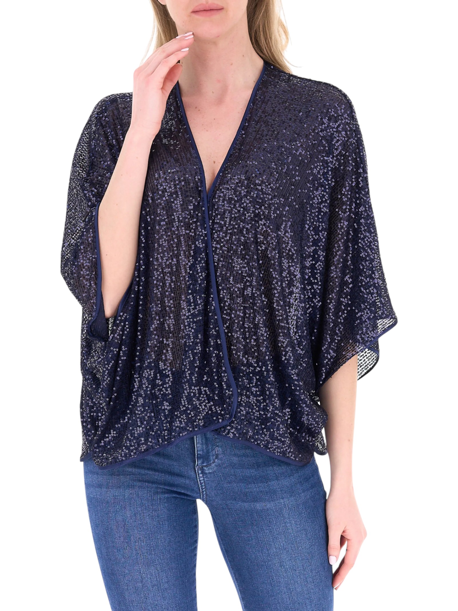 Coprispalle versione mantella, in paillettes luminose. Accessorio per completare i tuoi look eleganti, da cerimonia.