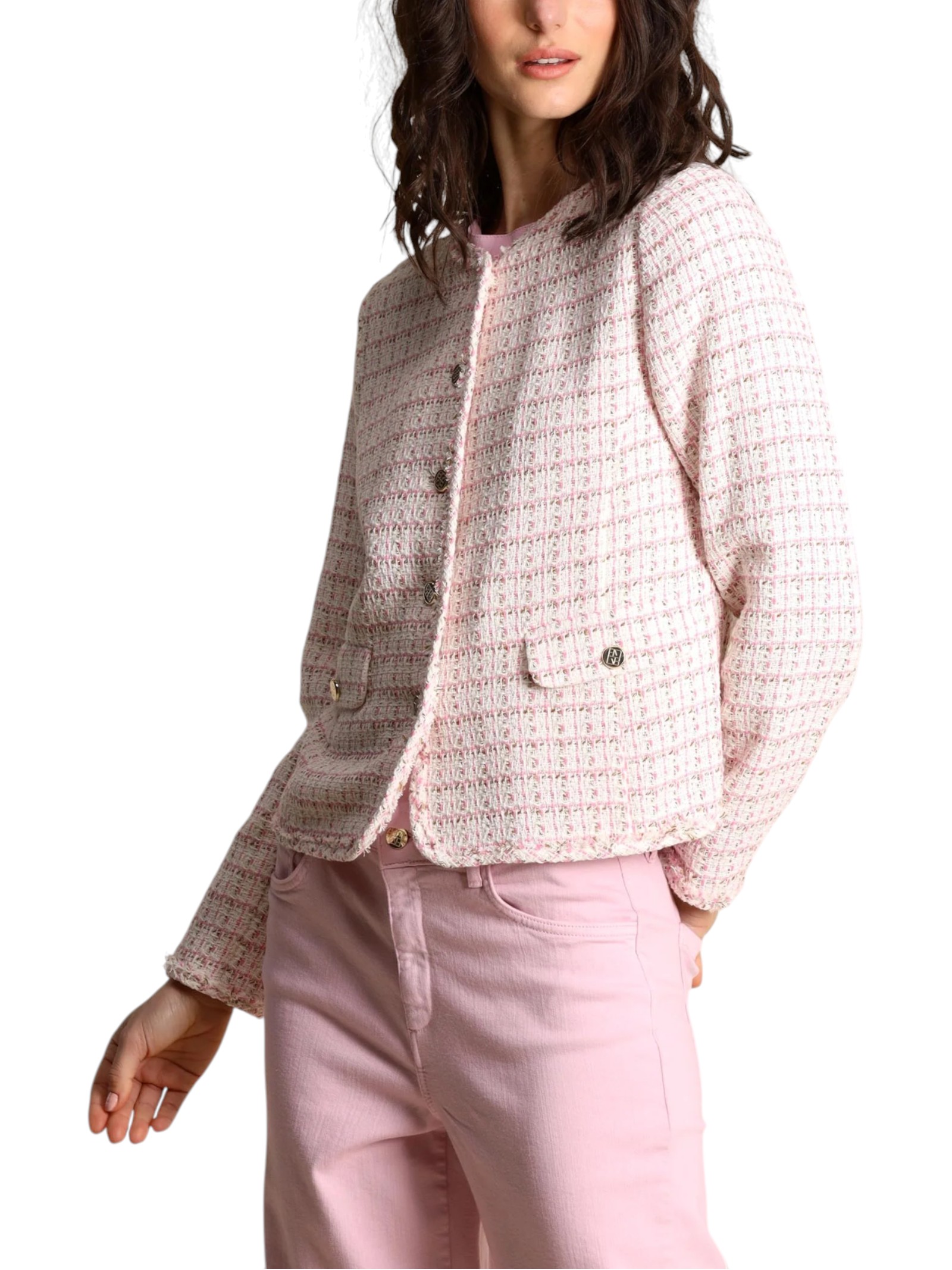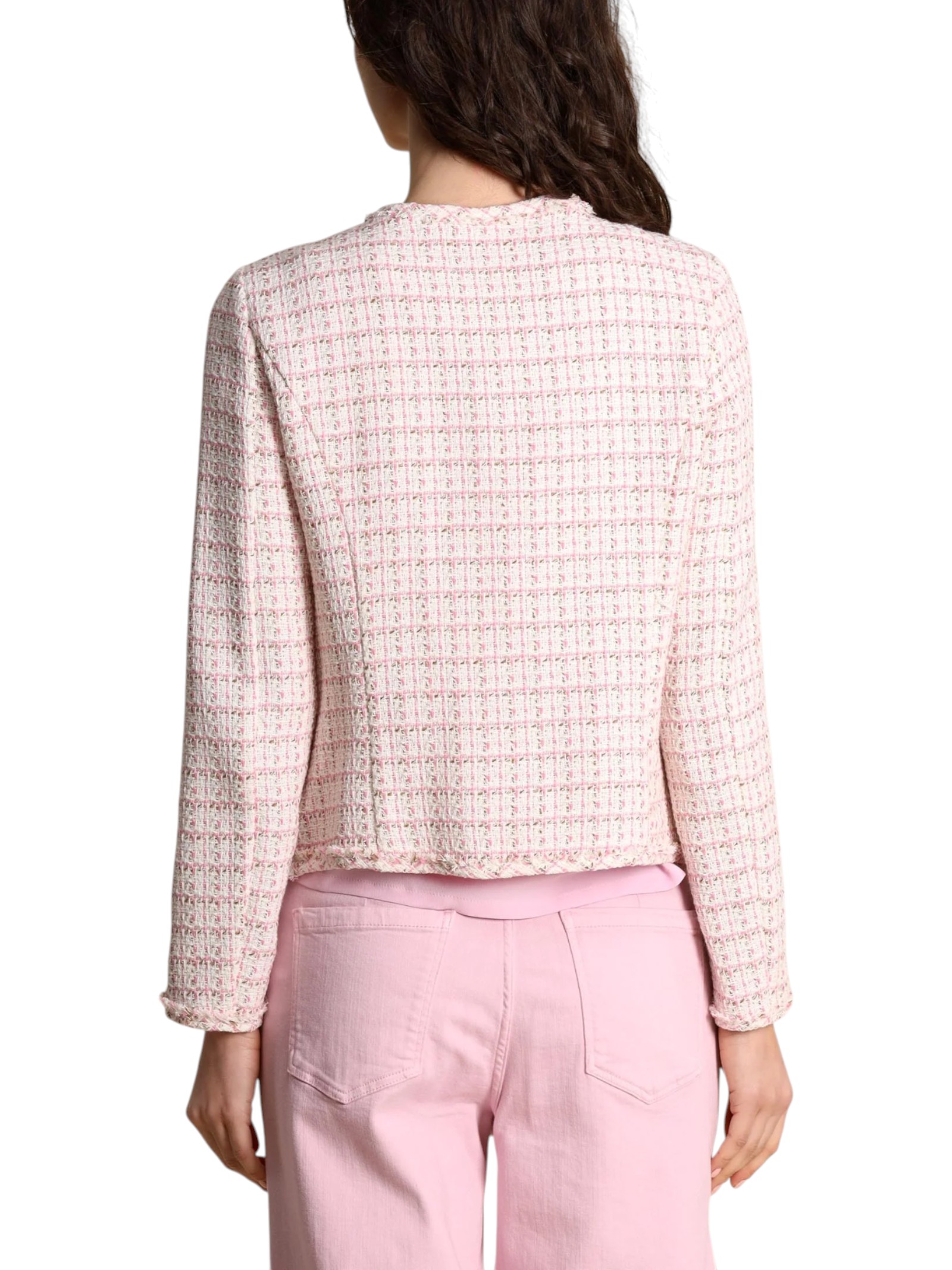 L'eleganza bon ton della giacchina in stuoia, proposta nella versione primaverile. Con piccole frange lungo i bordi e bottoni personalizzati che attirano lo sguardo.