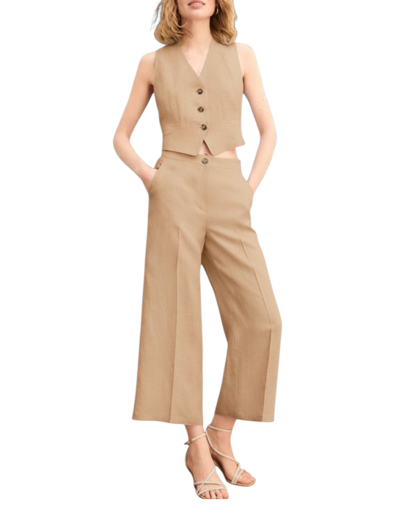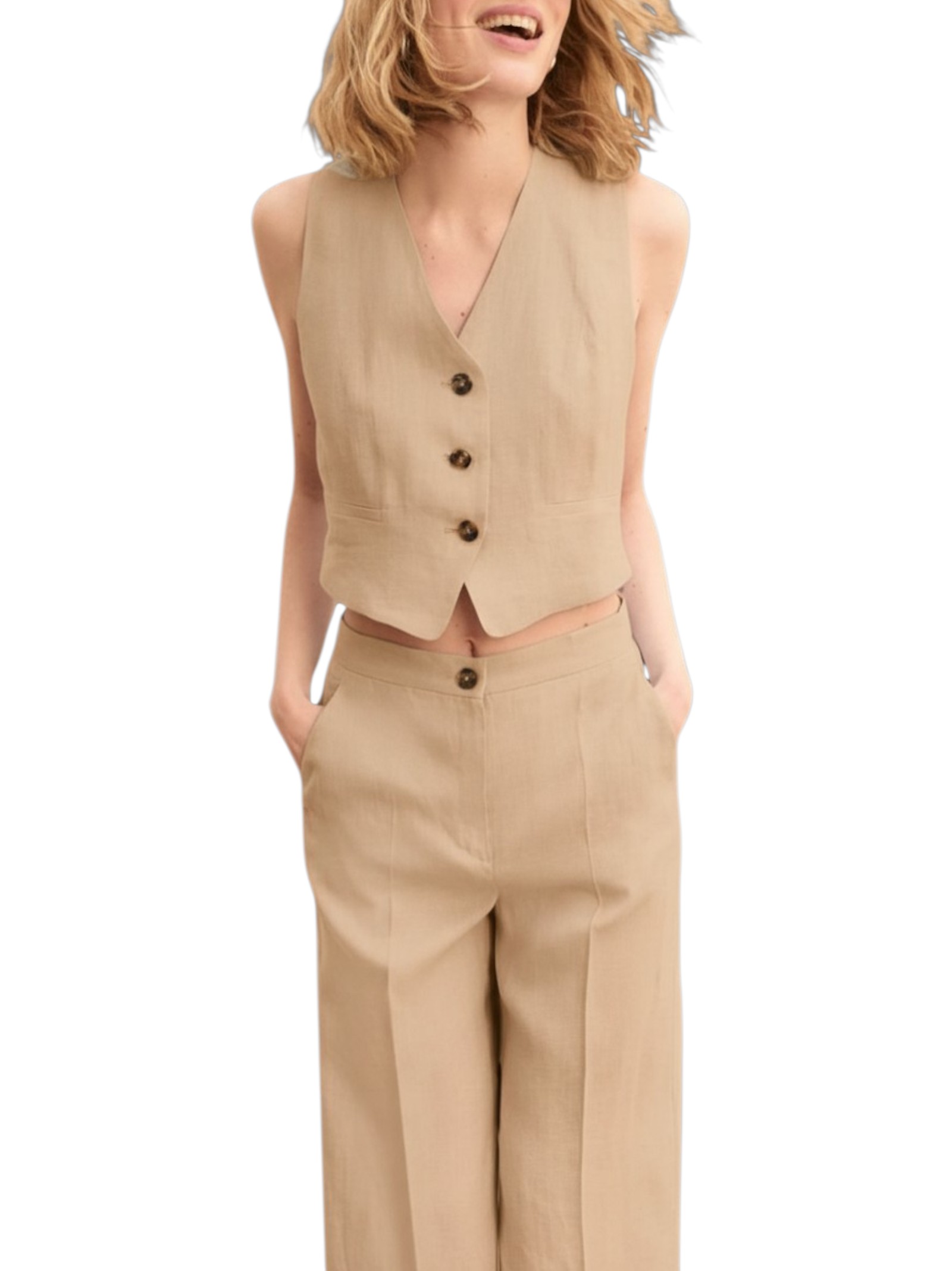 Un ibrido perfetto per l'eleganza estiva? E' il gilet aderente, da indossare a pelle come un top. In puro lino, leggero e fresco.
