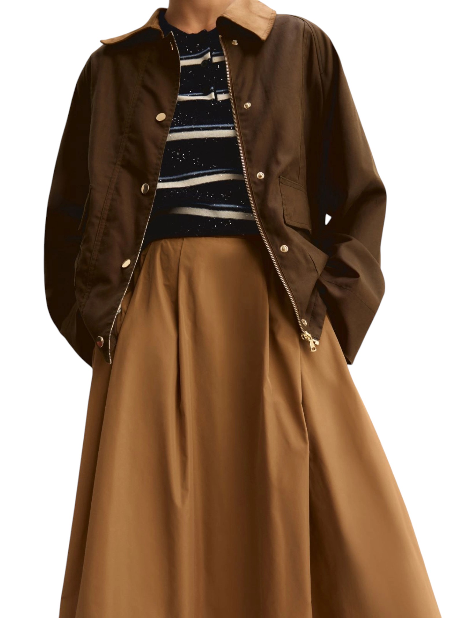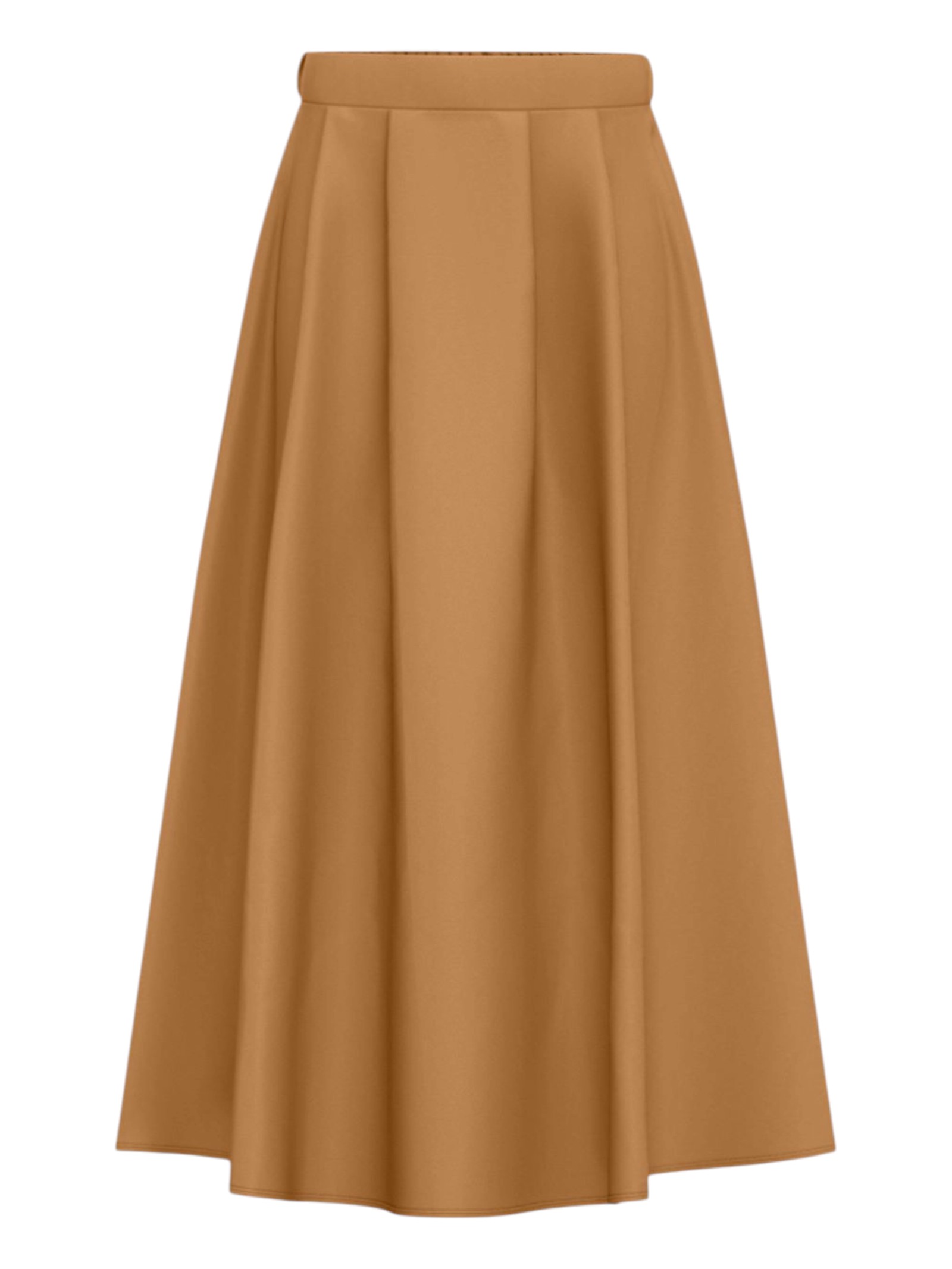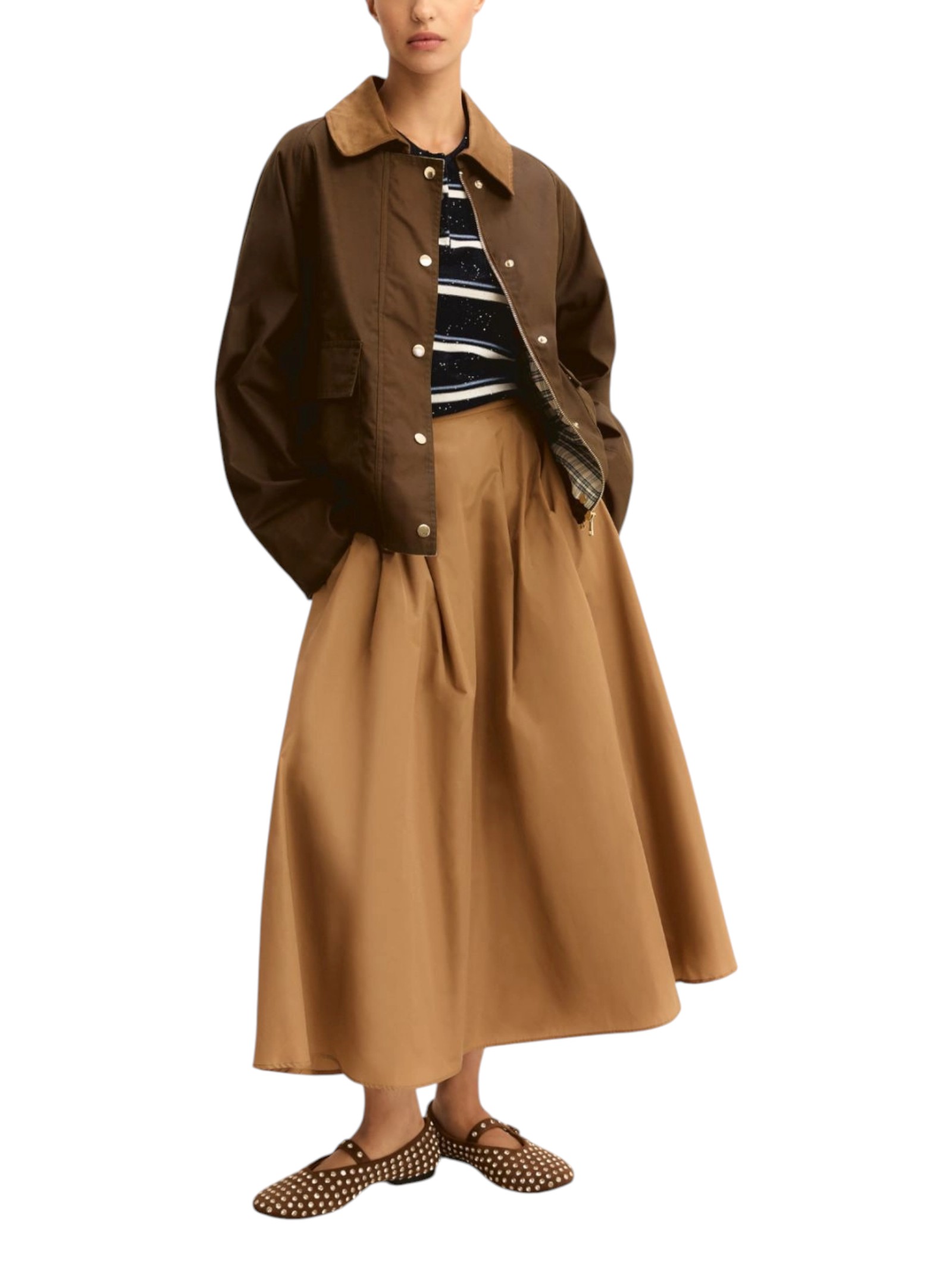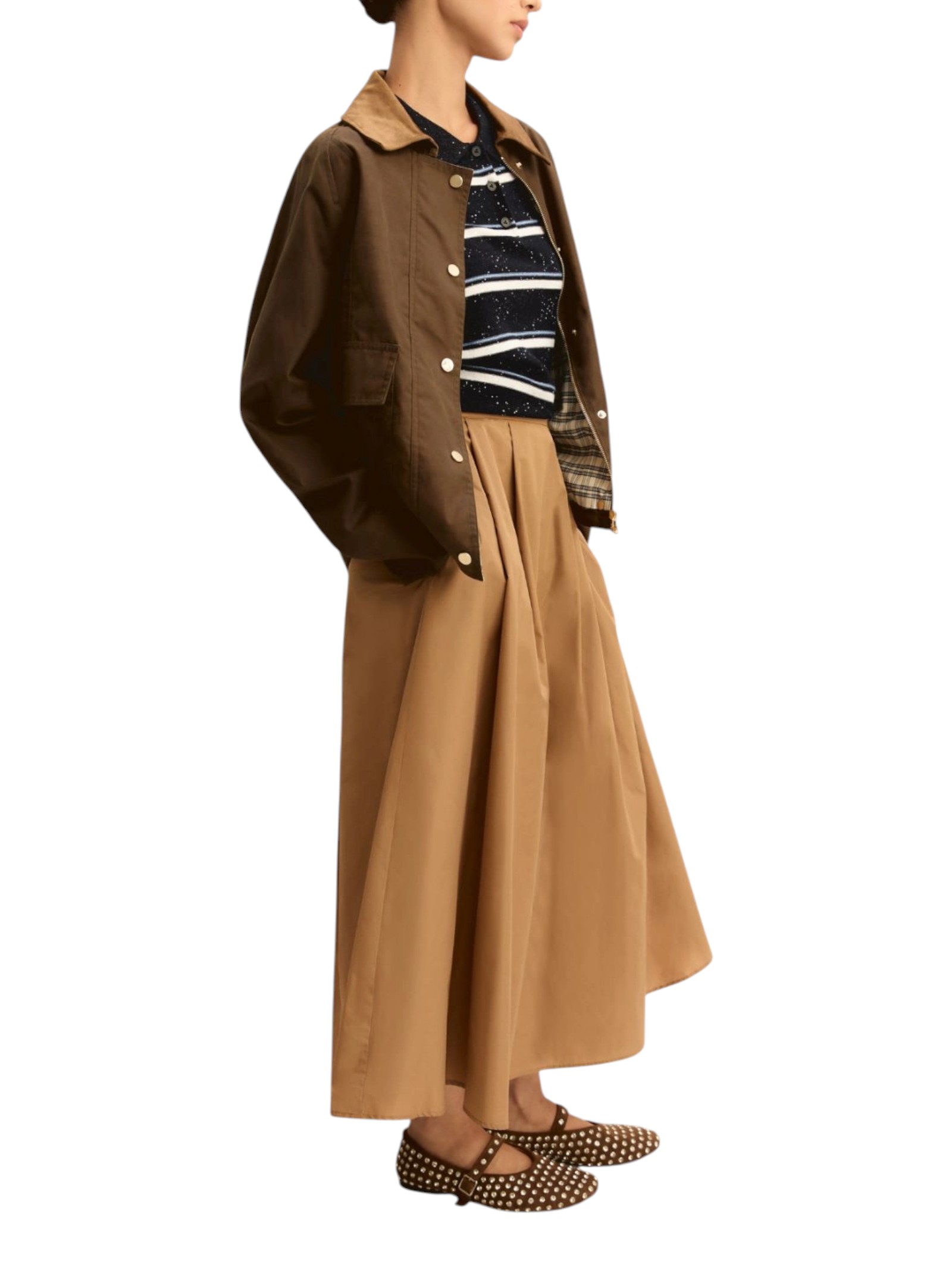 Pieghe morbide e taffetà che mantiene il volume, ecco la gonna più femminile di stagione. Da abbinare alla camicia in popeline per il giorno, o alle bluse stampate per una nota più primaverile.