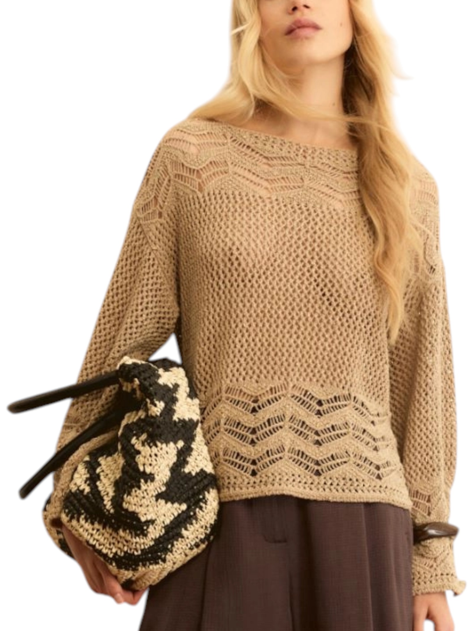 Completa il tuo look con un toco speciale: la maglia con filo di lurex gioca con le nuance della terra e un mix di punti dall'effetto tridimensionale. Sono perfetti sui pantaloni slim e sulle camicine estive, proteggendo dalla brezza serale.