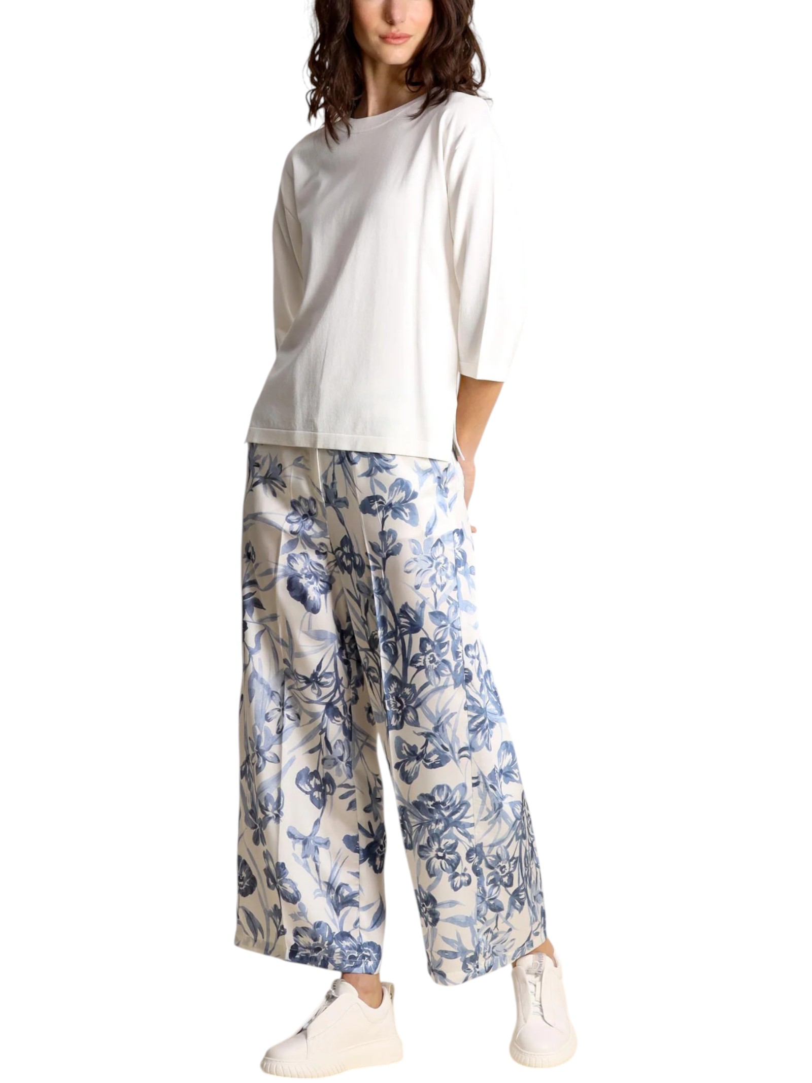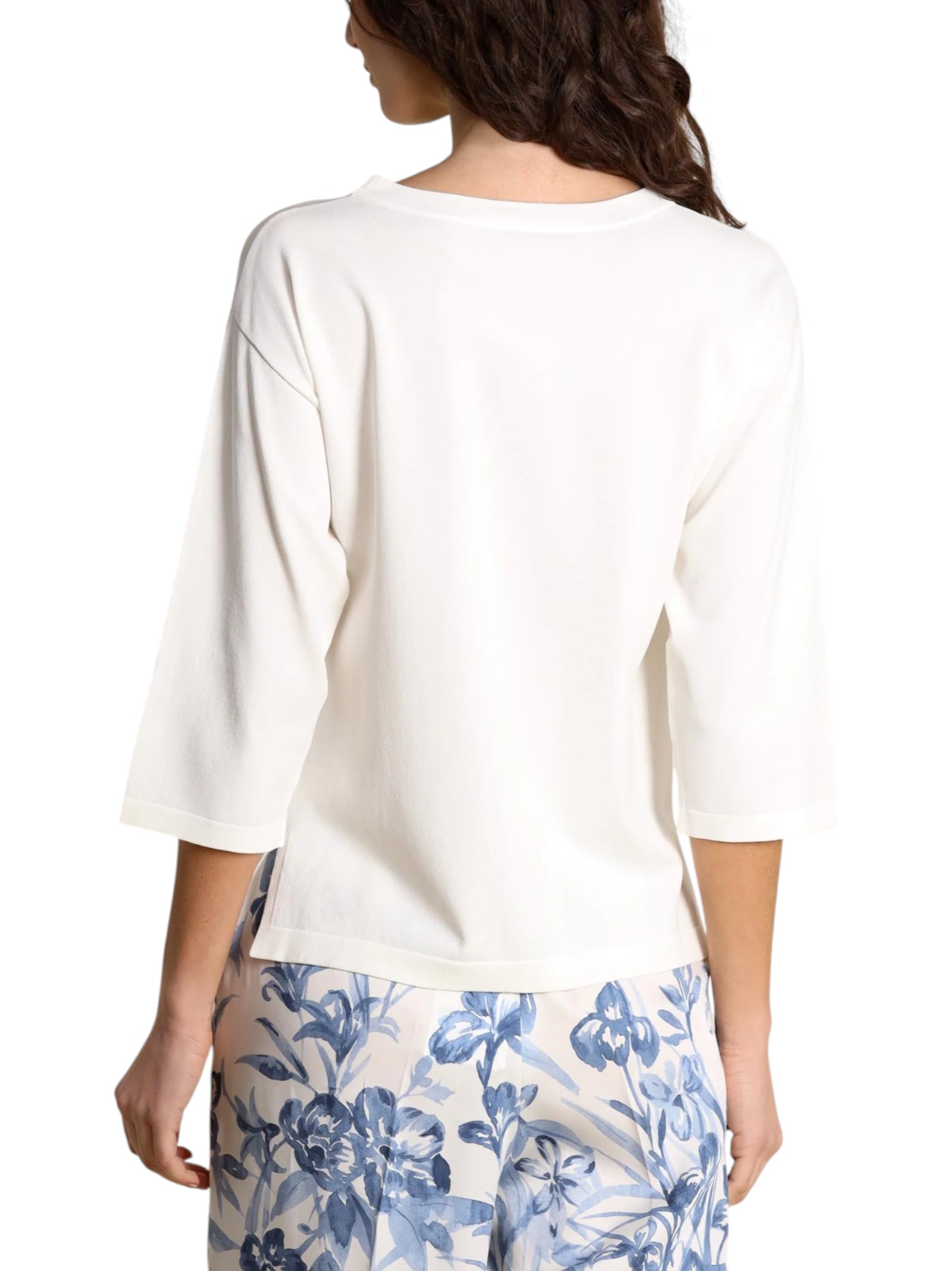 Maglia bianca in misto viscosa, scollo stondato, linea dritta, maniche tre quarti, giro sceso, spacchi laterali,