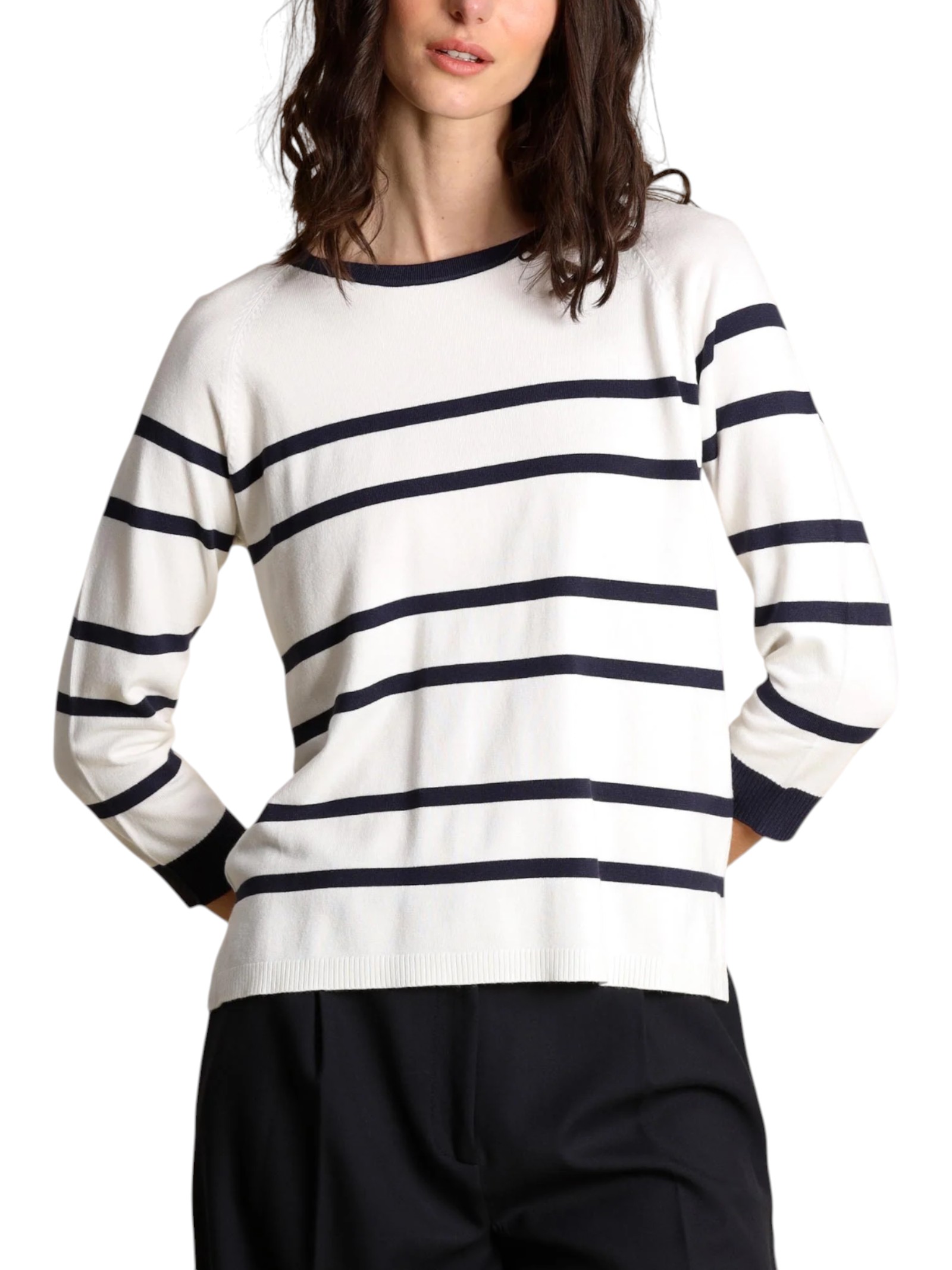 Evoluzione contemporanea della maglia marinière, in una morbida viscosa stretch e con un gioco di righe a contrasto sul busto. Perfetta sempre, chic ogni giorno.