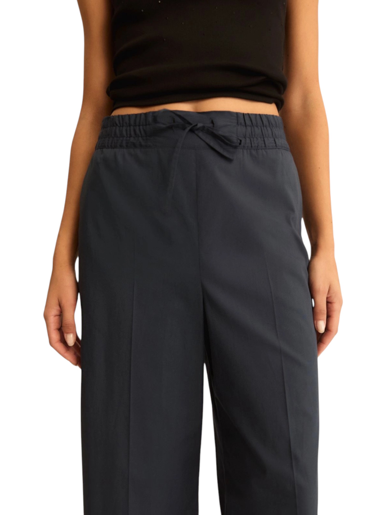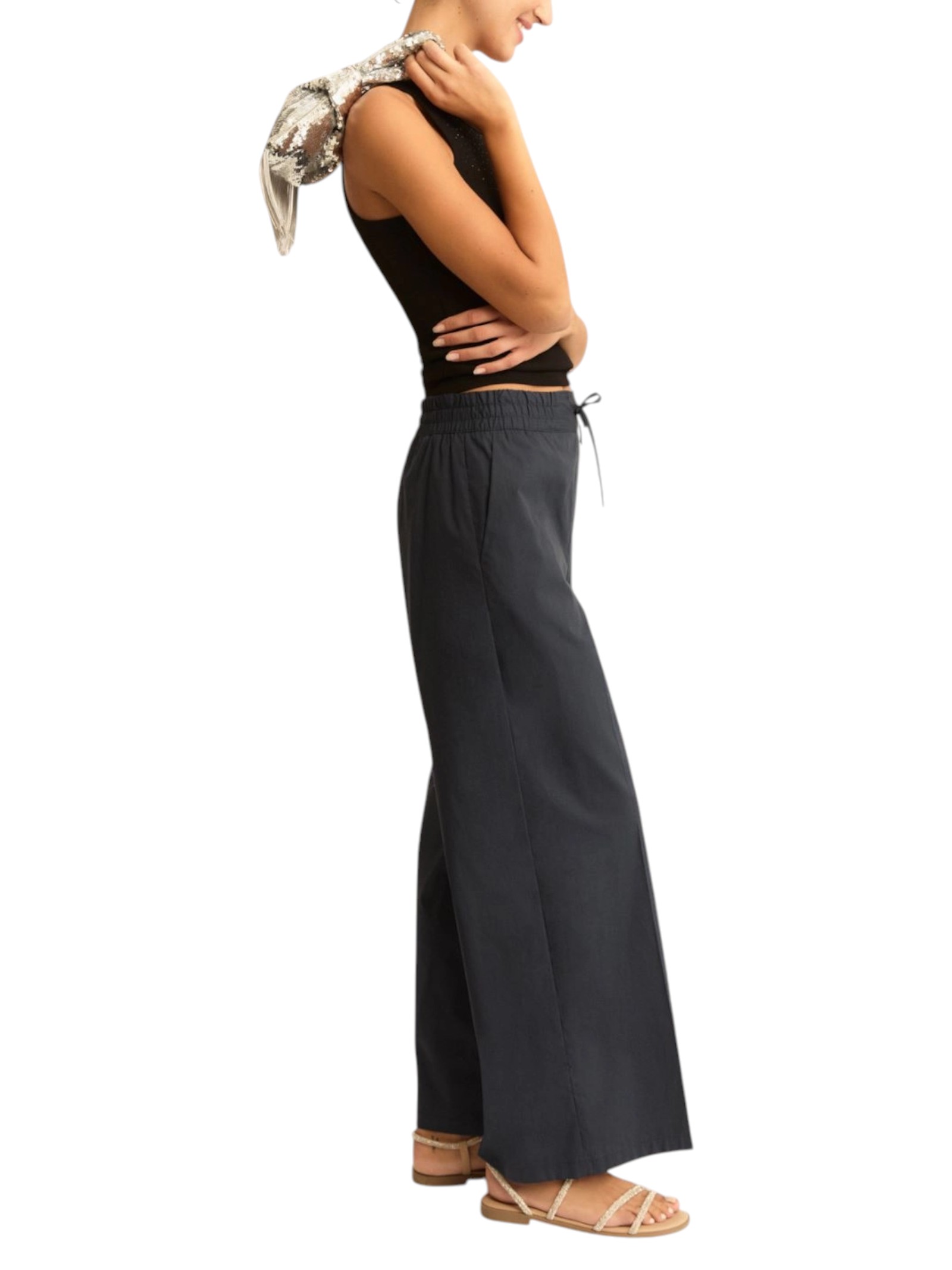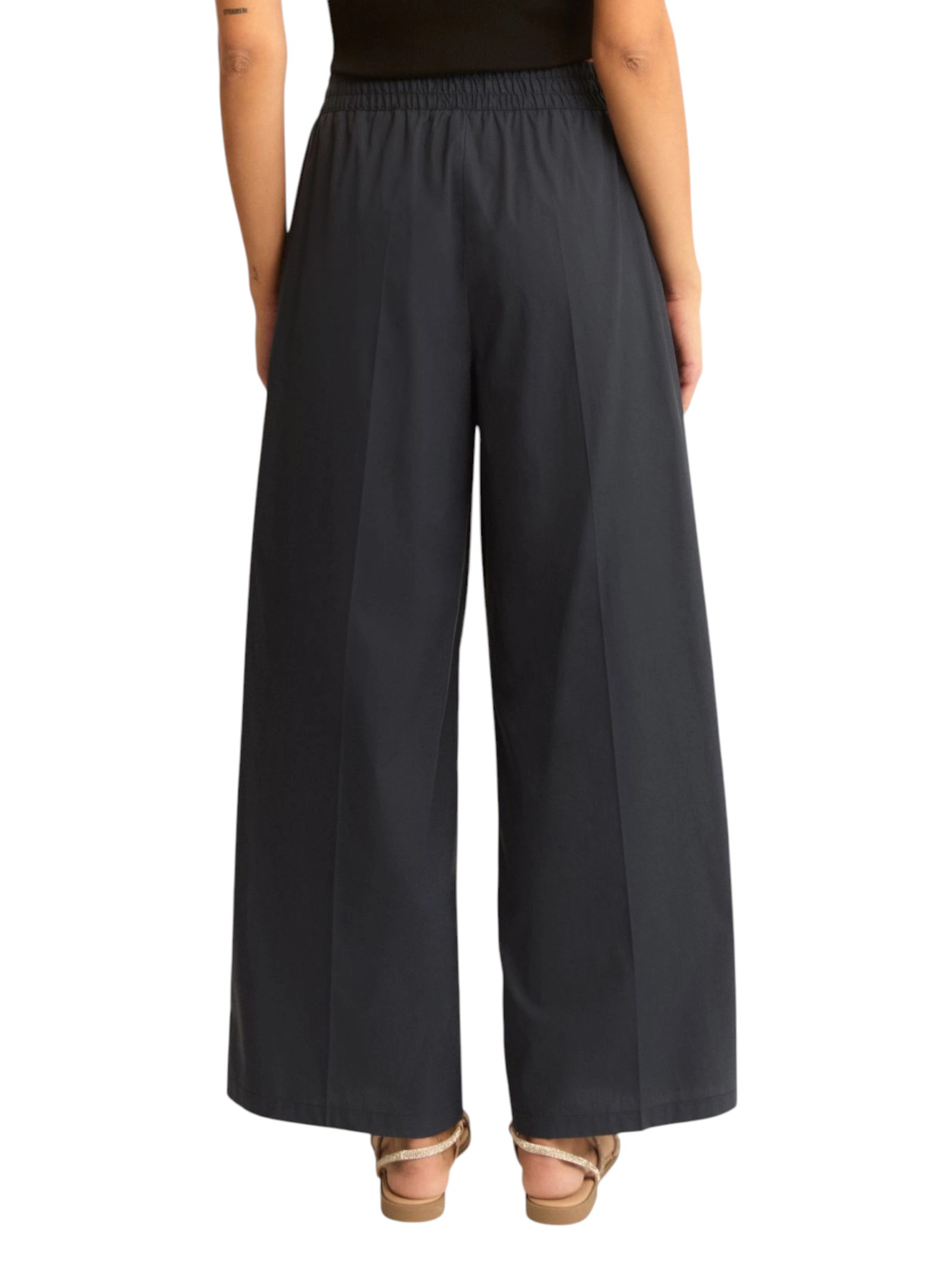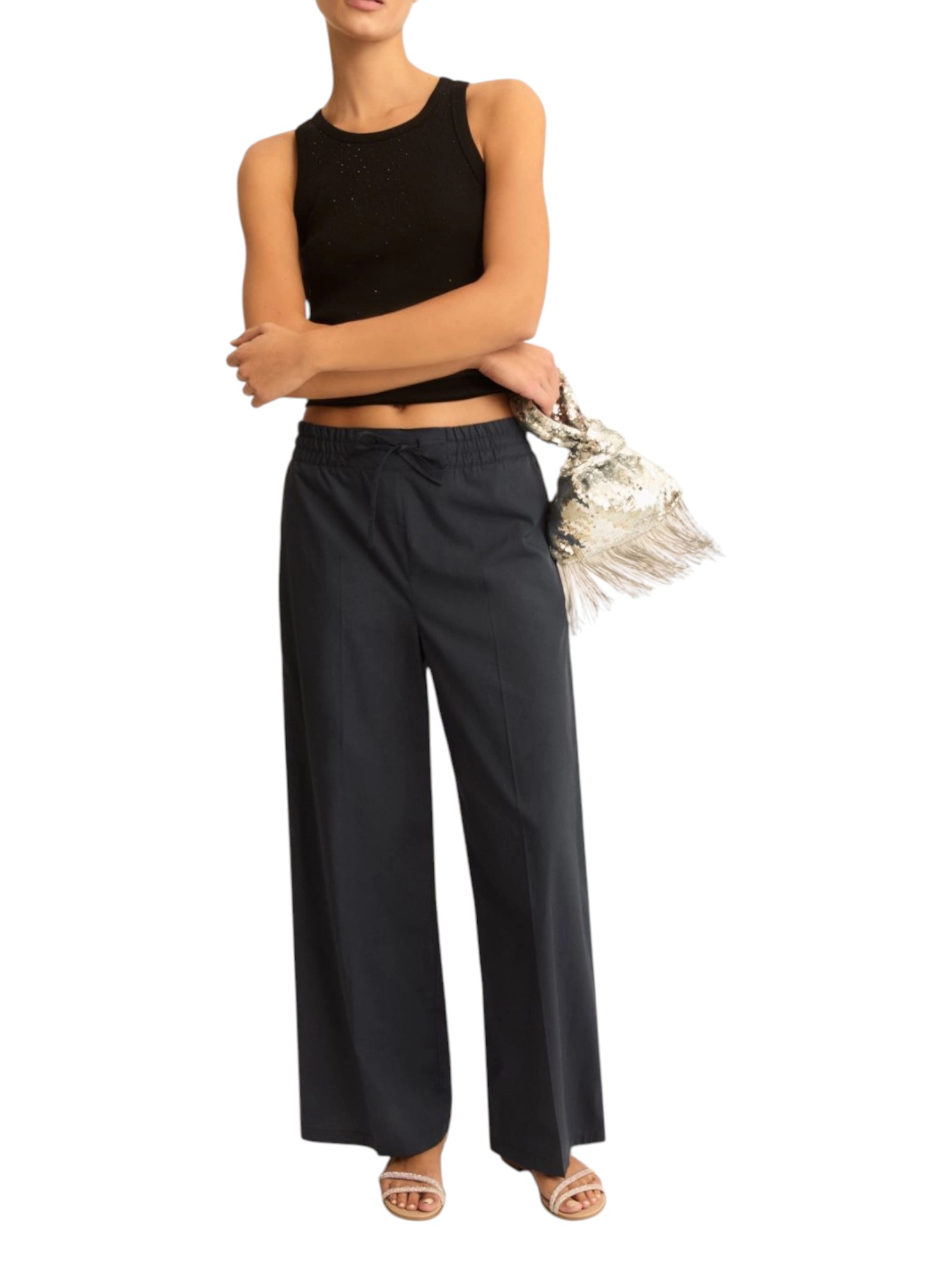 Pantalone wide leg interpretato con inserto elastico e coulisse in vita, per un mood rilassato e metropolitano. Aggiungi una blusa crop e una clutch per affrontare le tue giornate.