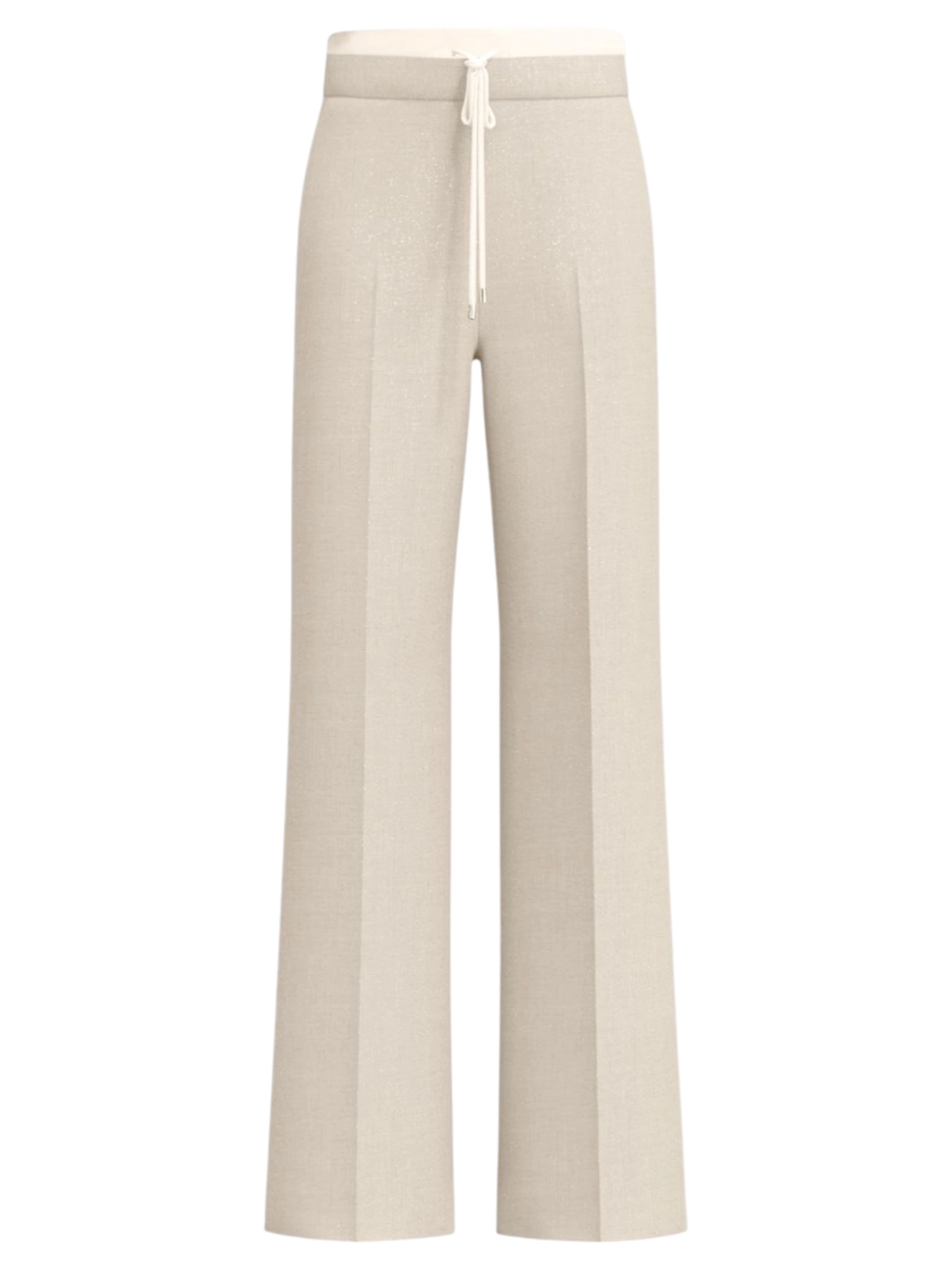 La fluidità della viscosa, il tocco brillante del lamé: questo pantalone sorprende per la ricchezza del materiale ma anche per i dettagli della costruzione, con doppio cintone in vita con dettaglio a contrasto in raso leggero.