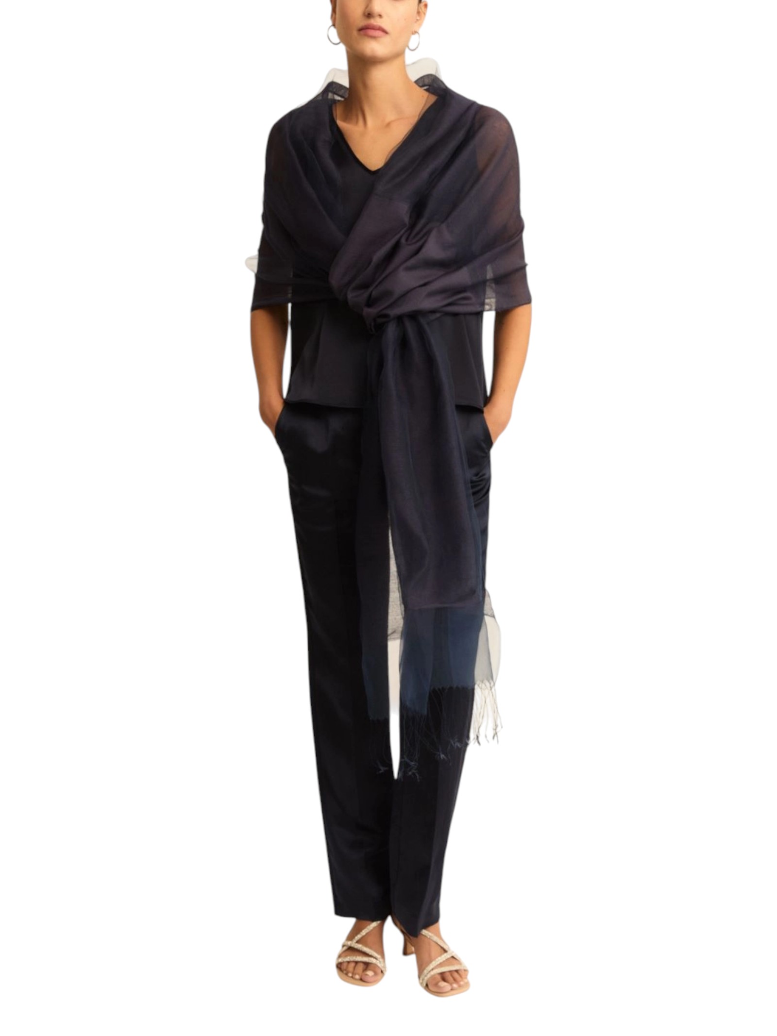 Pensato per la cerimonia e le occasioni più eleganti, questo pantalone mixa una linea femminile con un raso leggero di viscosa e lino. Abbinalo allo slip top on tone e allo spolverino in pizzo per una mise che attira lo sguardo.