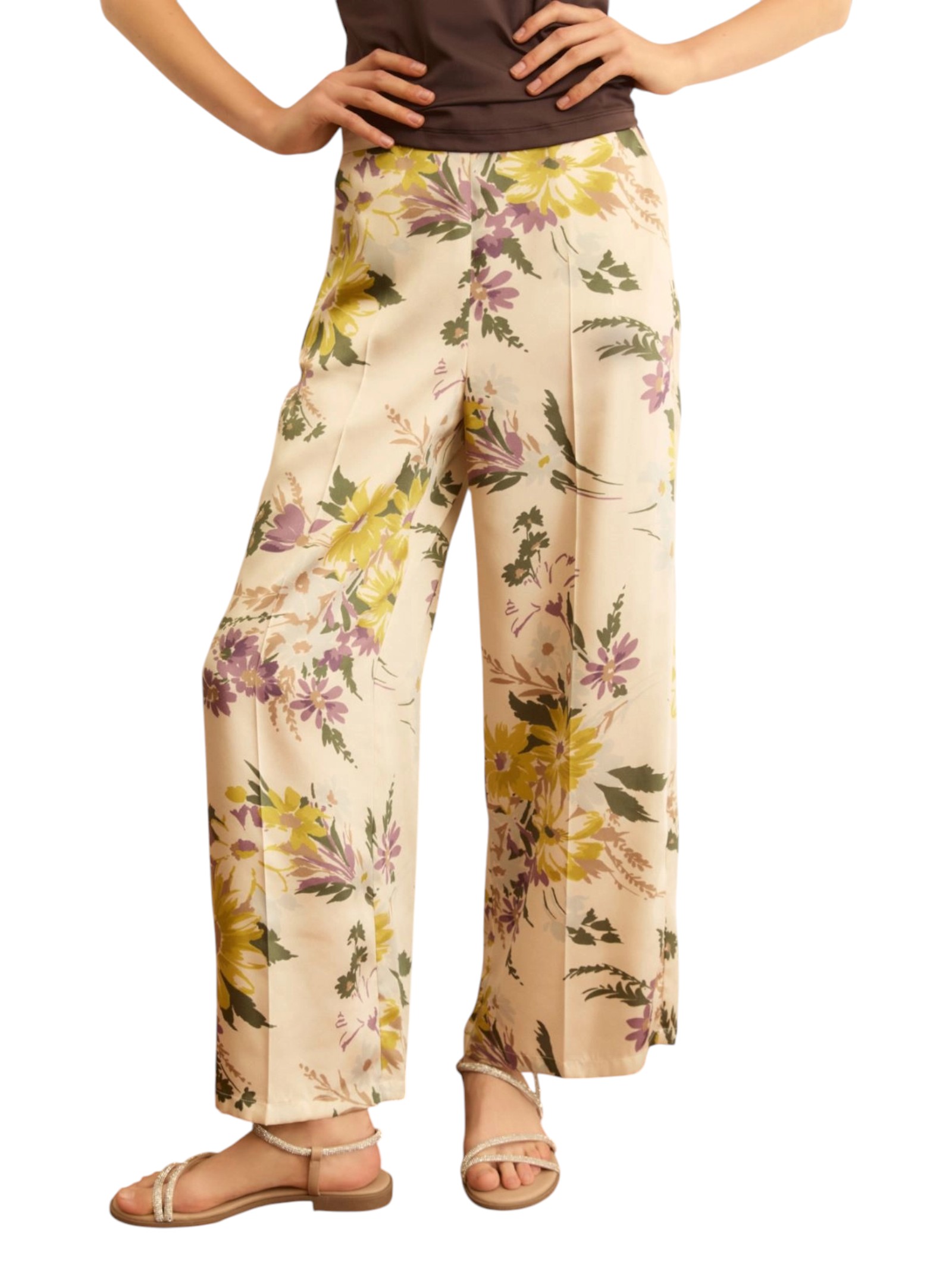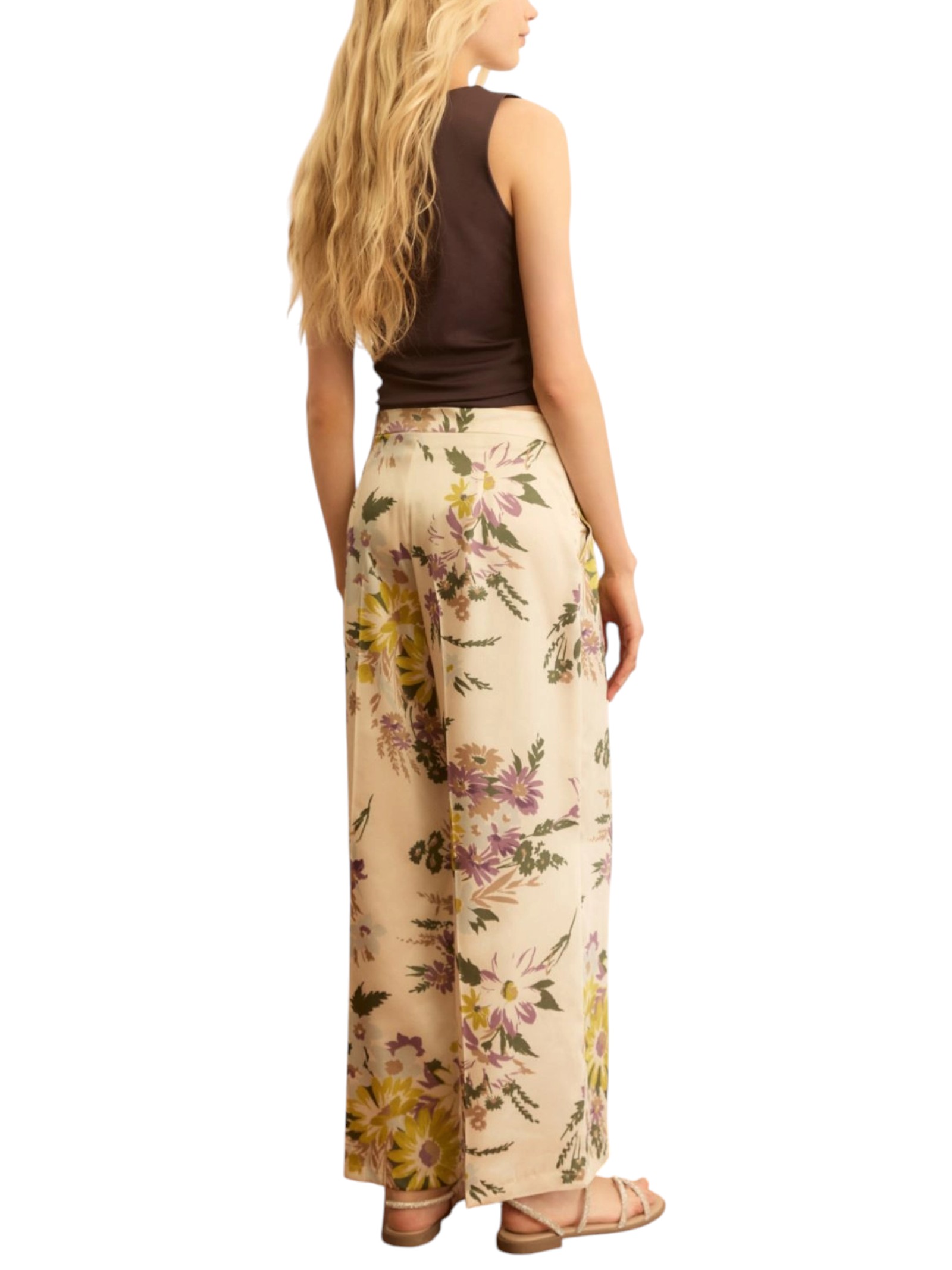 Fiori romantici e linee morbide accompagnano questo pantalone in twill fluido. Da abbinare a top coordinati e sandali, per un'estate all'insegna della leggerezza.