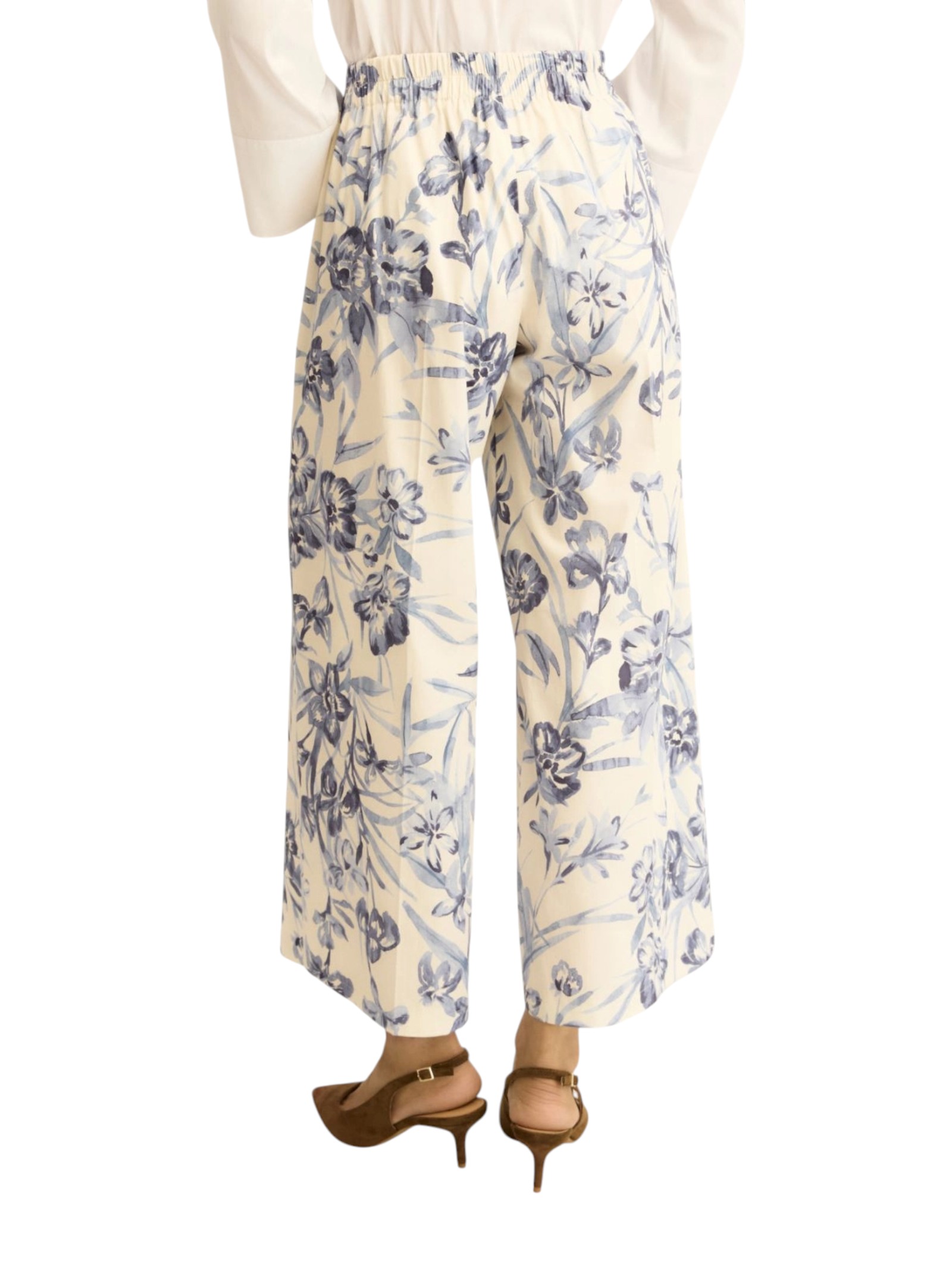 Pantaloni dal fit dritto, proposti in raso di cotone stretch con una macro stampa floreale. Pensati per la bella stagione, si completano con un blazer smanicato e sandali flat.