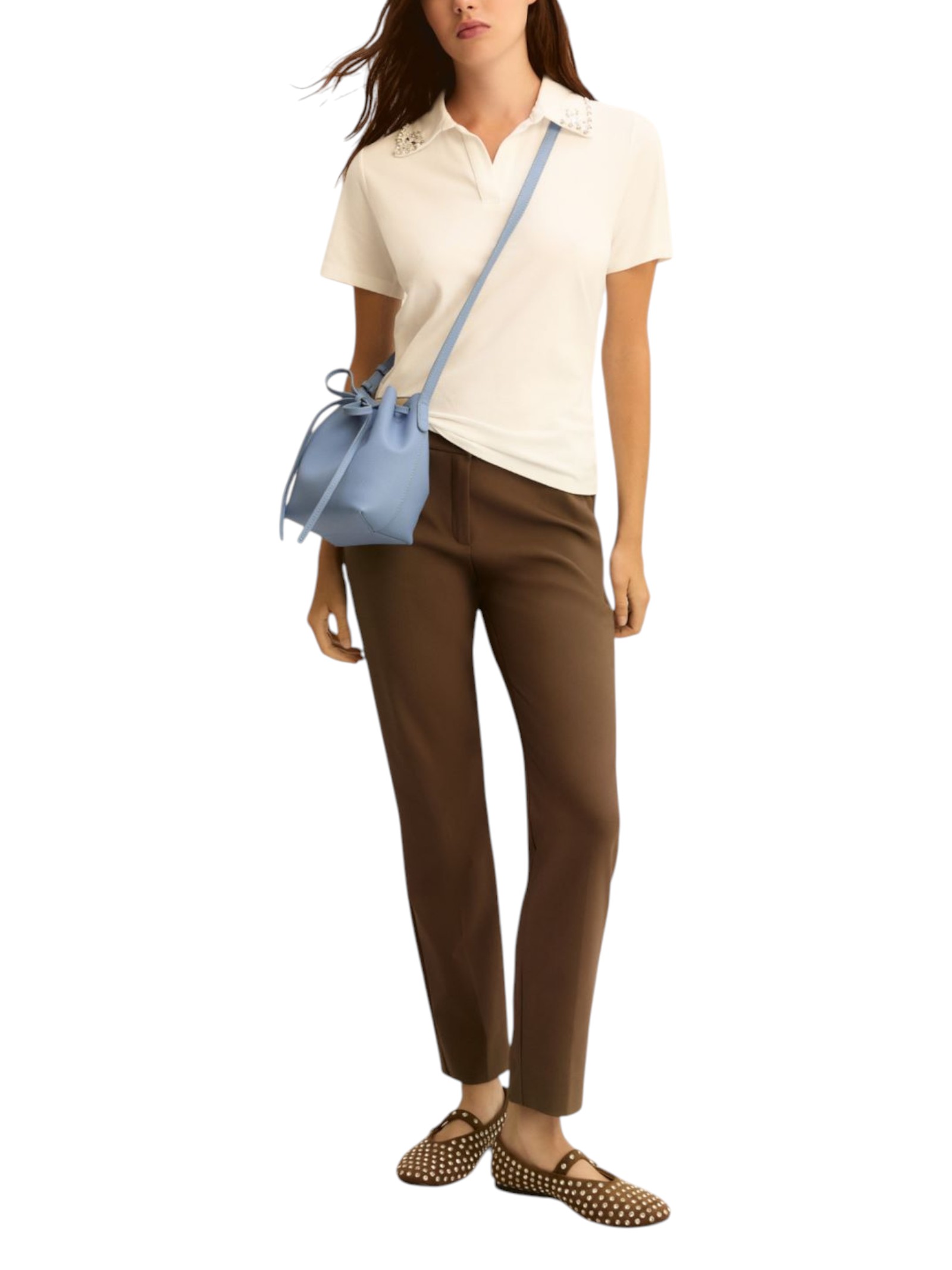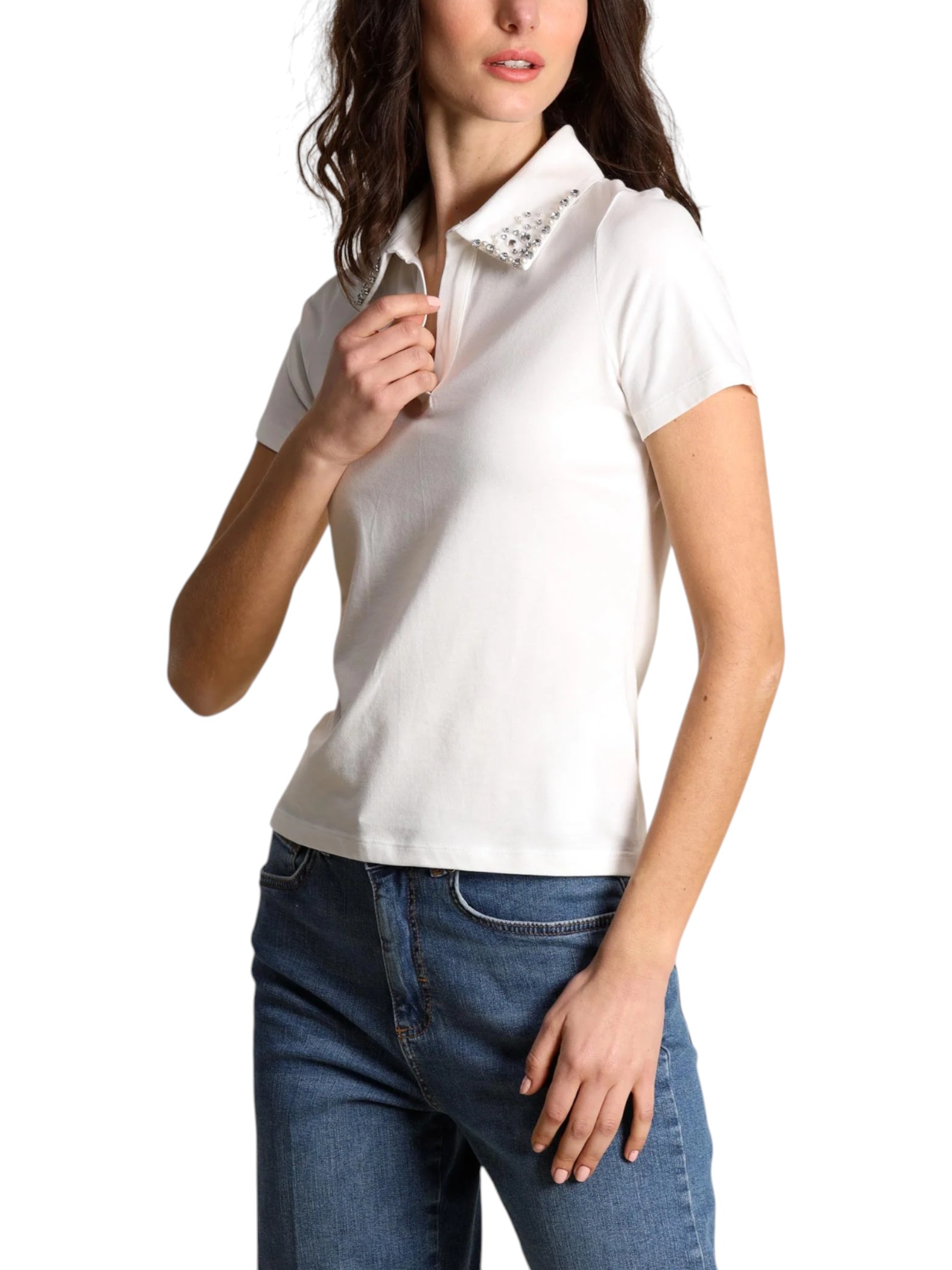Casual nella costruzione, glamour nei dettagli: nuova polo in cotone stretch, con la classica apertura a V decorata da perle bijoux e cristalli ricamati. Un tocco di luce che rende speciale i tuoi look.