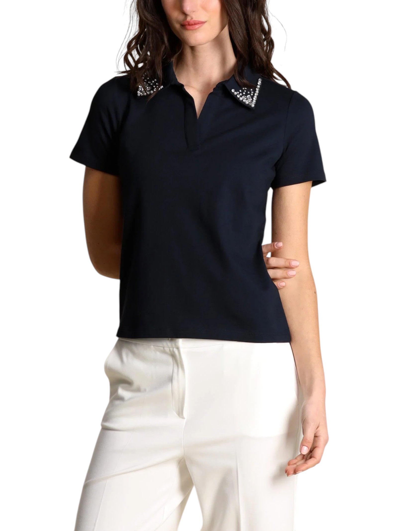 Casual nella costruzione, glamour nei dettagli: nuova polo in cotone stretch, con la classica apertura a V decorata da perle bijoux e cristalli ricamati. Un tocco di luce che rende speciale i tuoi look.