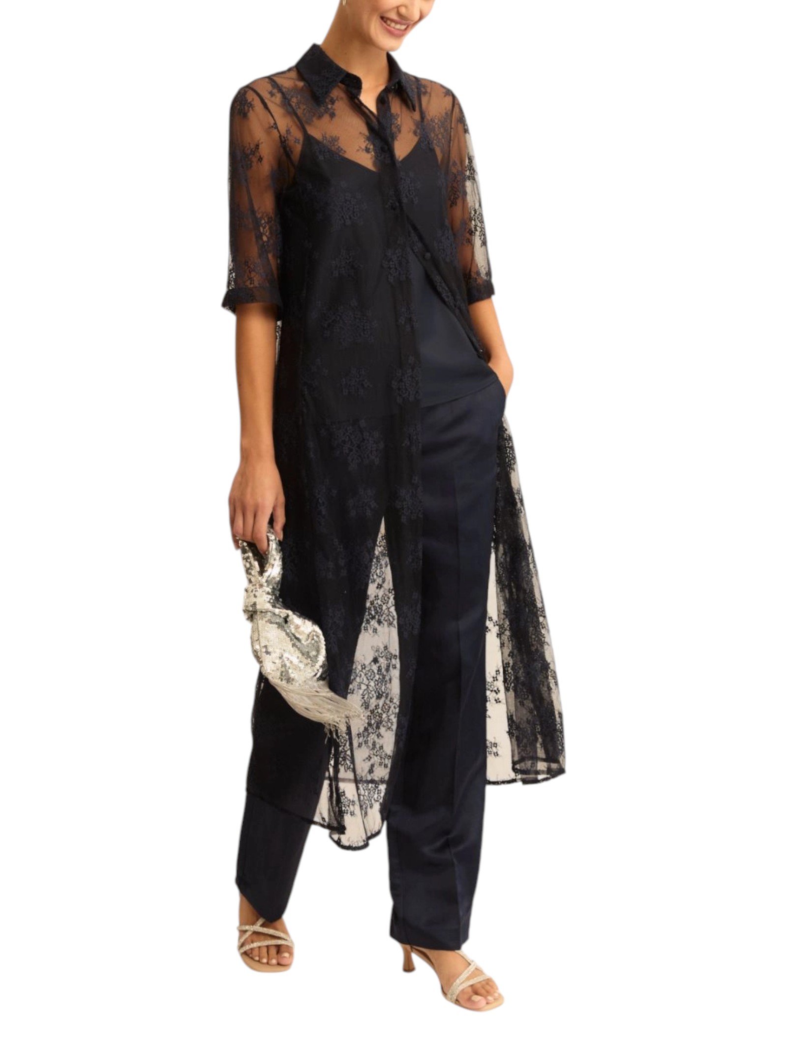 Trasparenze e pizzo sono dettagli di seduzione: in questo set la canottina lascia scoperte le spalle mentre lo chemisier diventa il protagonista, da indossare aperto o in sovrapposizione.