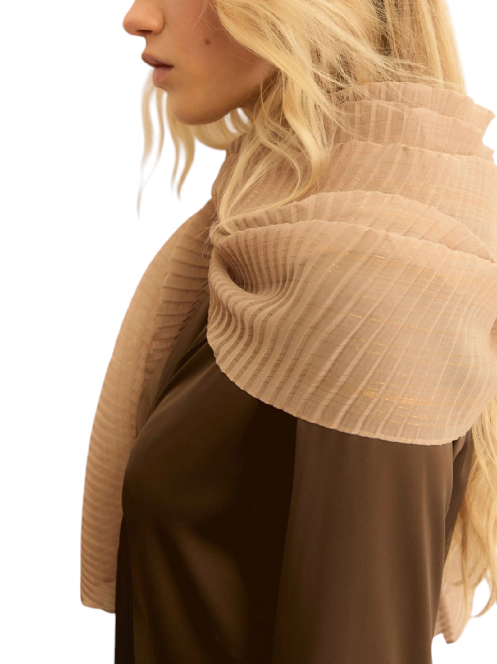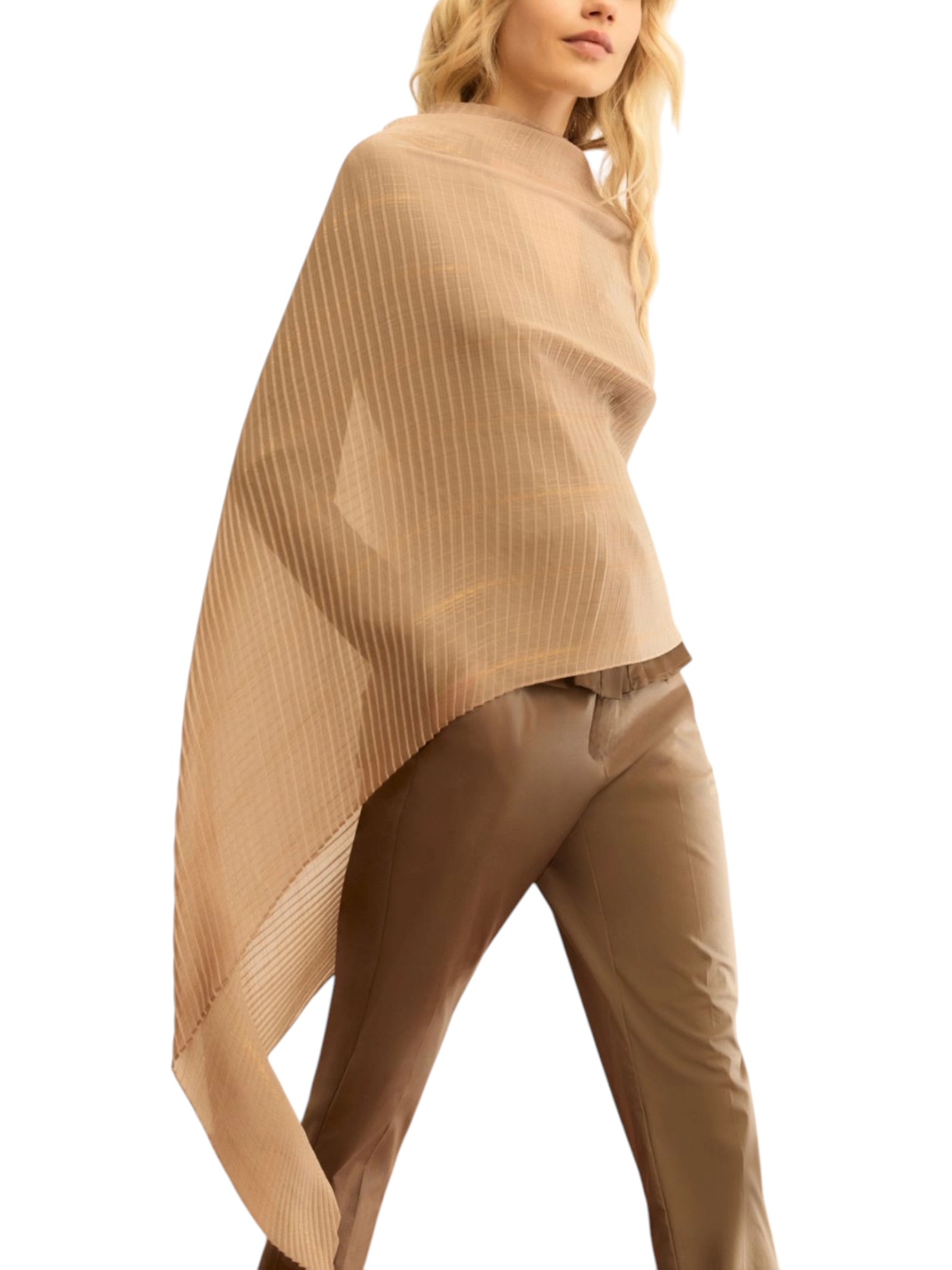Un gesto di cura, con un tocco glamour: nuova stola plissé, con un filo di lamé in trama per un effetto brillante su spalle e viso. Da avvolgere morbidamente per proteggere dal sole, o dalla brezza serale.