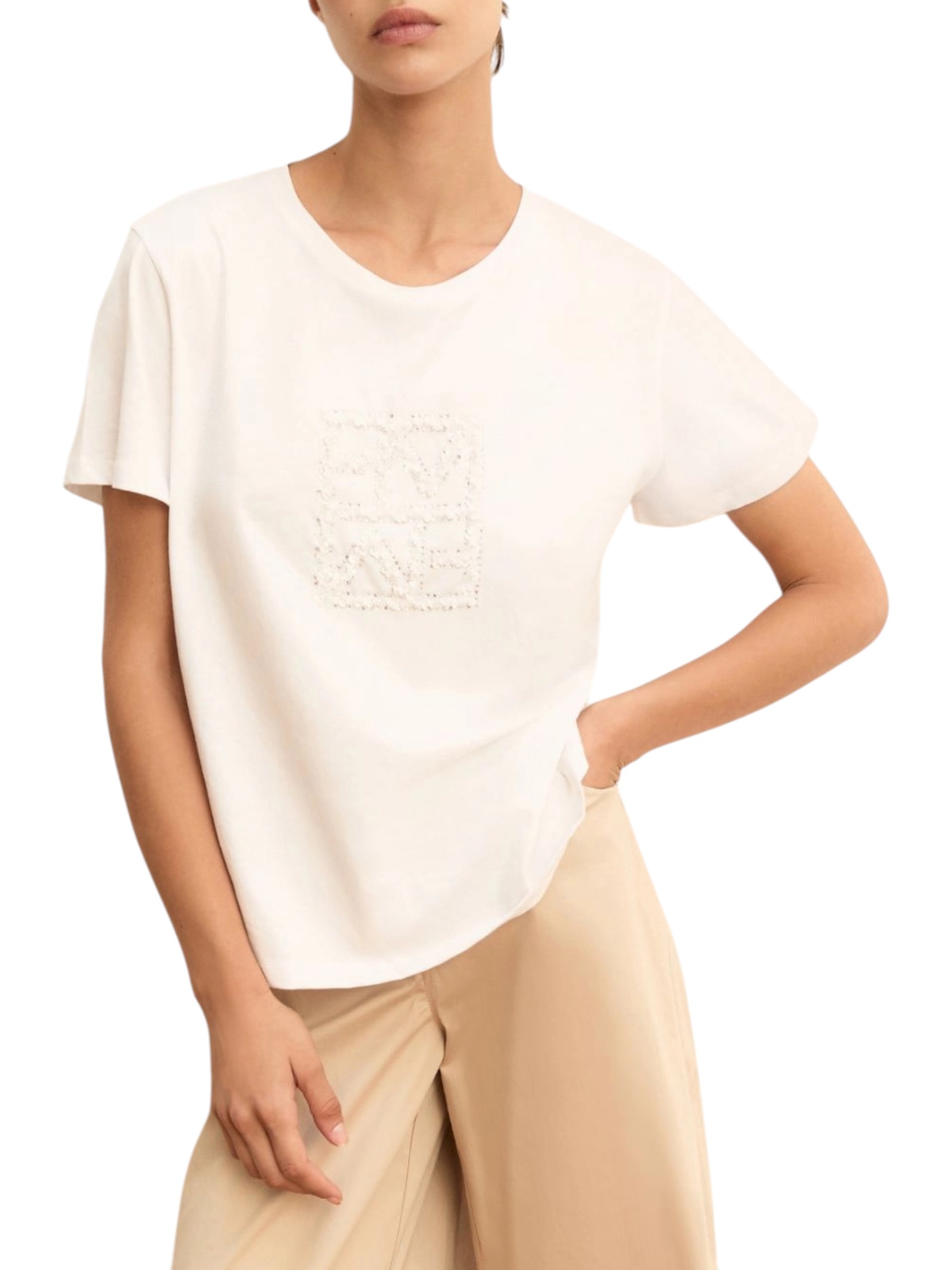 Aggiungi una nota brillante ai tuoi look estivi, con questa t-shirt in morbido jersey di cotone decorata con logo Emmegram in paillette ricamate. Piccoli glamour quotidiani.