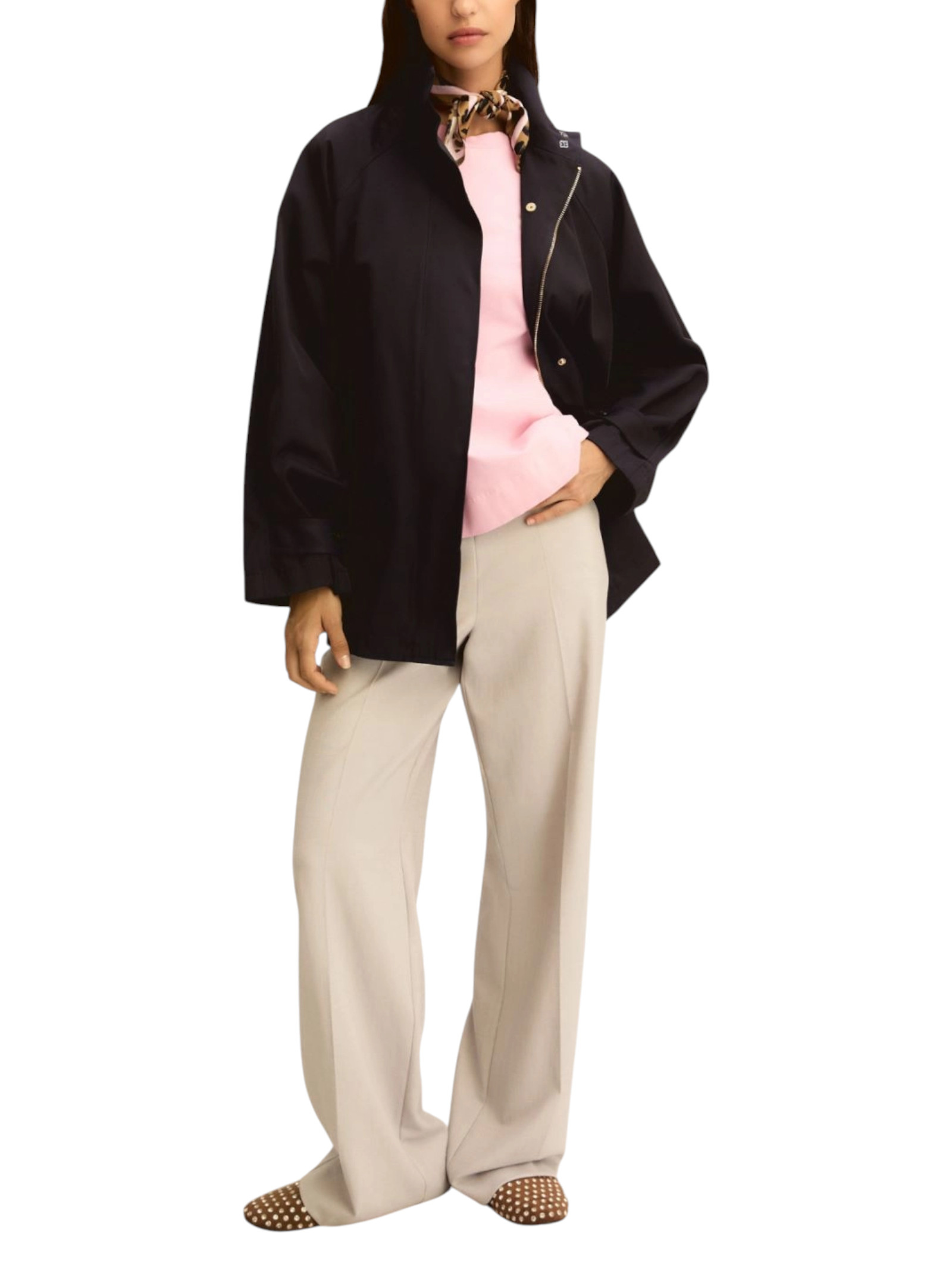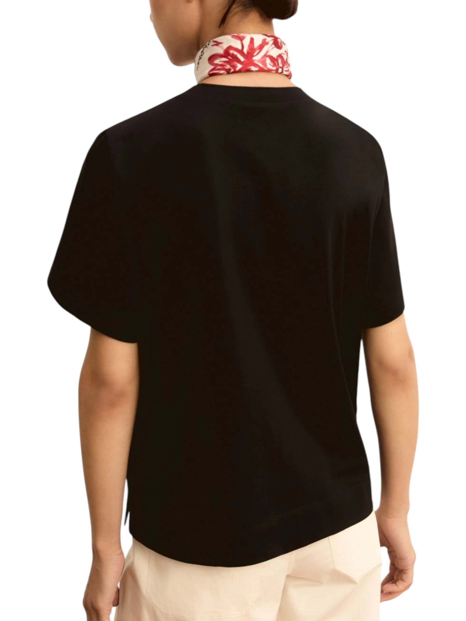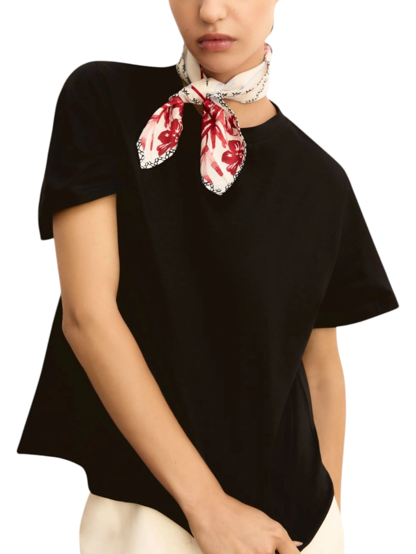 Indispensabile nella bella stagione, la t-shirt in cotone stretch viene proposta in abbinamento con un mini foulard colorato, da annodare al collo. Lo styling è già pronto.