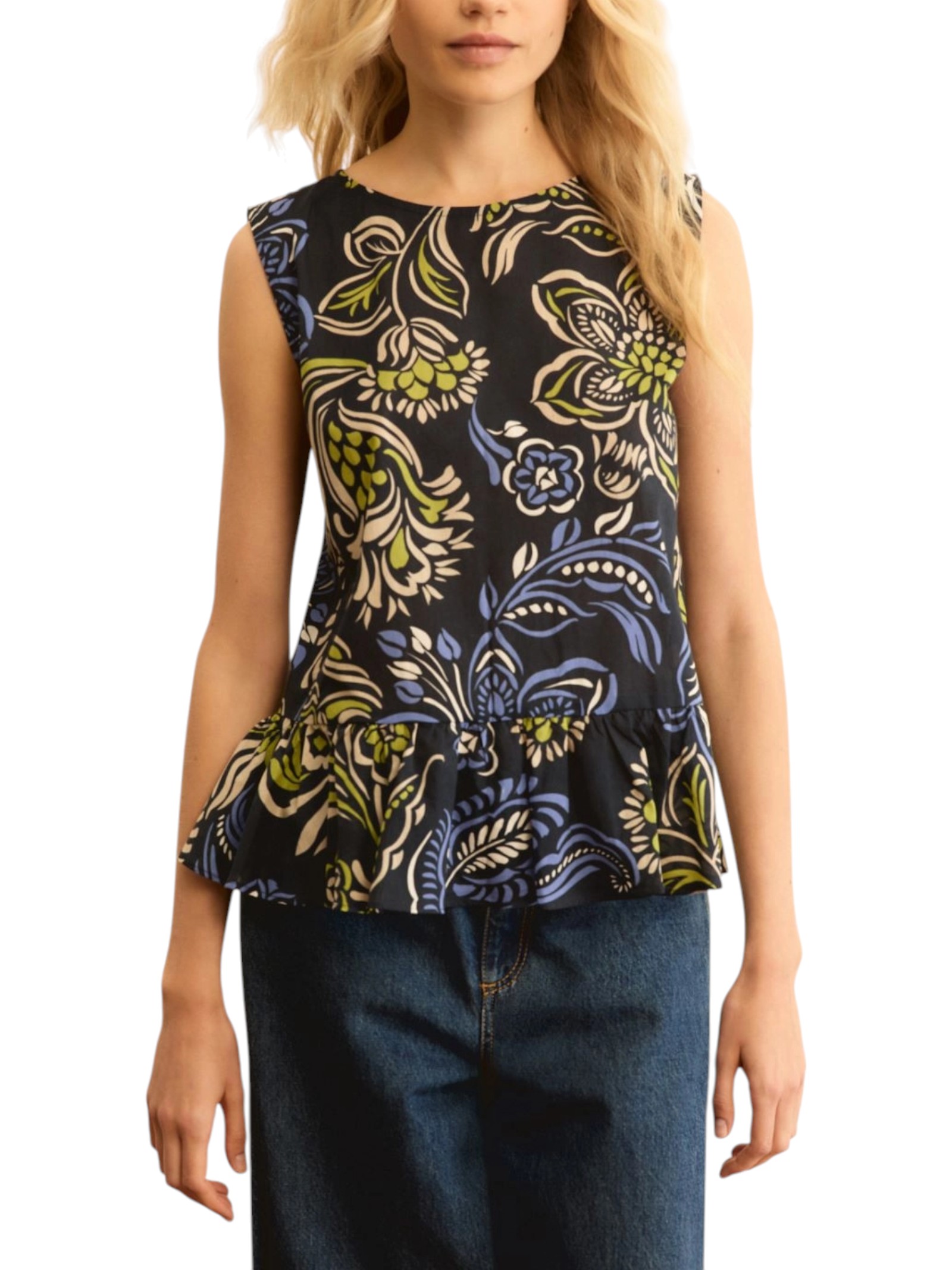 Top smanicato con balza emmombrina