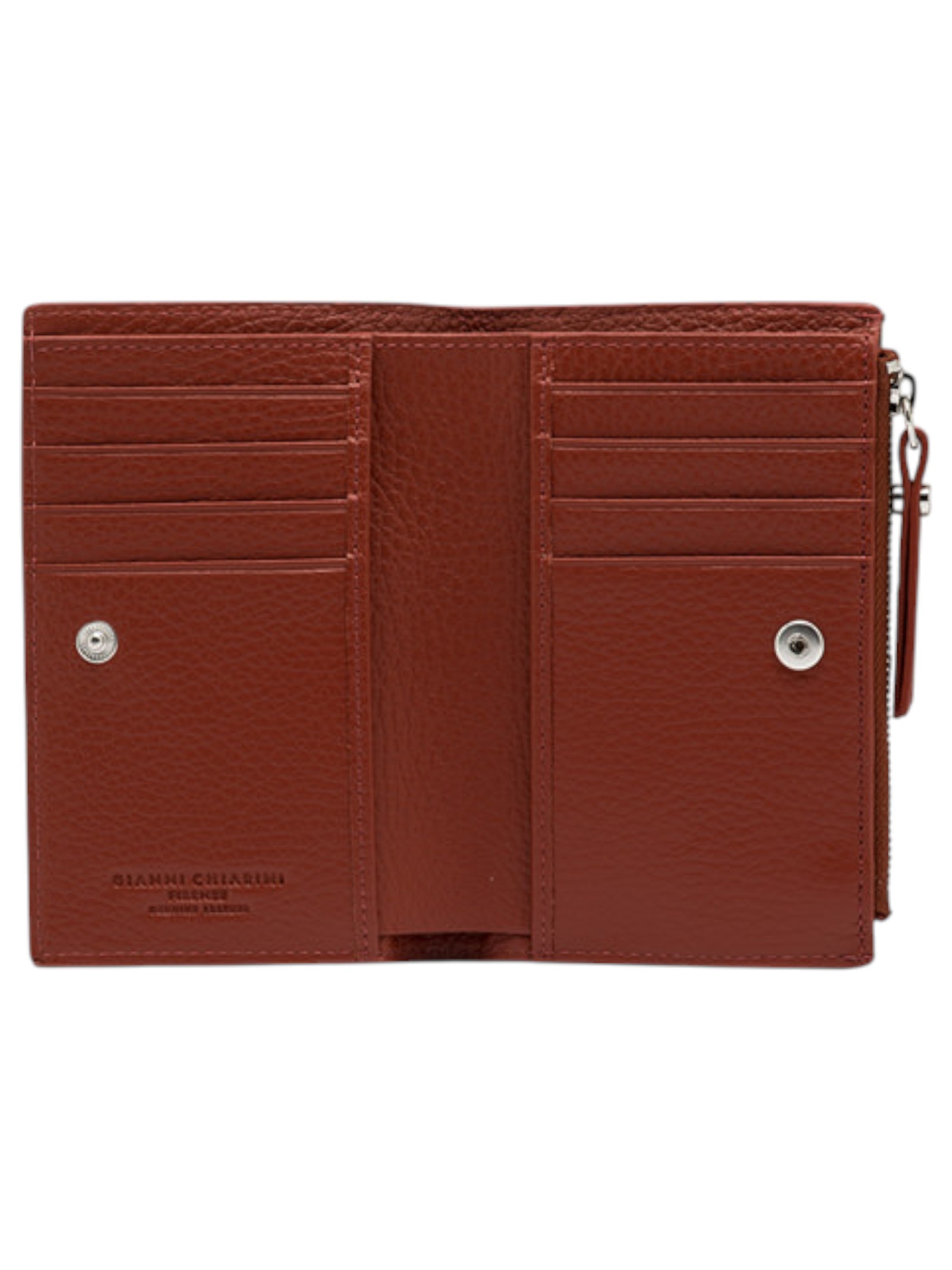 Il portafoglio di Gianni Chiarini Firenze è realizzato in pregiata pelle martellata, morbida al tatto. Dotato di una pratica chiusura con zip, presenta all'interno un'ulteriore chiusura con bottone a pressione per maggiore sicurezza. L'interno è ben organizzato con tasche piatte multiuso.