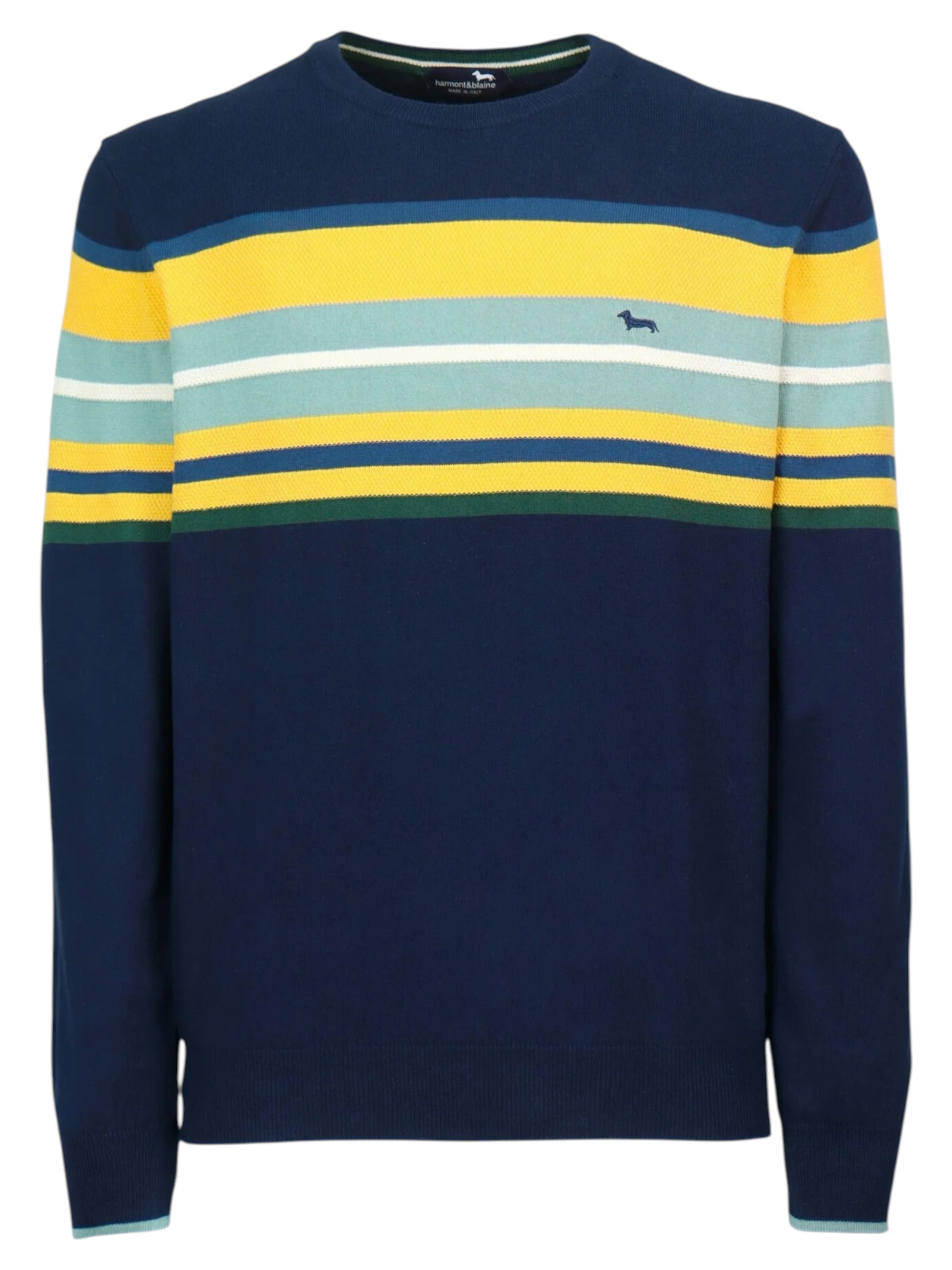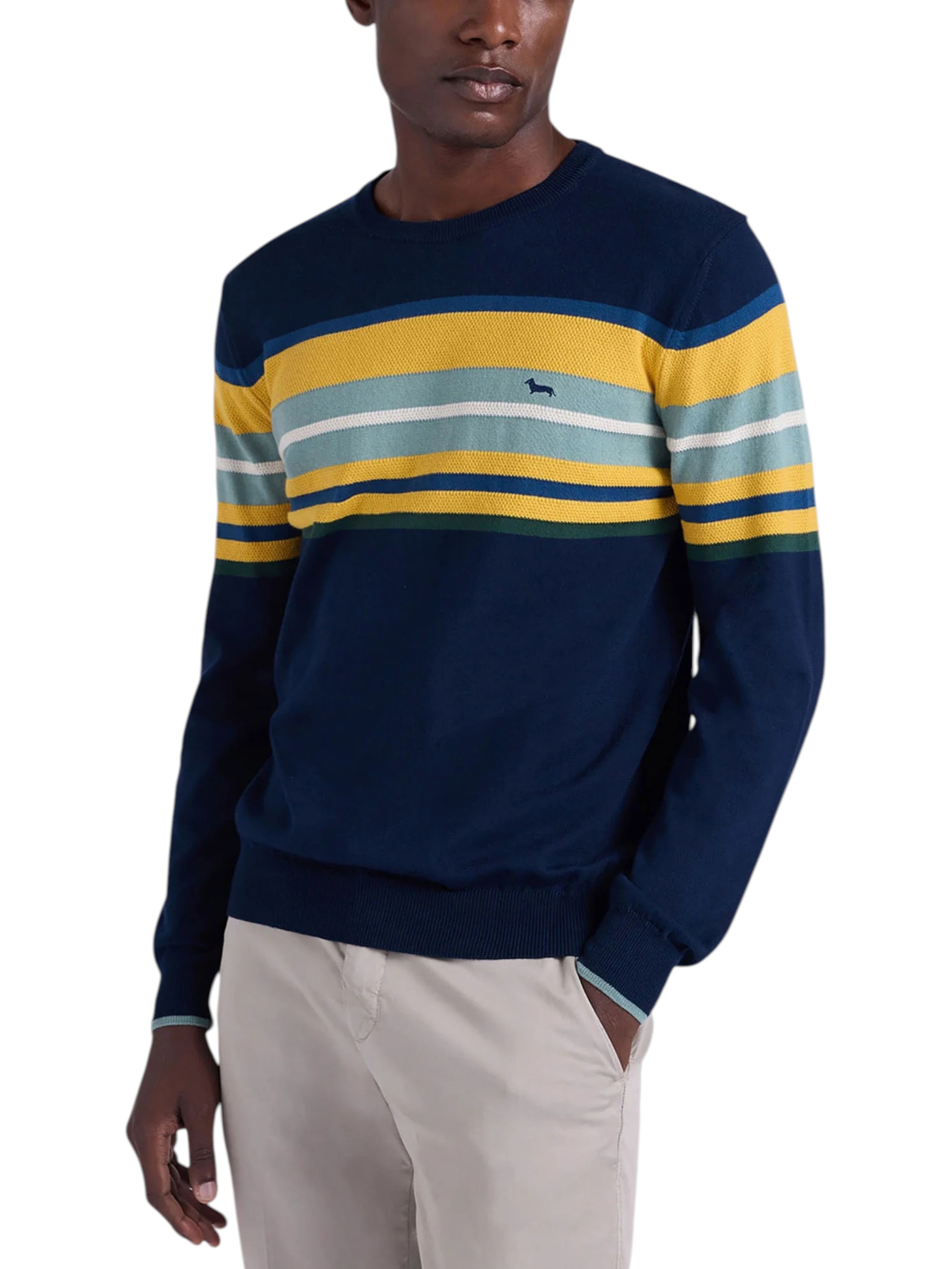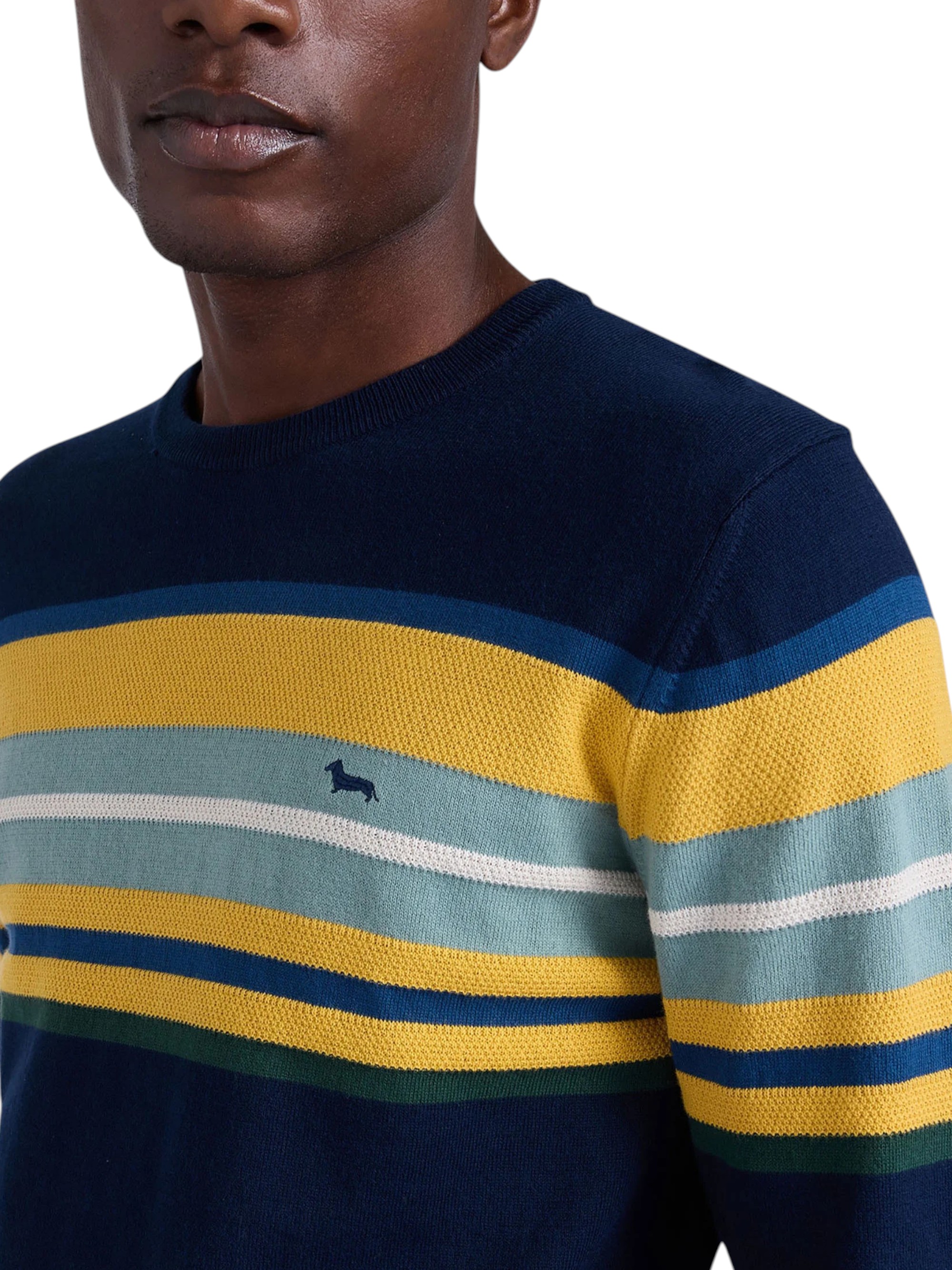 Pullover girocollo con righe a contrasto realizzate con lavorazione 3D, è un capo essenziale per il tuo guardaroba casual. Realizzato in 100% Cotone, questo maglione offre comfort e stile per il tuo Tempo libero. Bassotto ricamato a contrasto lato cuore.