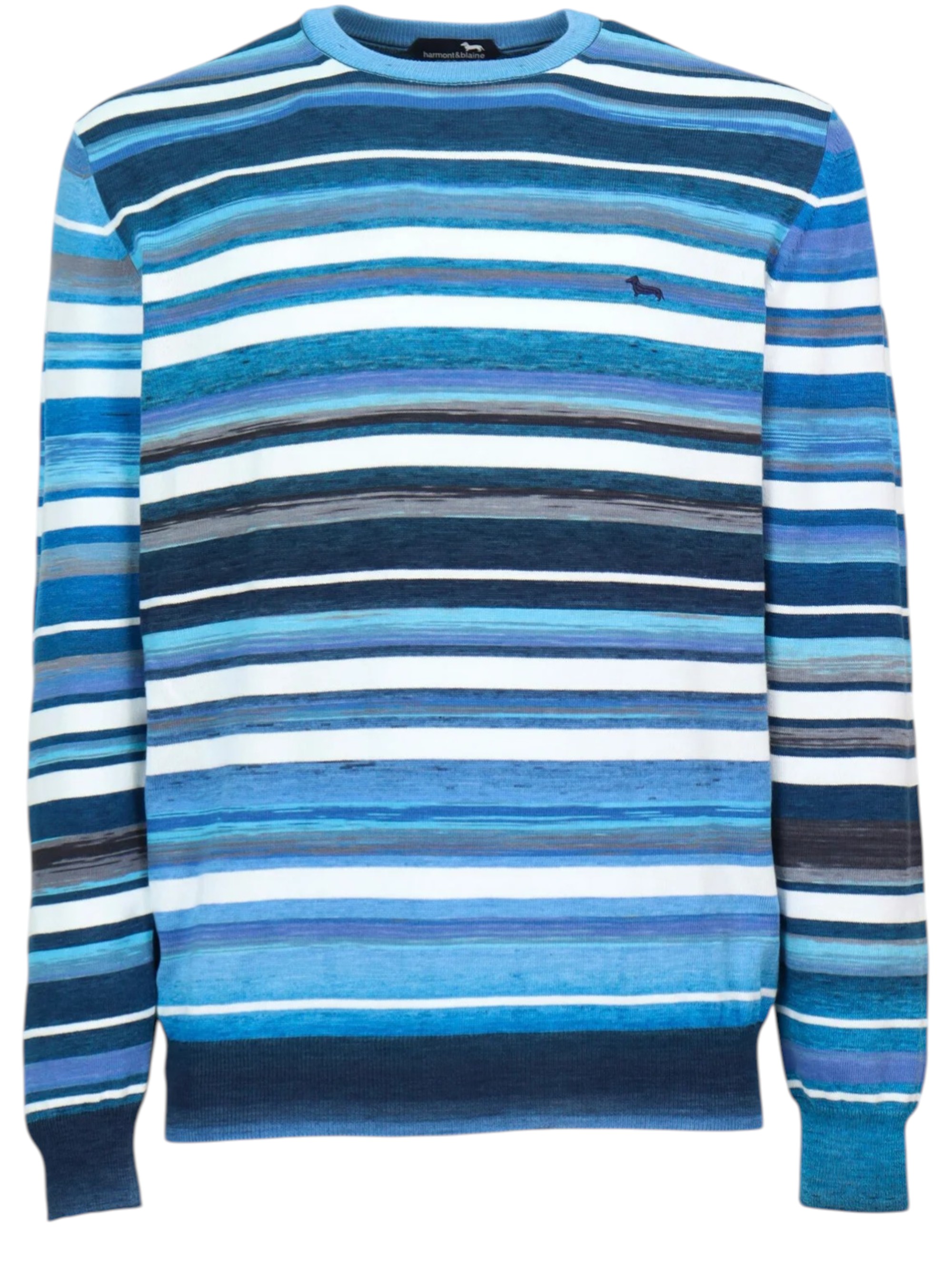 Scopri questo particolare e raffinato pullover uomo con righe sfumate realizzato in puro cotone. Scollo, polsini e fondo a costine e bassotto ricamato lato cuore. Un must-have per chi cerca un look casual ma curato nei dettagli.