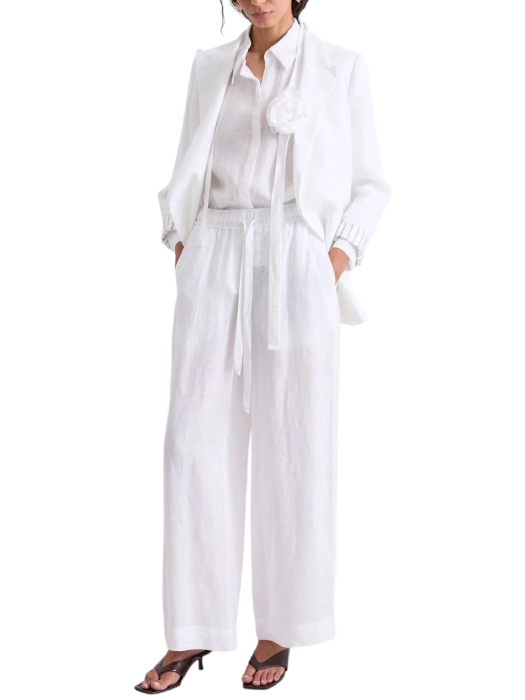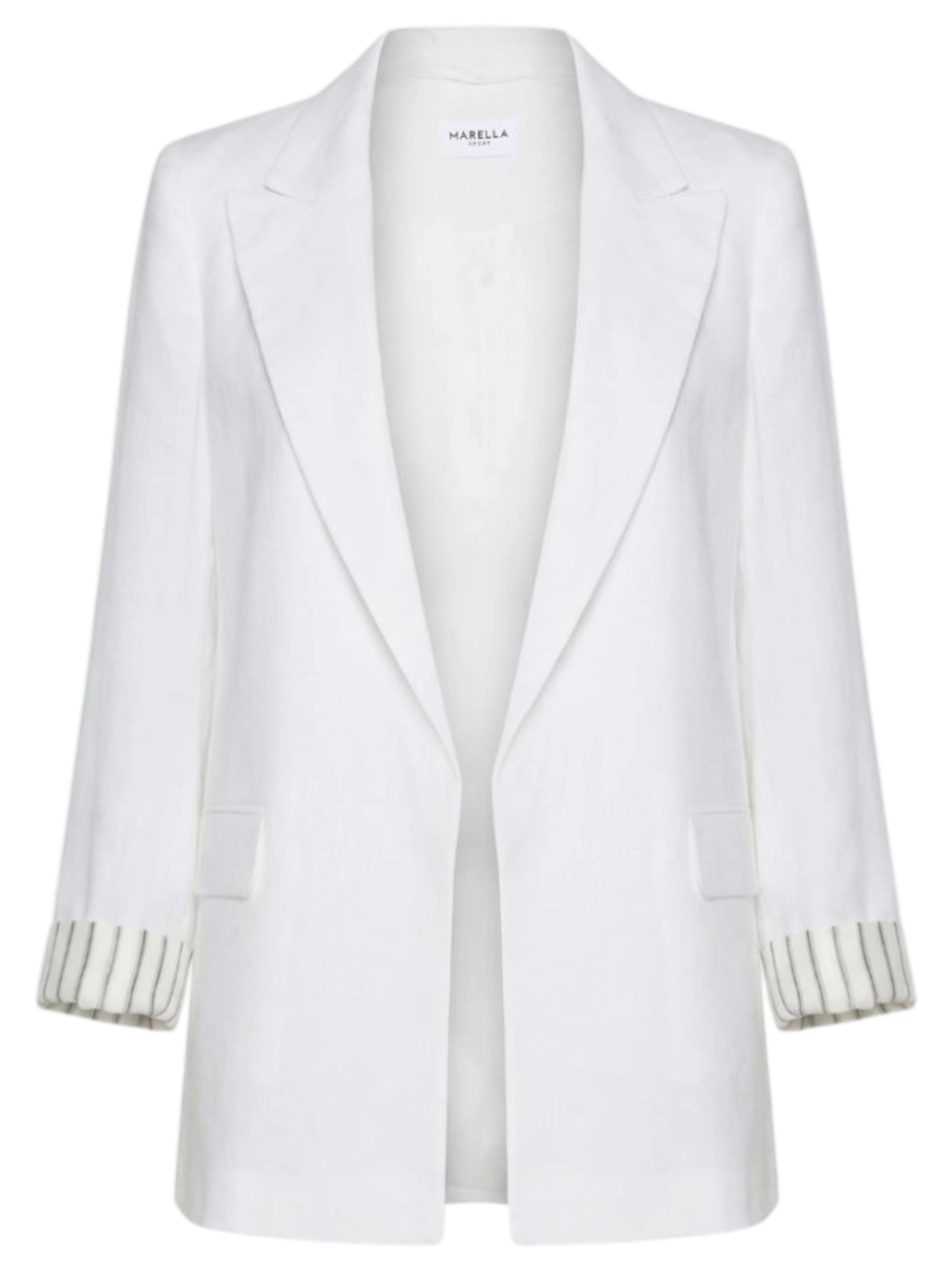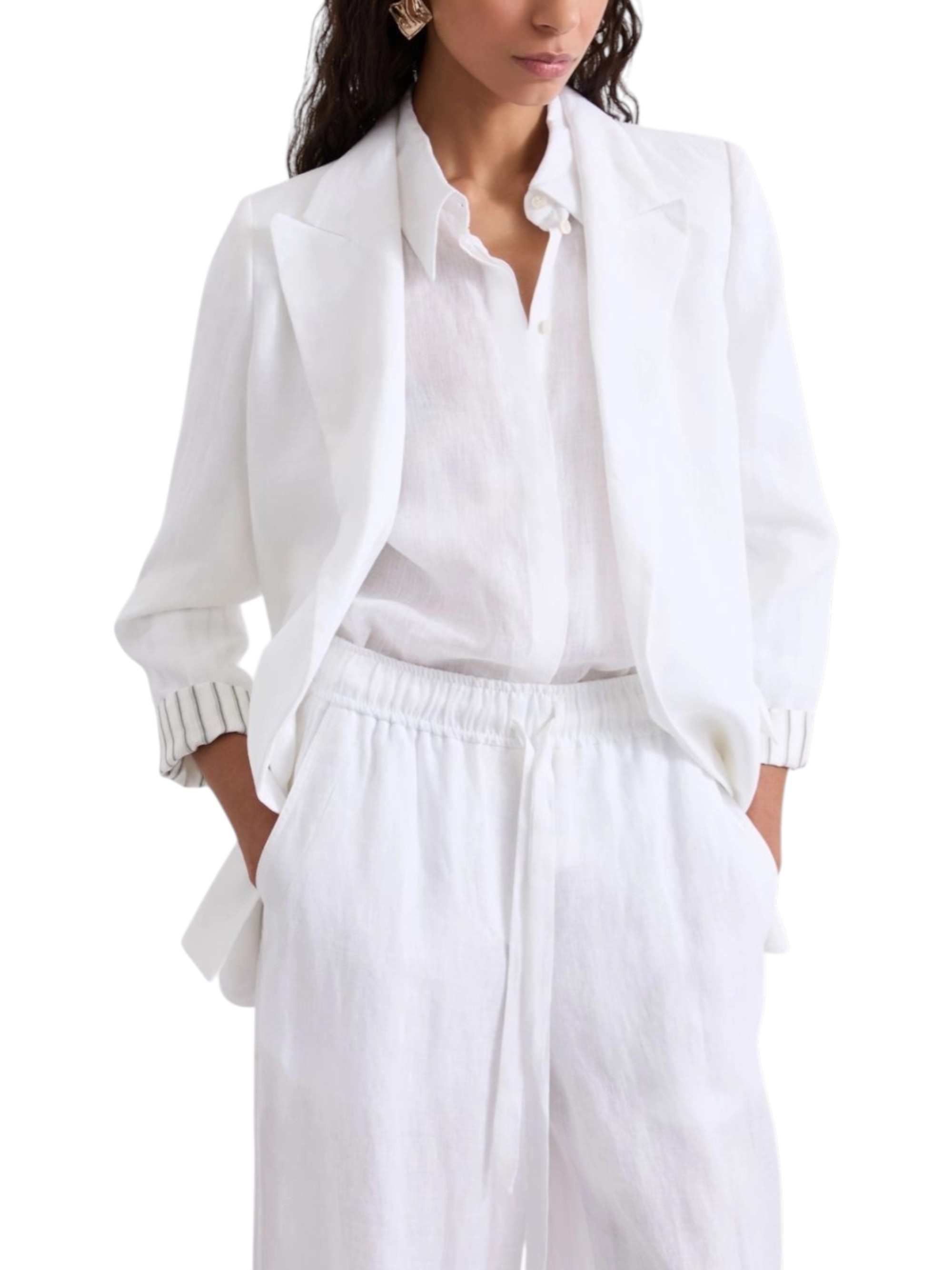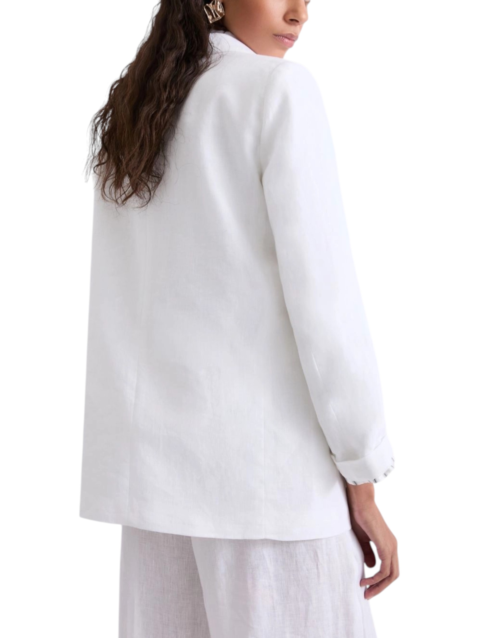 Fluido e leggero, il blazer in puro lino si indossa con maniche rigirate, grazie alla fodera interna a contrasto.