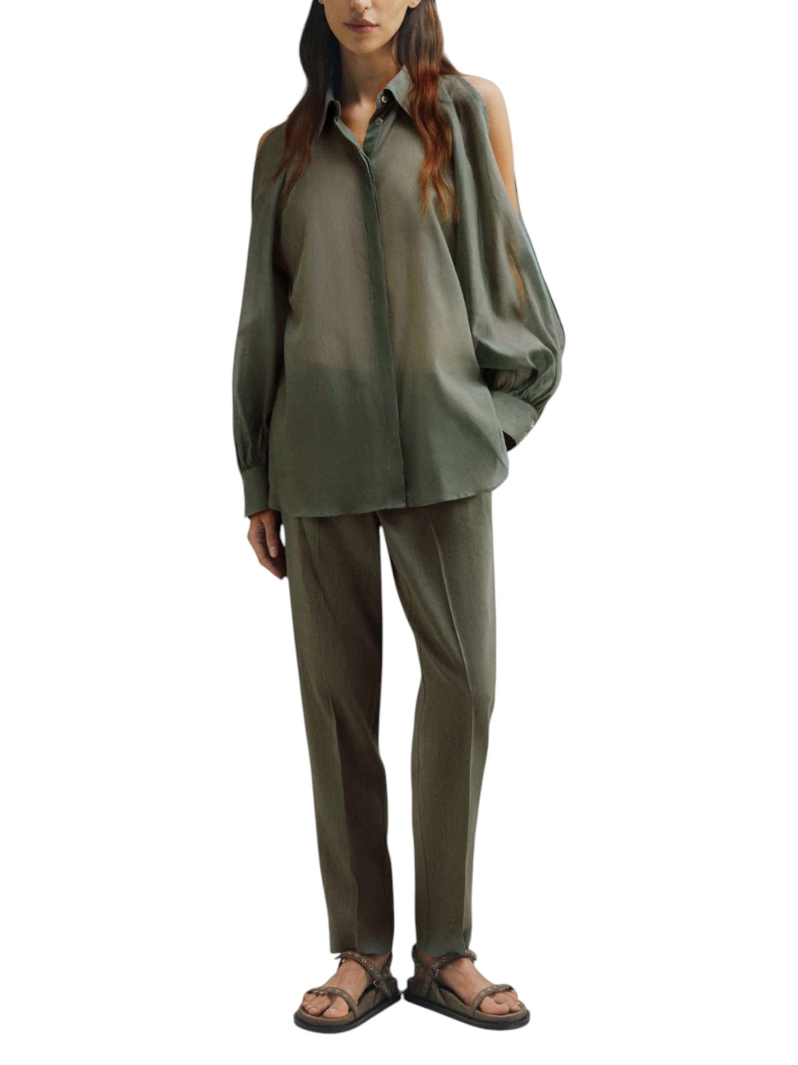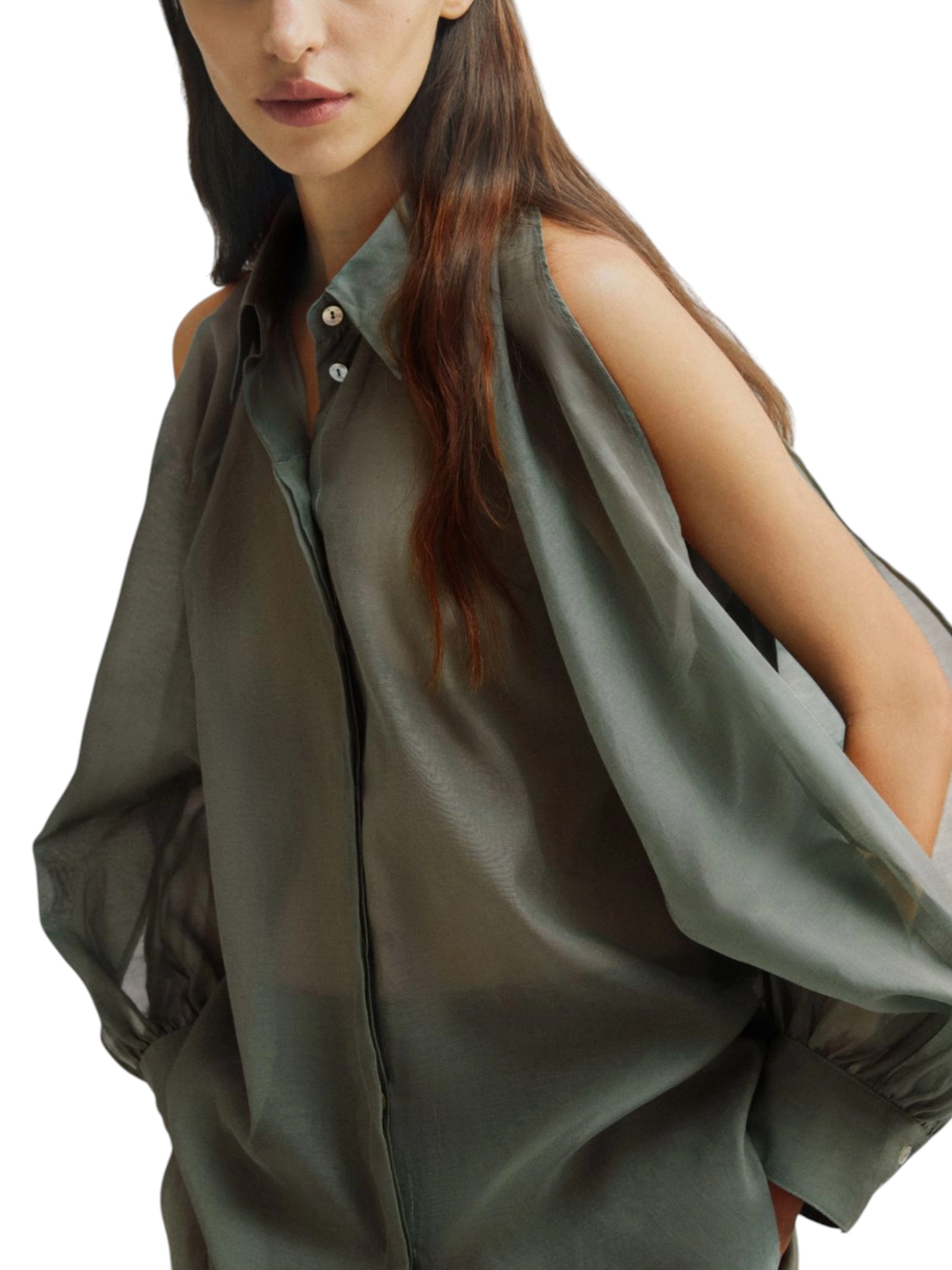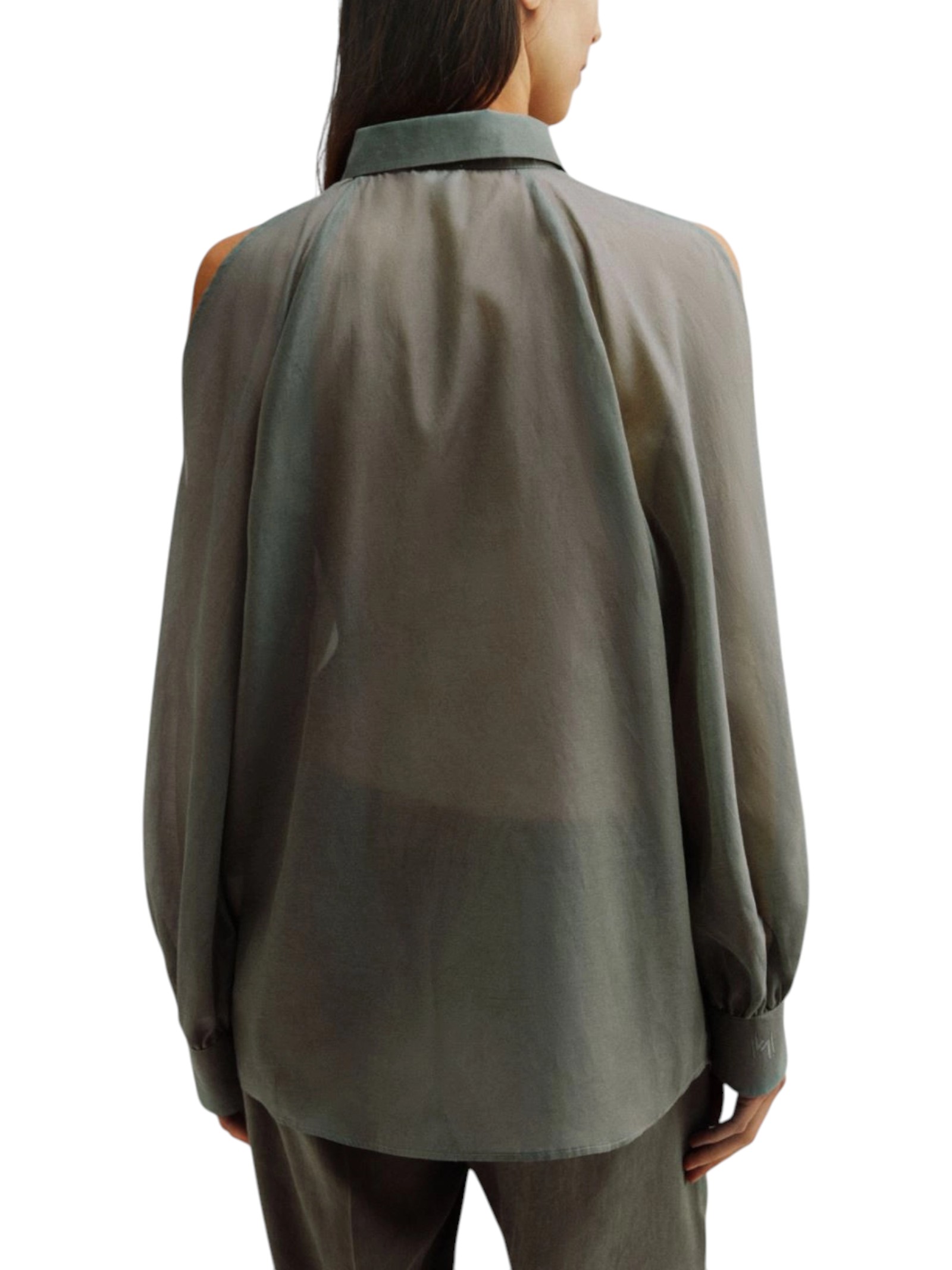 L'eterea leggerezza della mussola, in versione shirt: versatile sopra un top a canotta, ha manica raglan e polsi con arricci per un volume vaporoso.