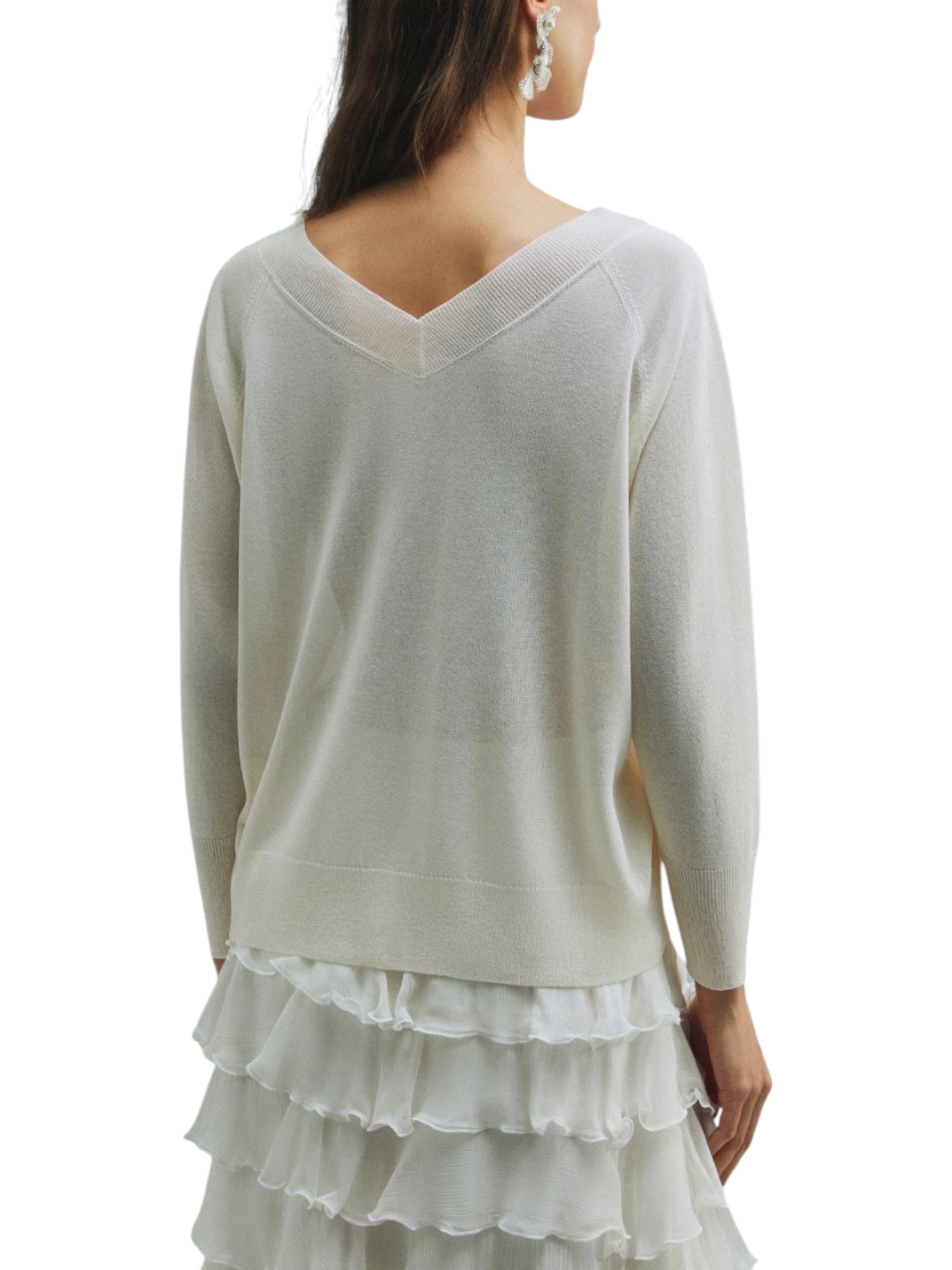 Sono i dettagli a fare la differenza. Come in questa maglia dall'aspetto tulle, mano soffice, superficie da carezzare, un gioco di calature che intercetta lo scollo e lo rende protagonista anche sulla schiena.