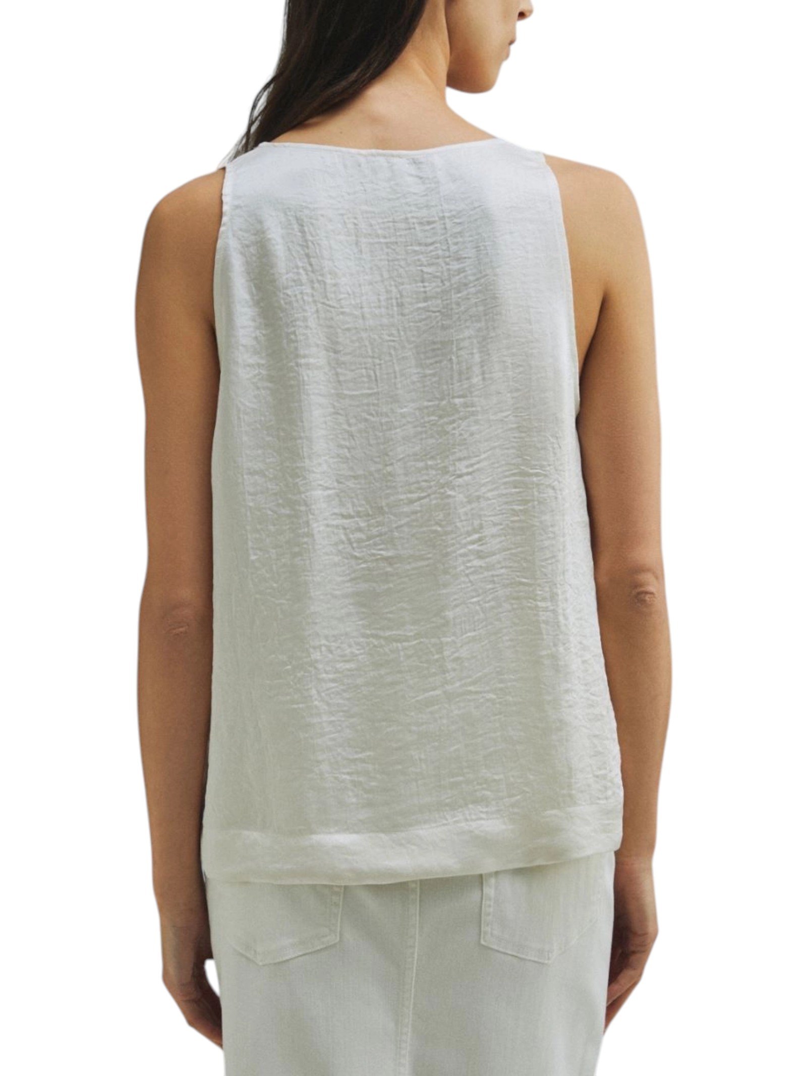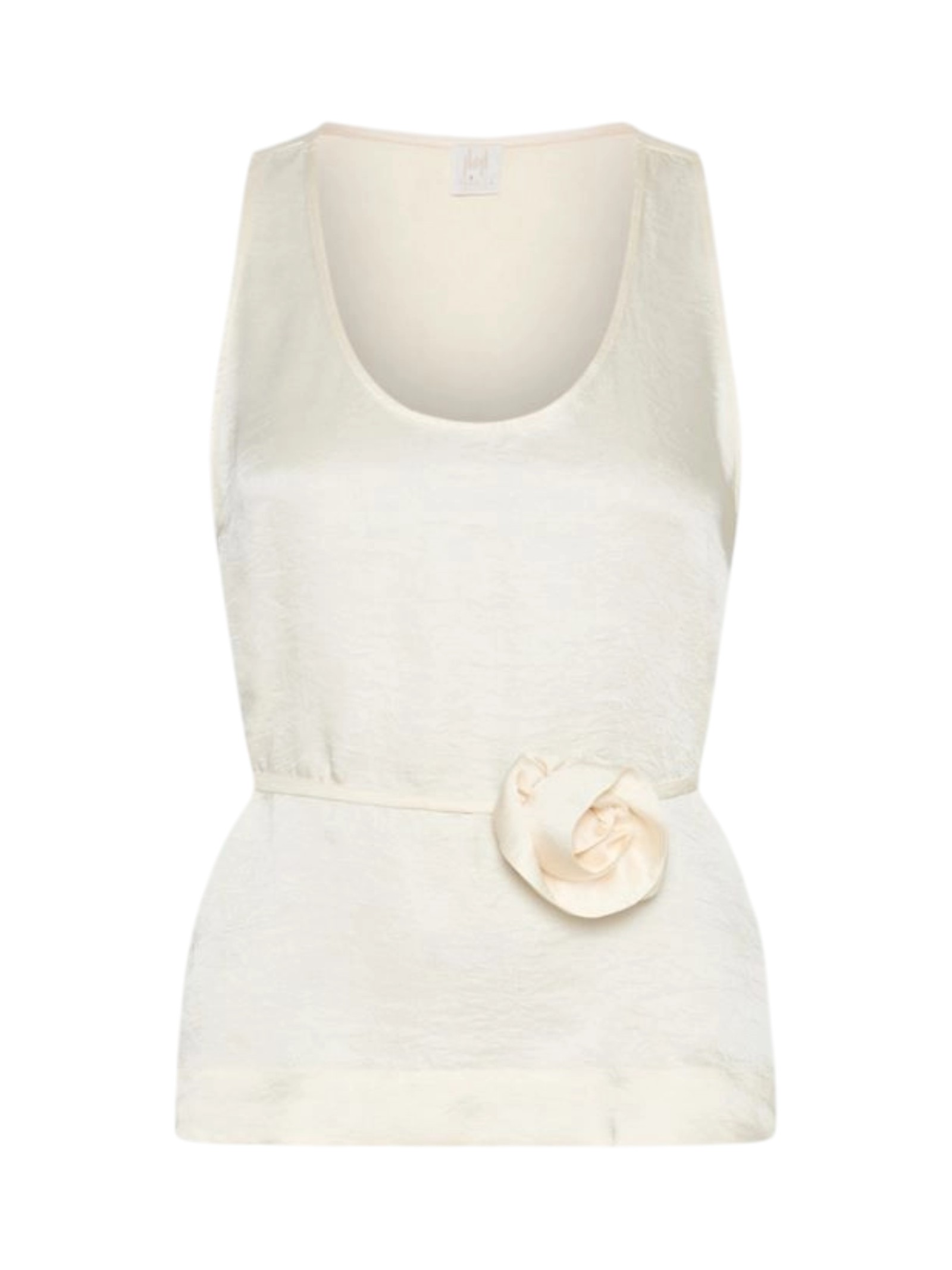 La superficie materica del twill crinckle regala un'allure sofisticata a questo top. Da completare con fiore in tessuto da annodare al collo o in vita, in un gioco di dettagli romantici.