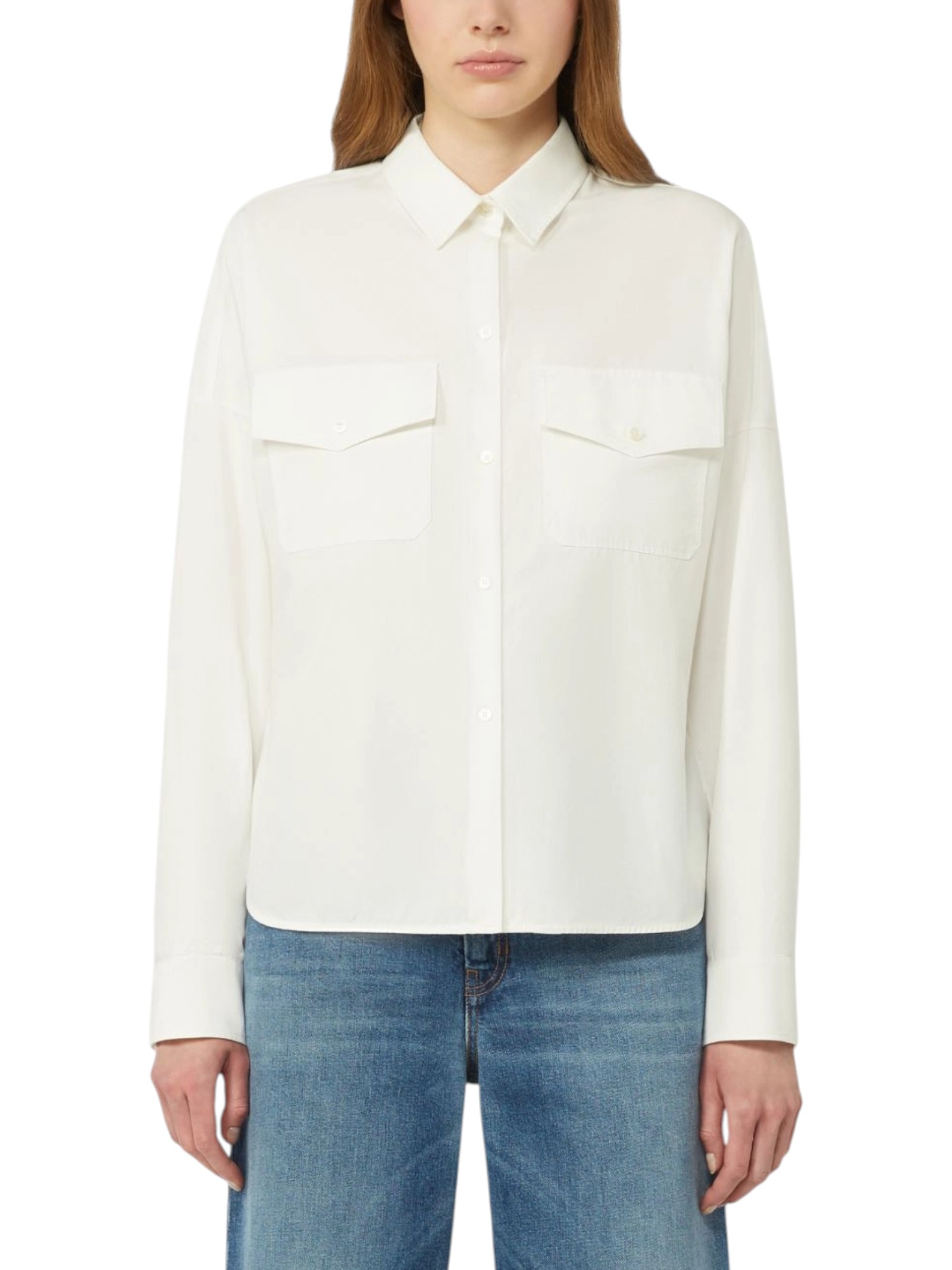 Camicia dalla linea leggermente sfiancata con pince cucite in vita sul retro e piccolo logo a farfalla ricamato al fondo sul davanti.