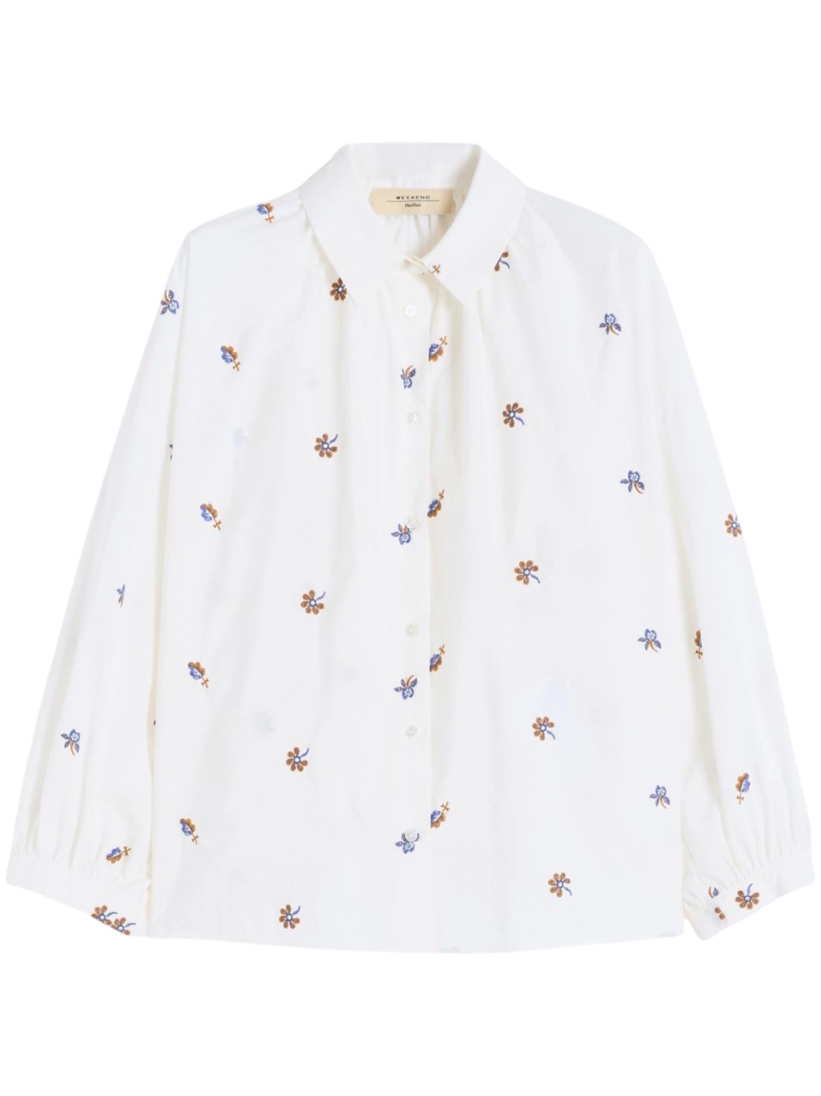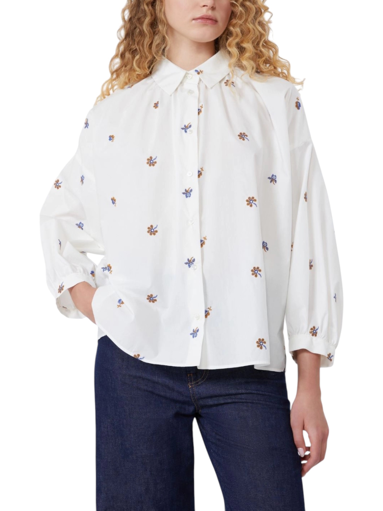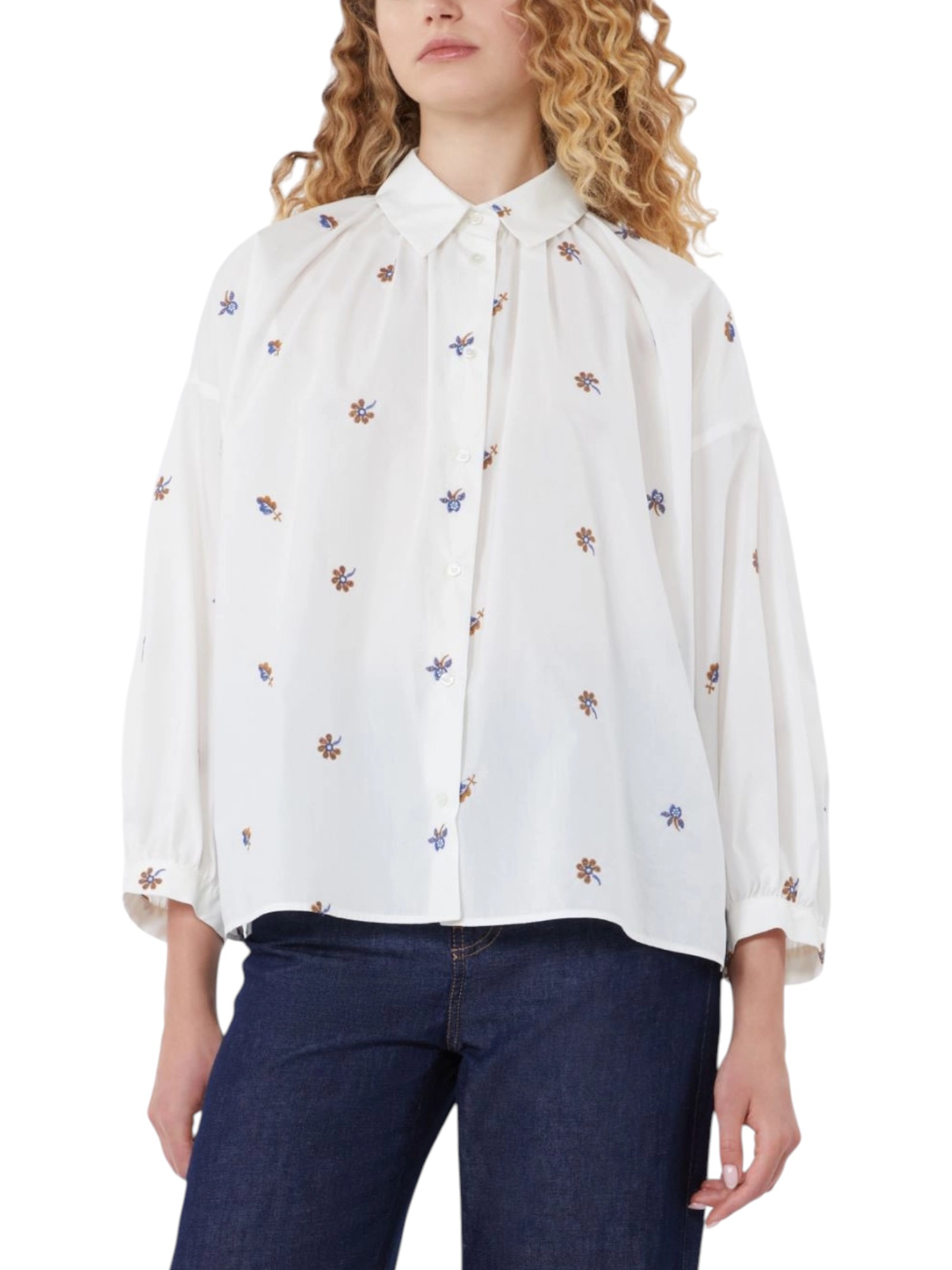 Camicia con maniche a sbuffo, rifinita da piccoli ricami all over e dettagli arricciati sul collo e fondo manica.