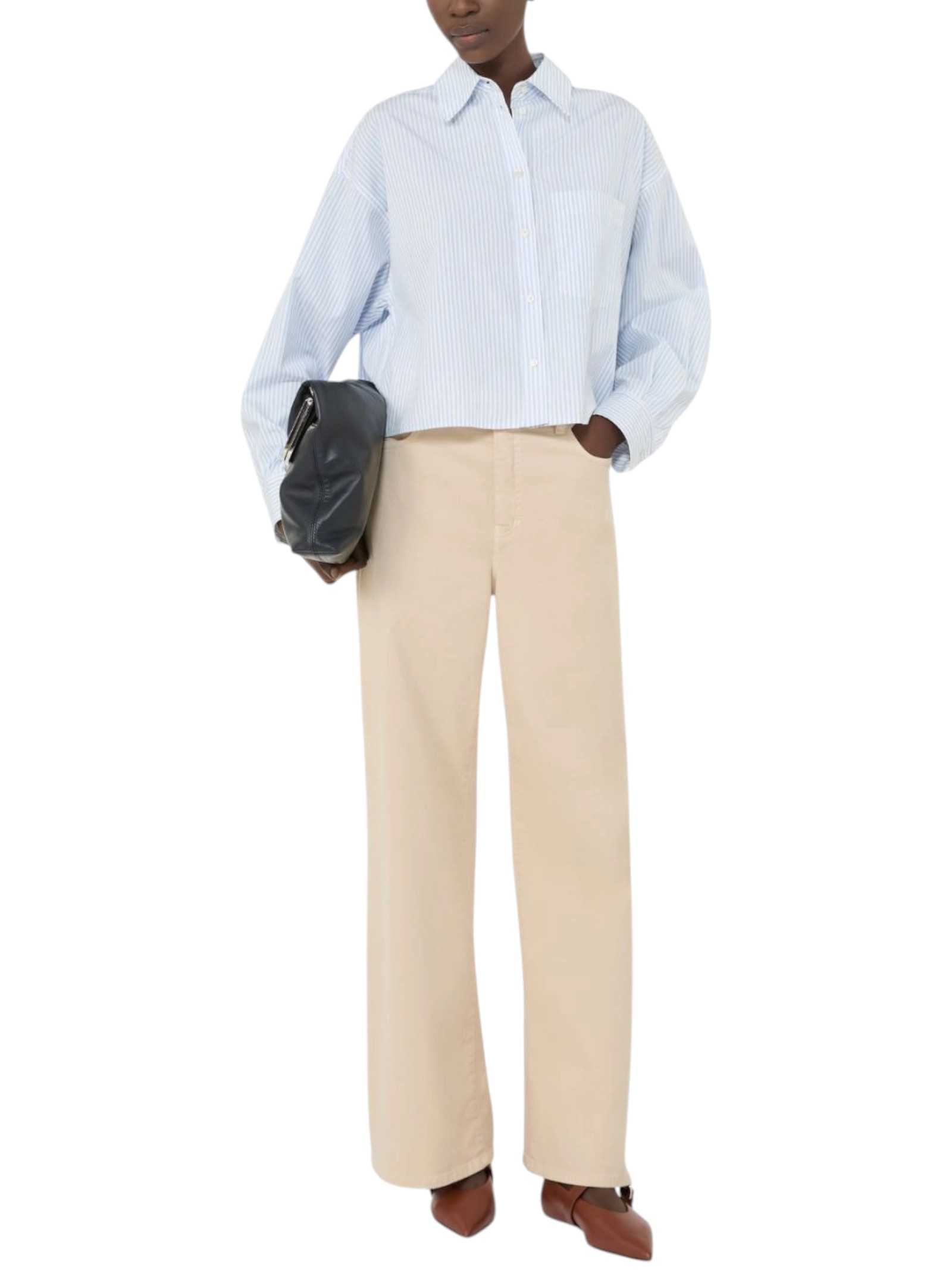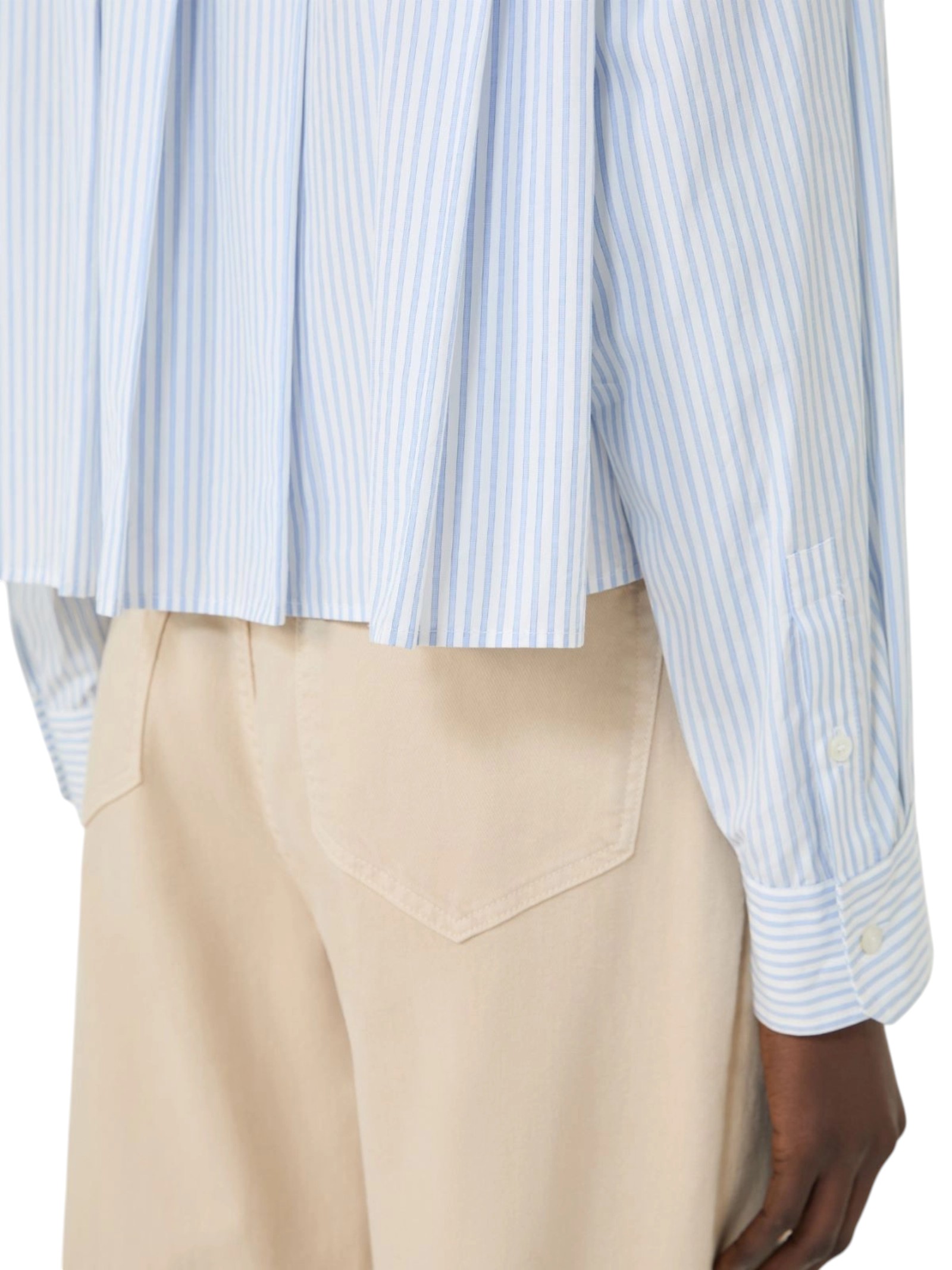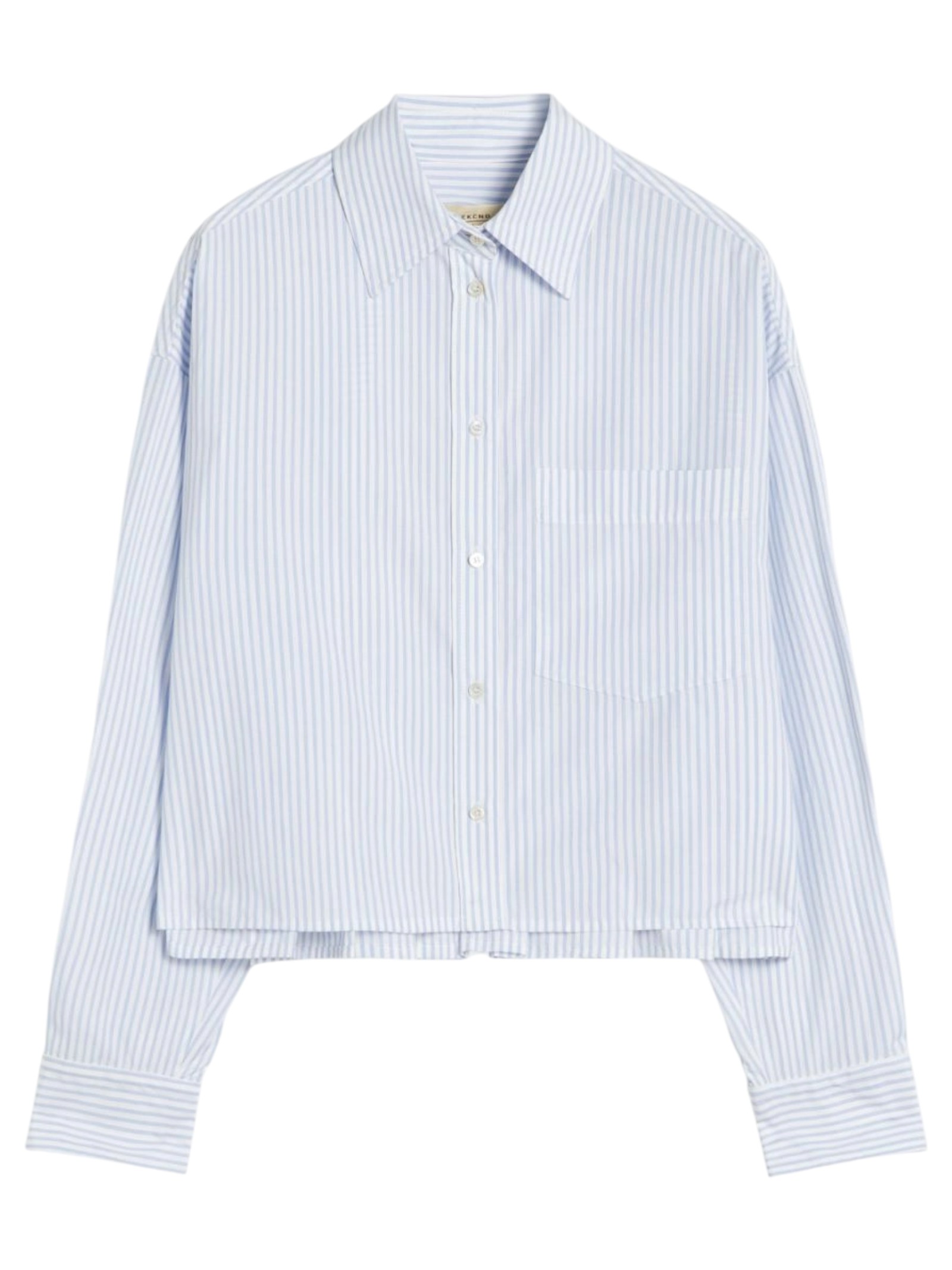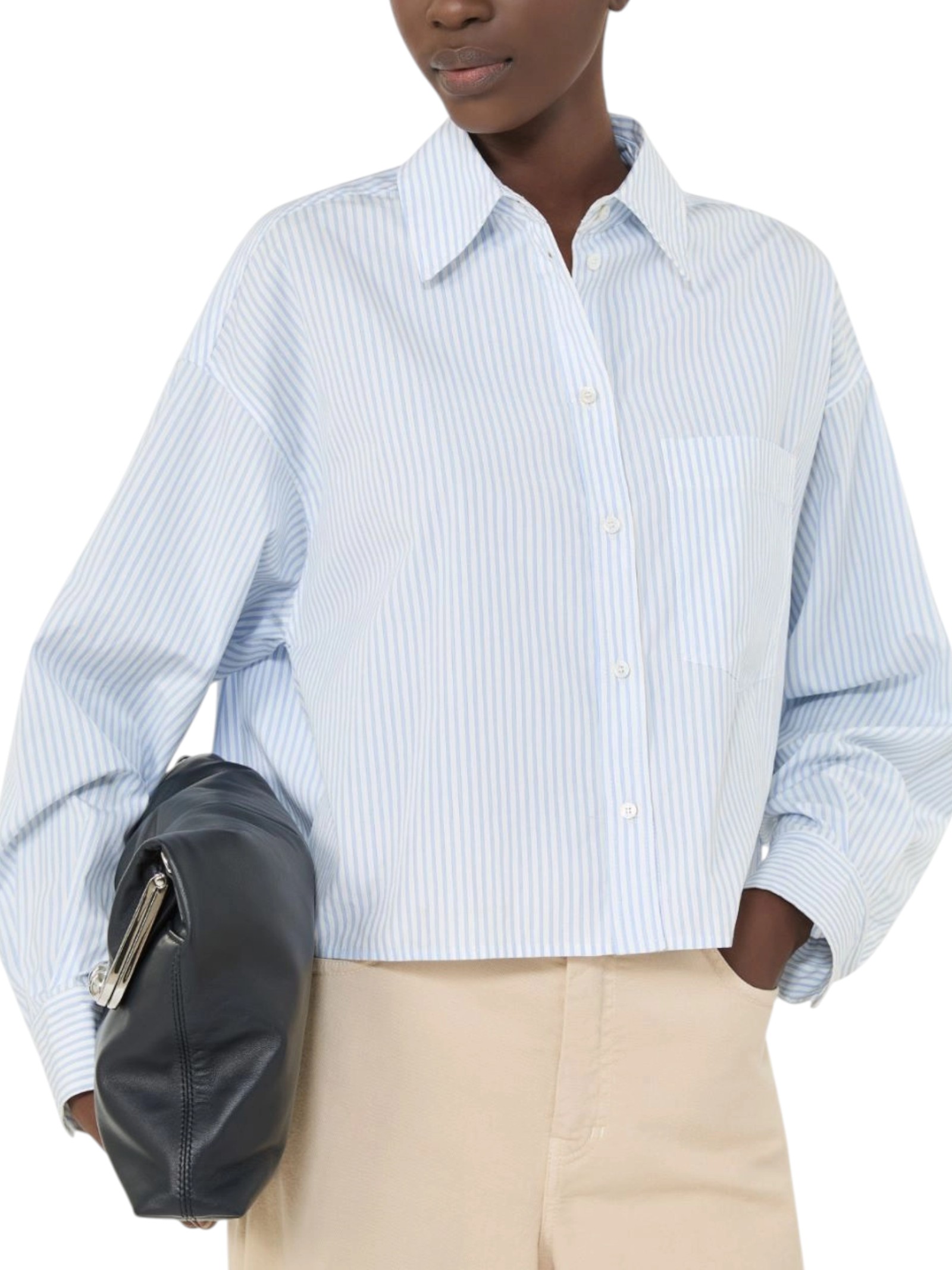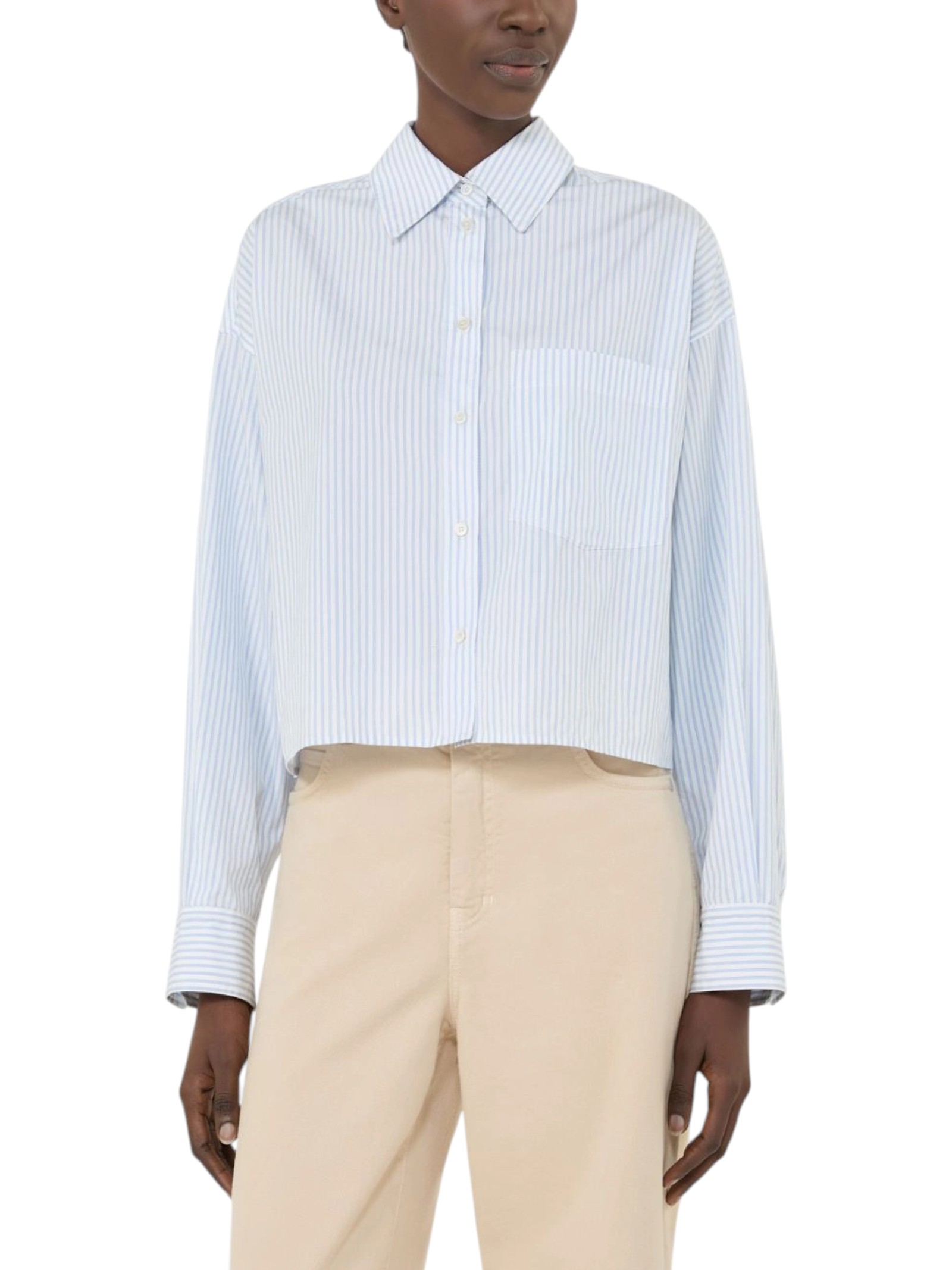 Camicia crop d'ispirazione classica con motivo a pieghe sul retro e taschino sinistro applicato sul petto.