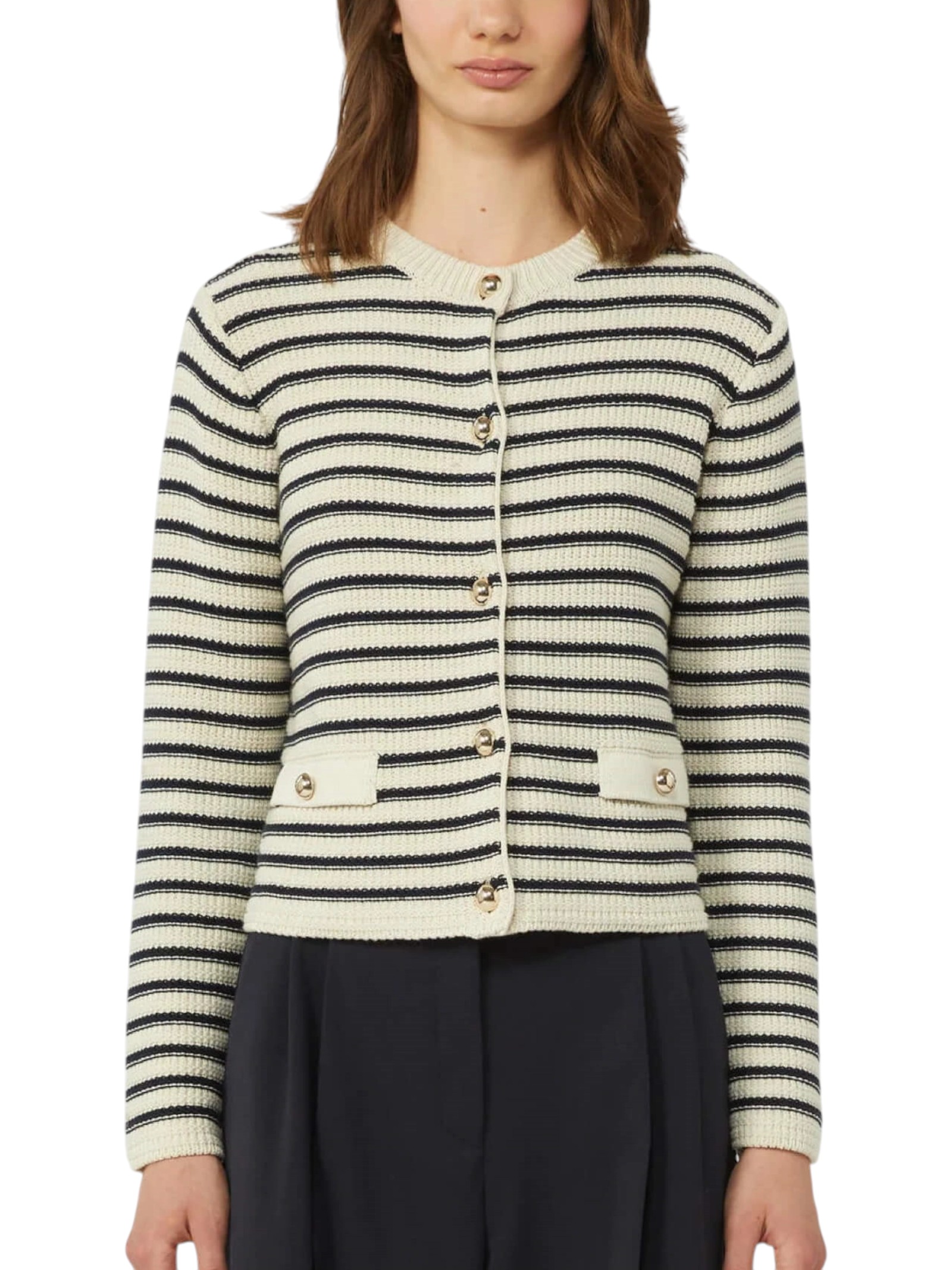 Chiusura frontale con bottoni bombati in metallo