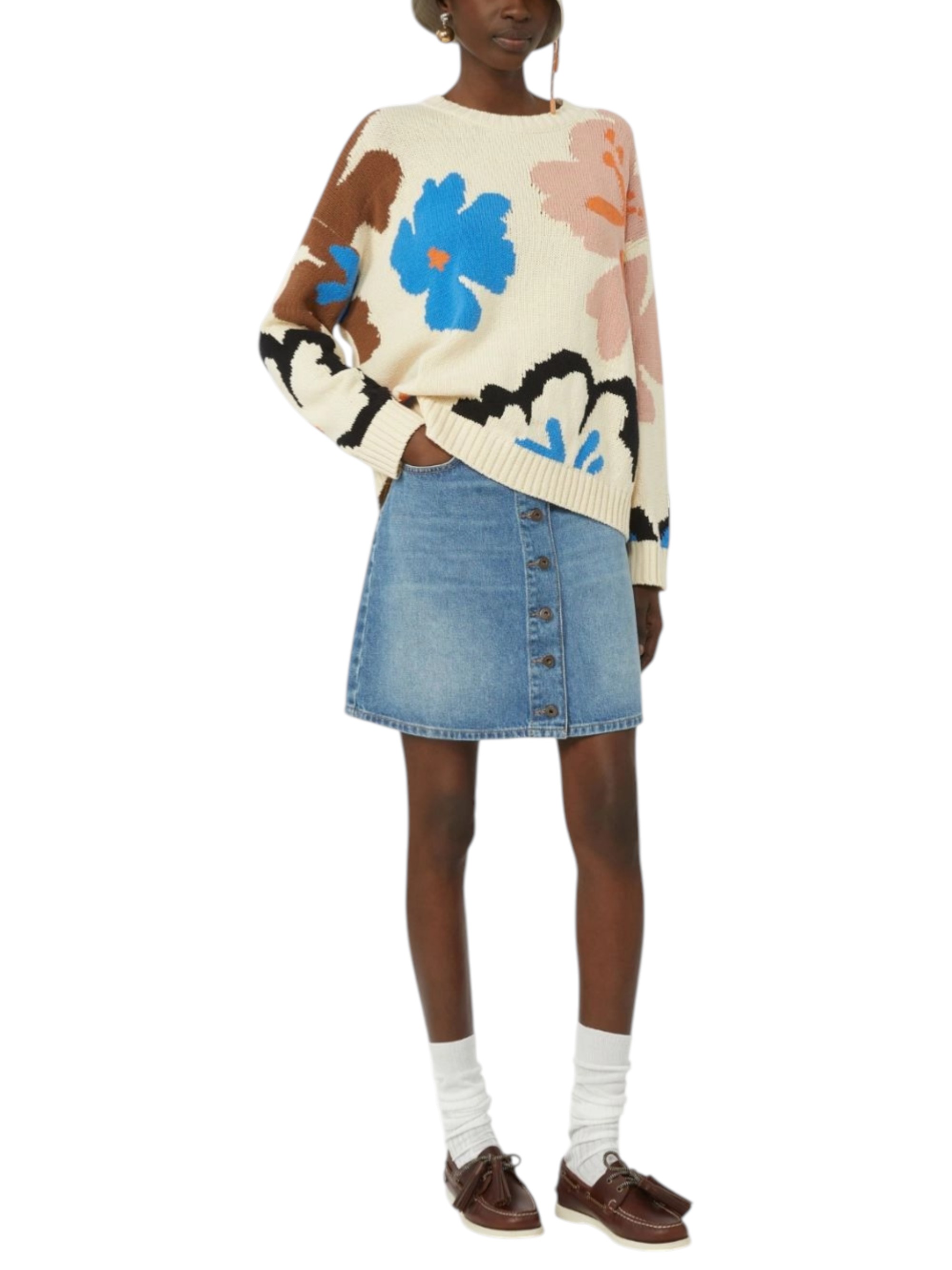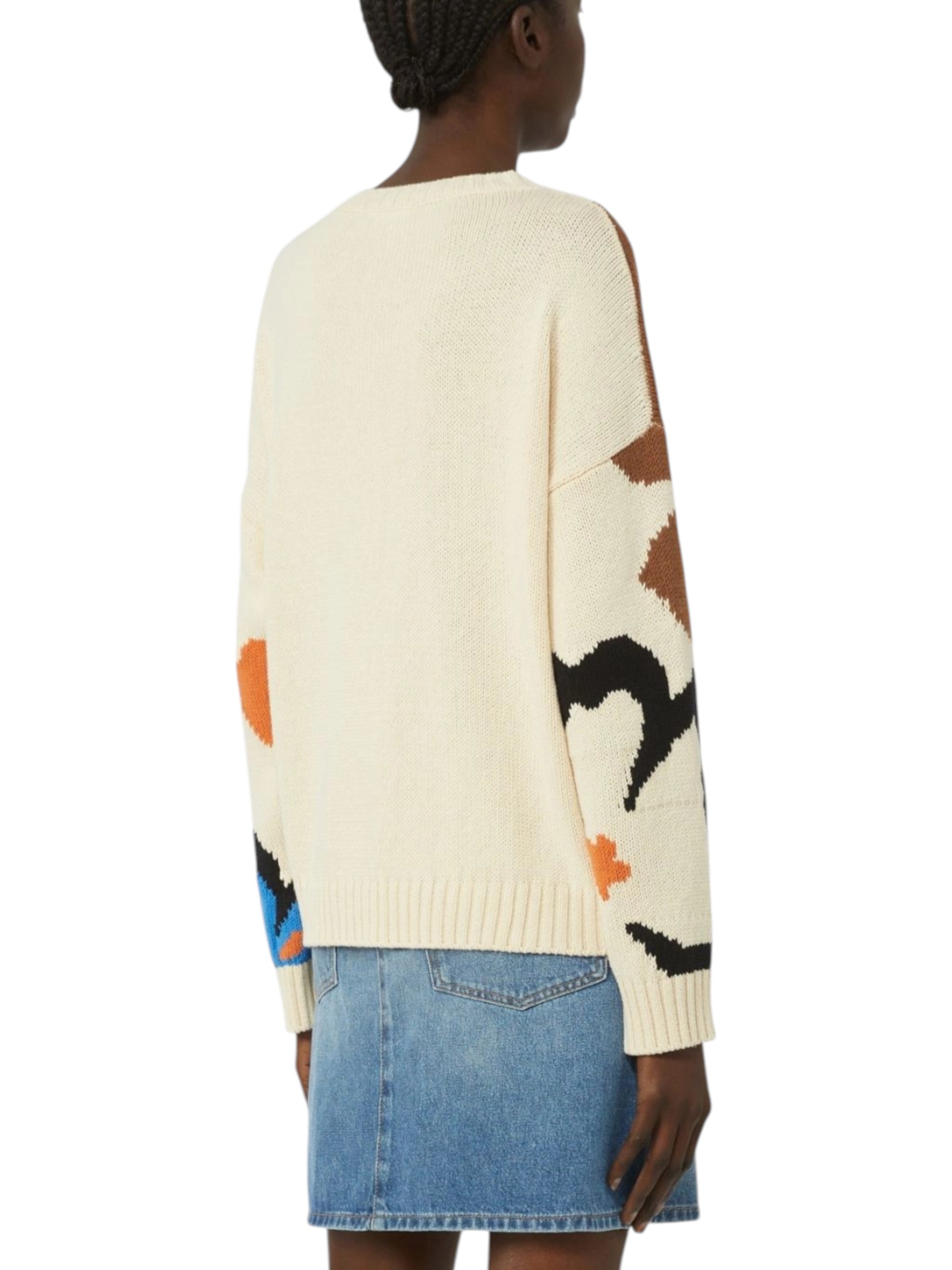 Maglia girocollo, personalizzata con motivo fantasia intarsiato all over.