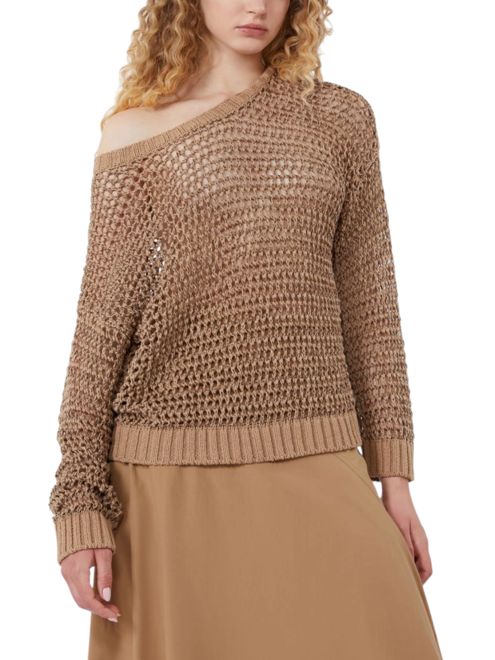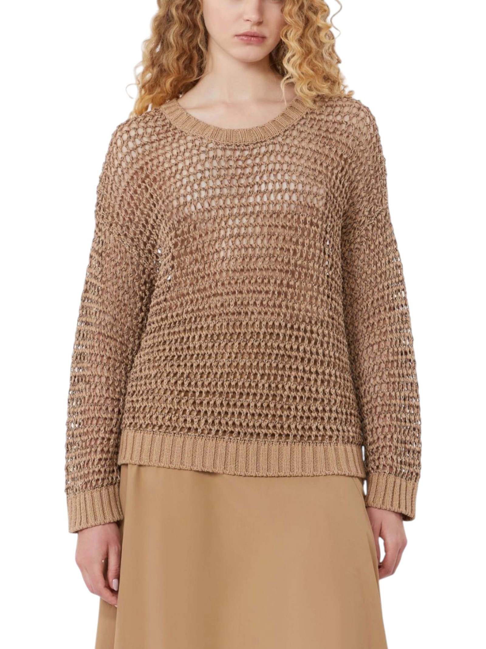 Maglia dal volume morbido, caratterizzata da una lavorazione a rete effetto see-through.