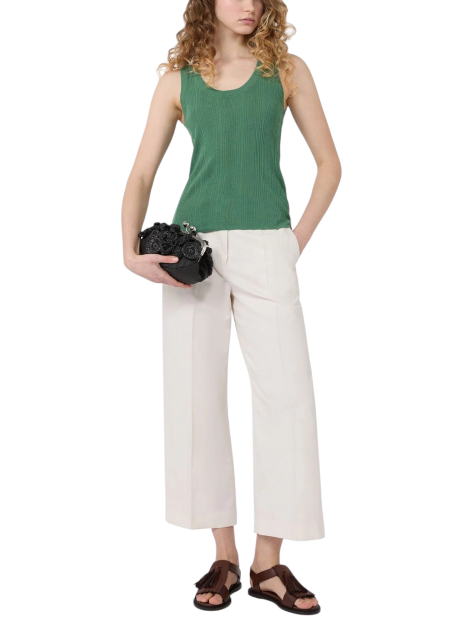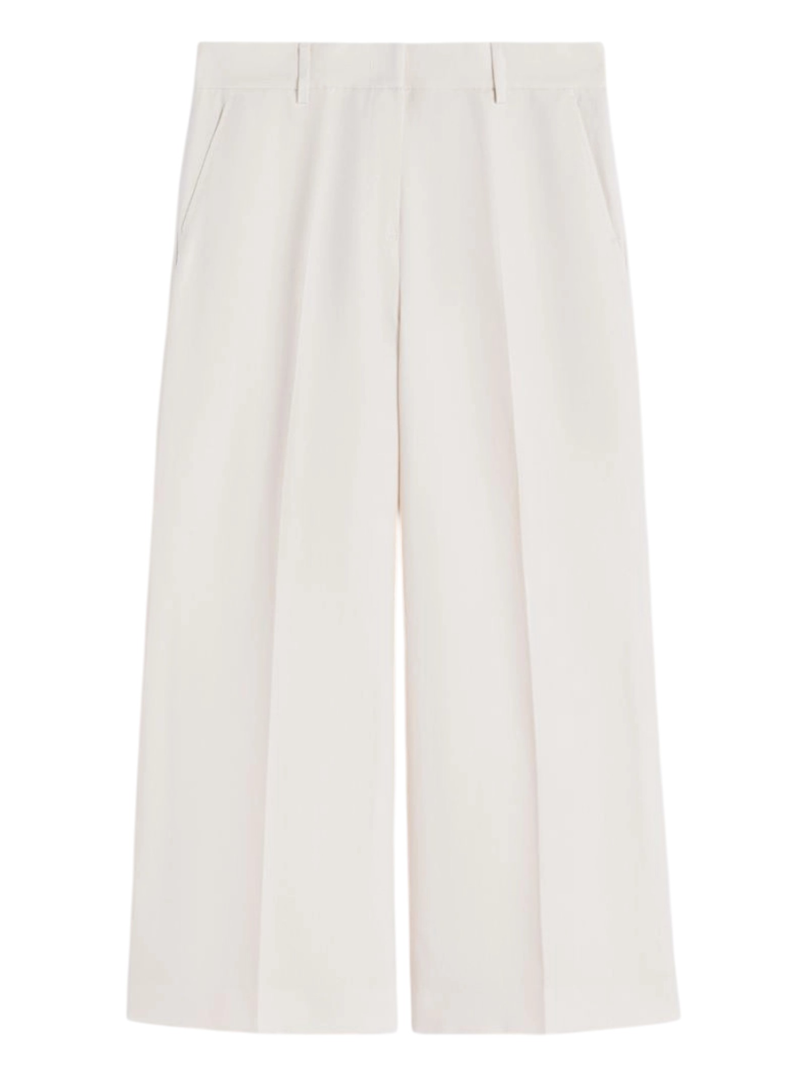 Pantalone caratterizzato da taglio cropped sopra la caviglia e gamba larga.