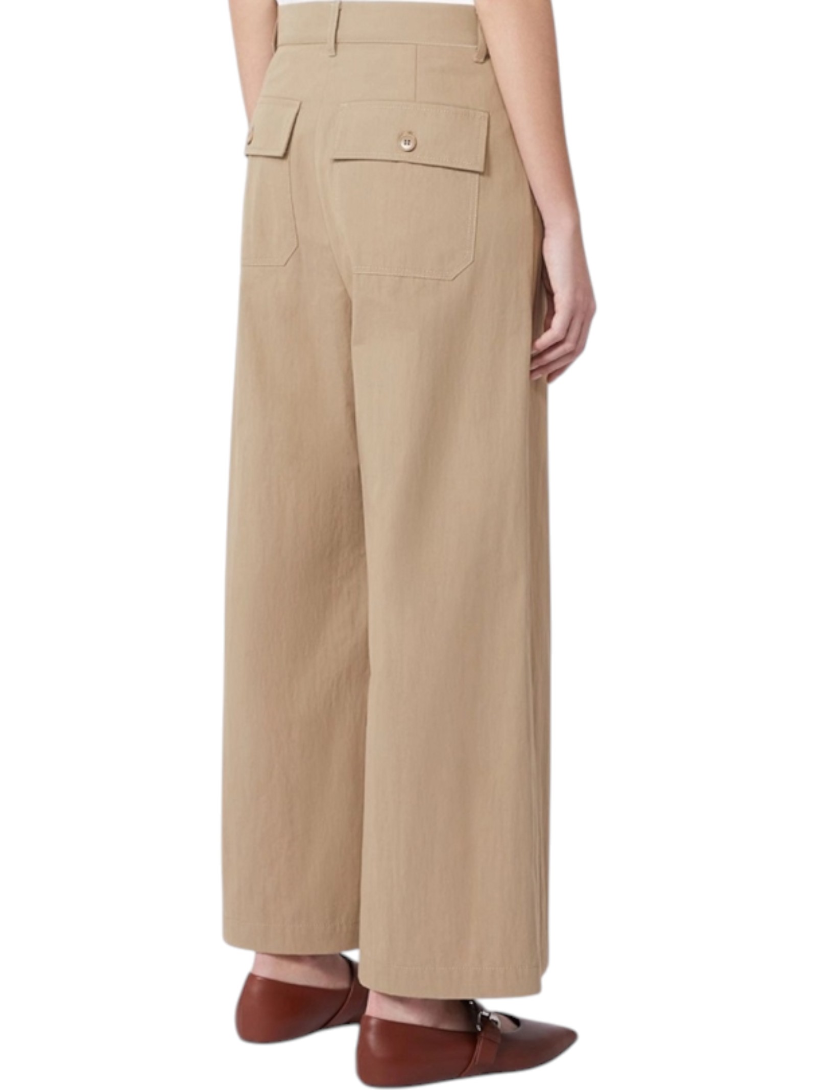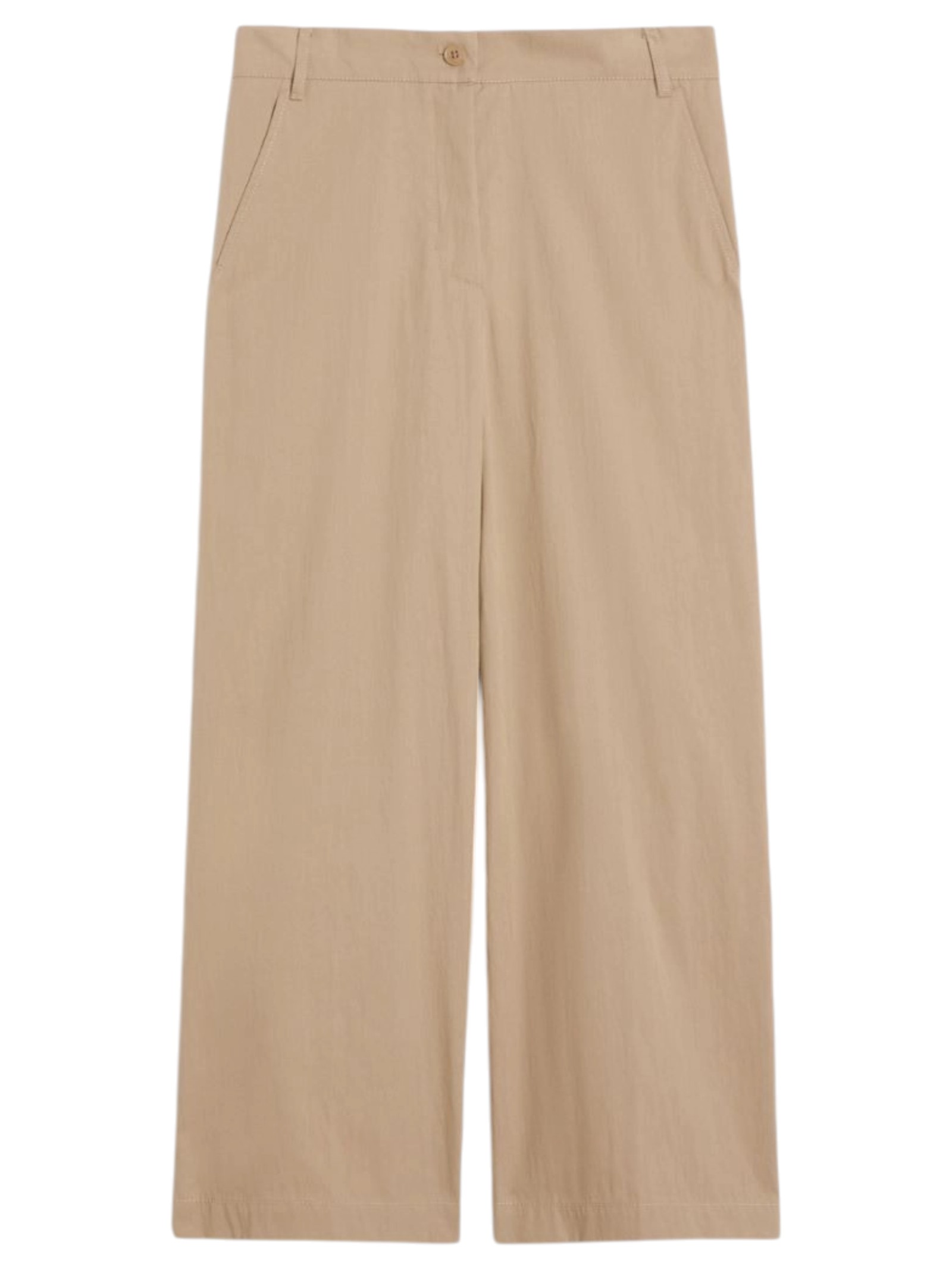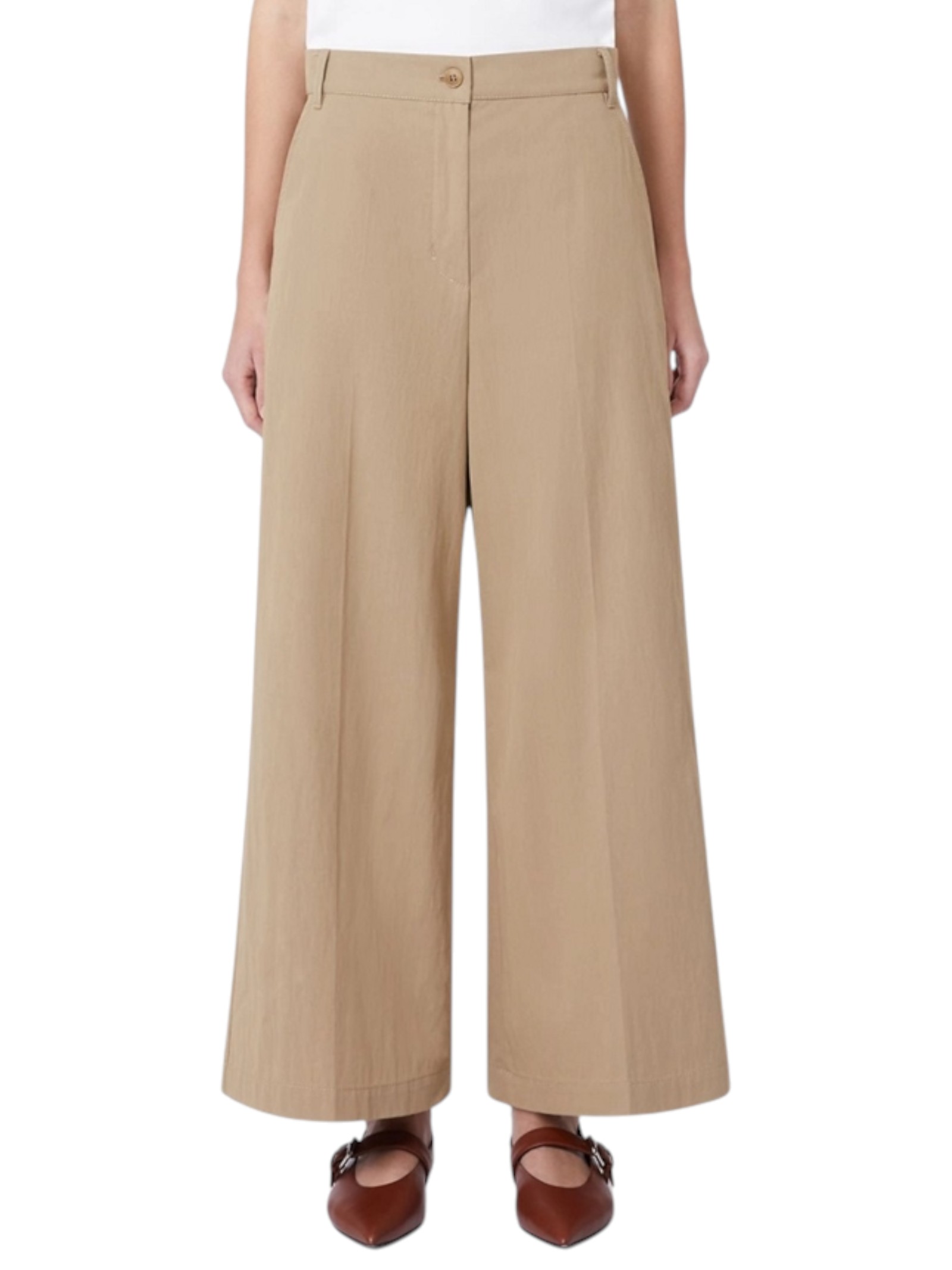 Pantalone wide leg con taglio cropped alla caviglia e piega stirata.