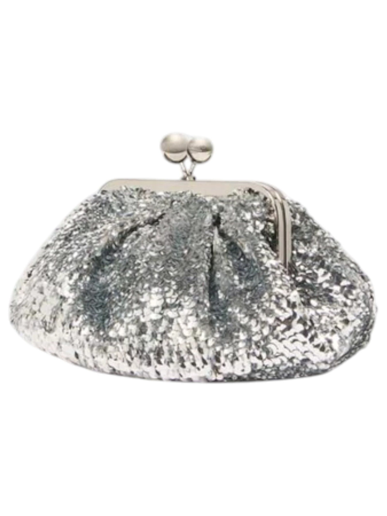 Borsa in raso interamente ricoperta da paillettes concave sagomate