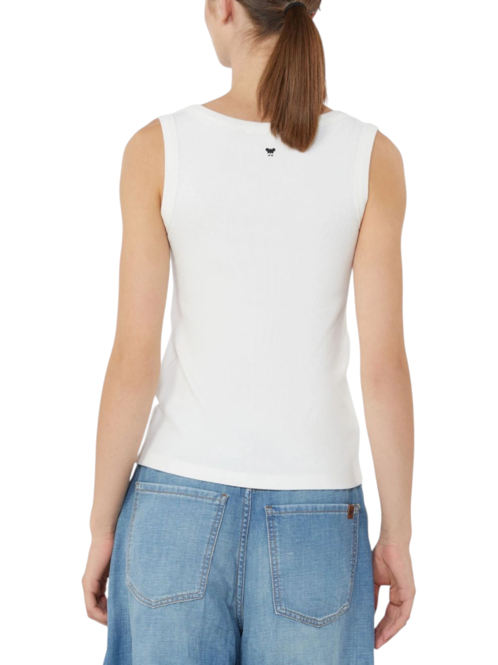 Top smanicato lavorato a costine, personalizzato da logo a farfalla sul retro del collo.